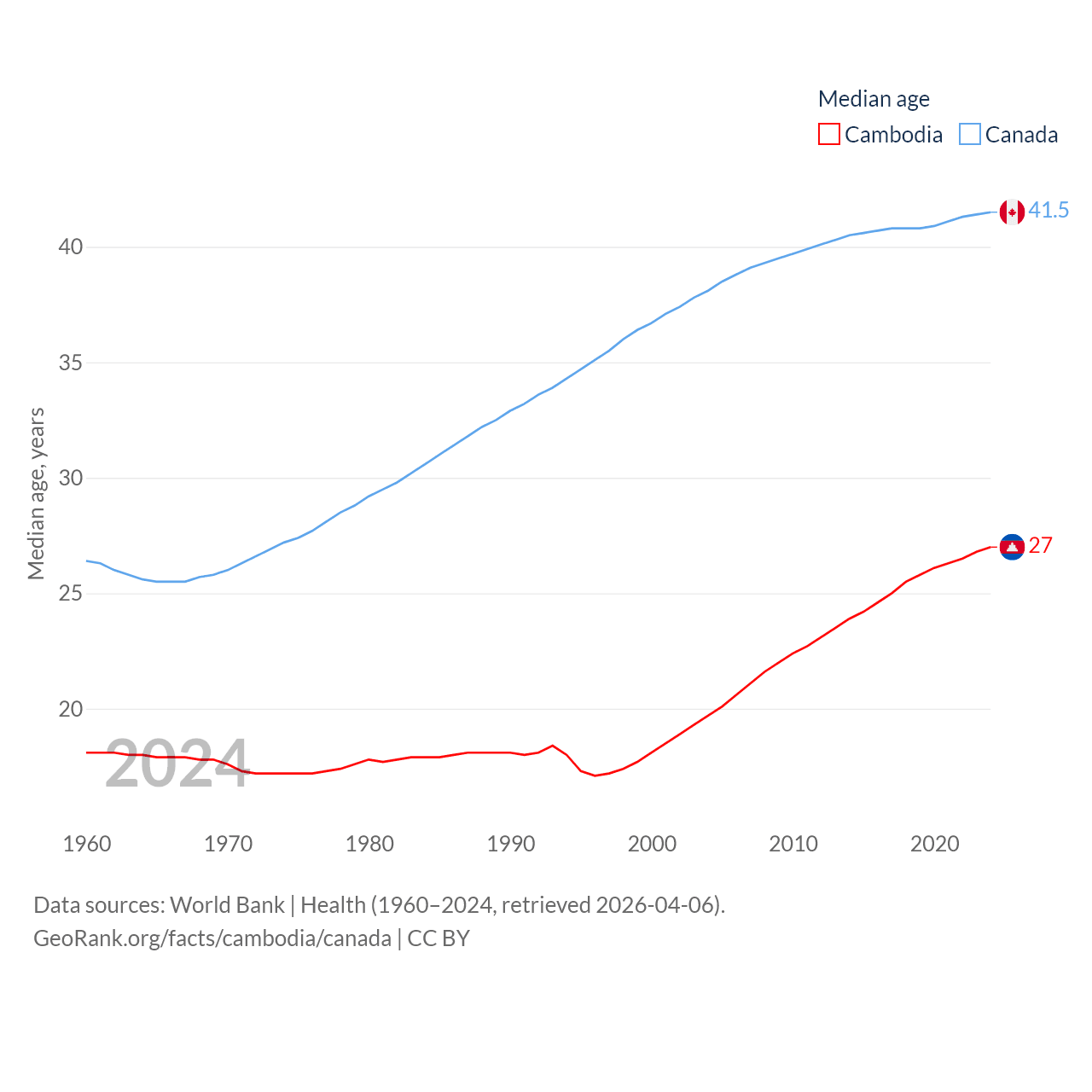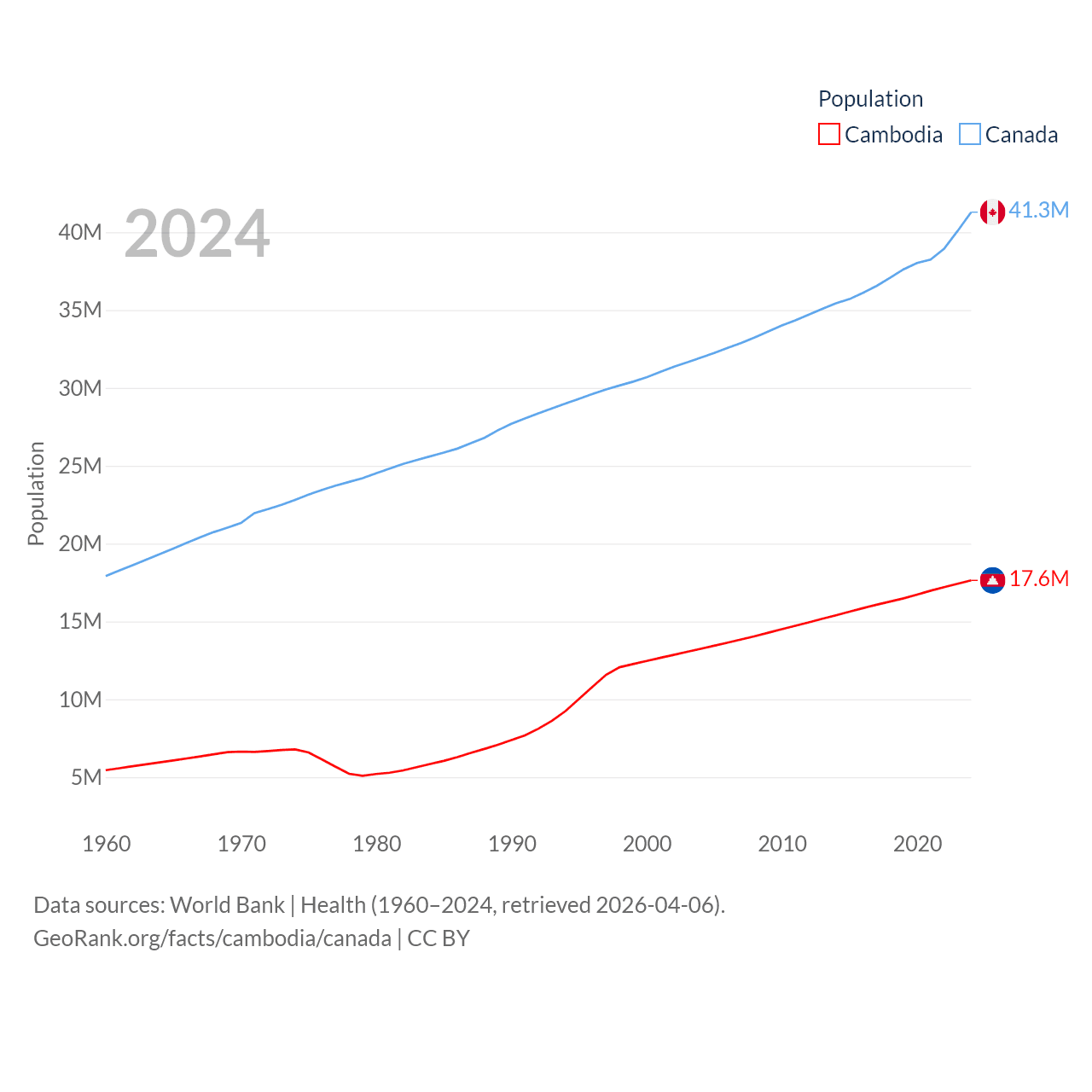 Cambodia has a population of 17.6M (ranked 73/197), compared with 41.3M in Canada (ranked 37/197). Cambodia's land area is 68,155 sq mi versus 3,393,336 sq mi for Canada (ranked 88th vs. 4th).