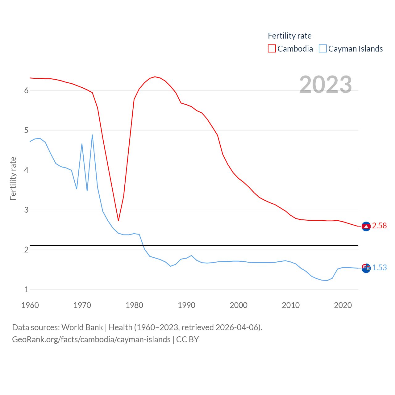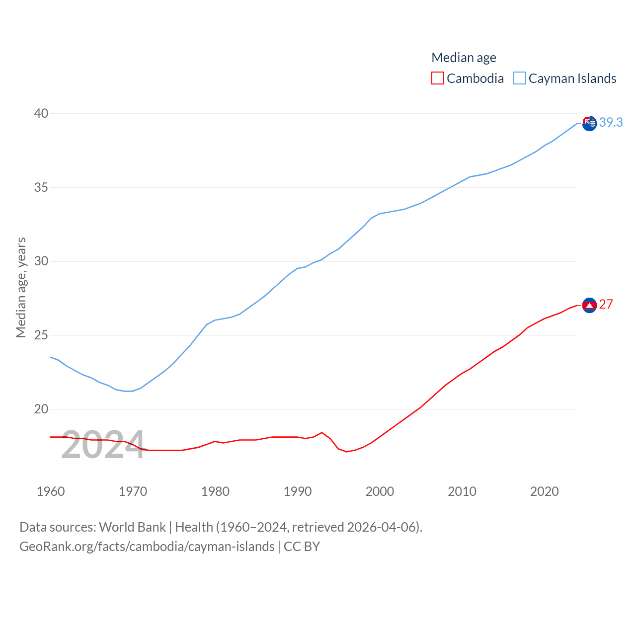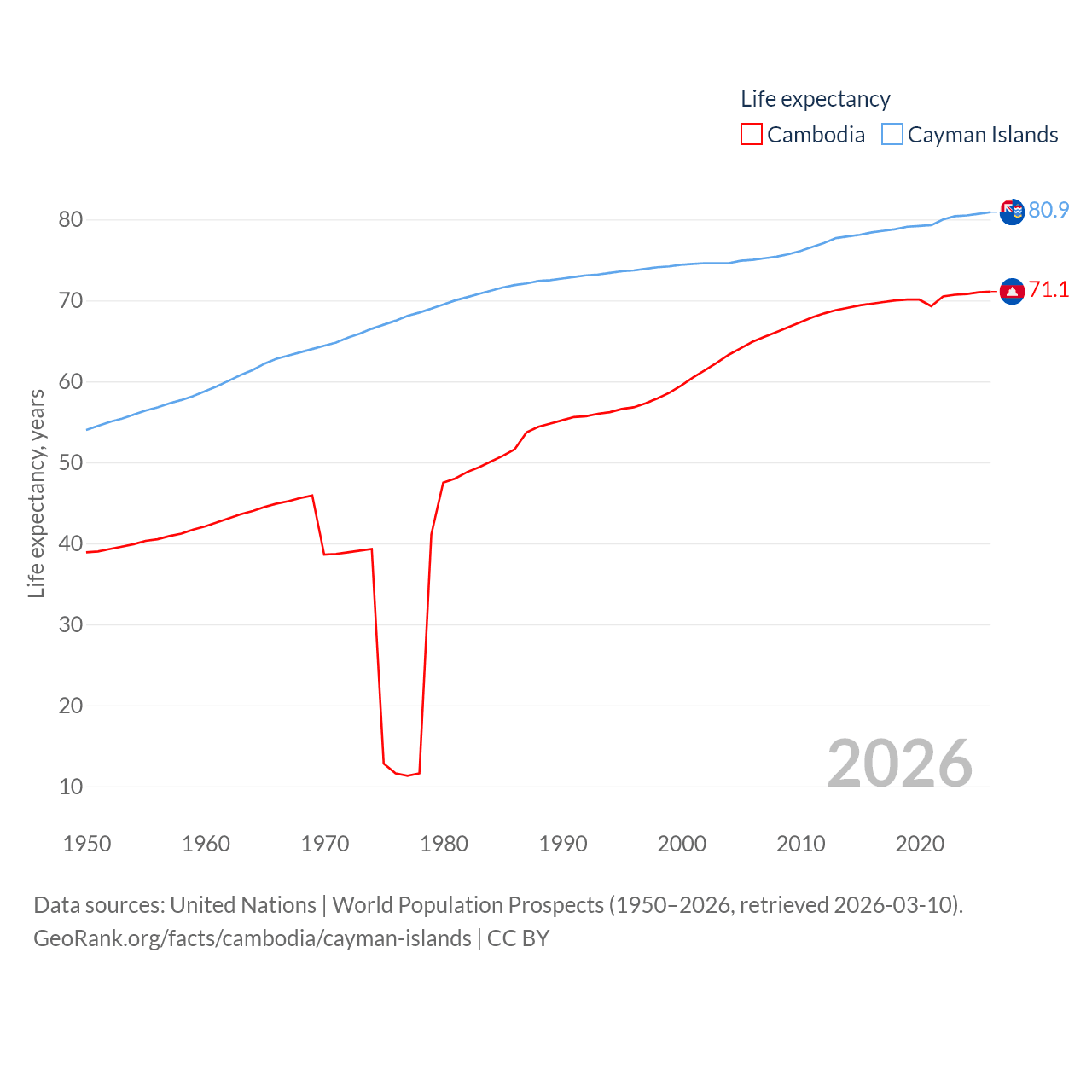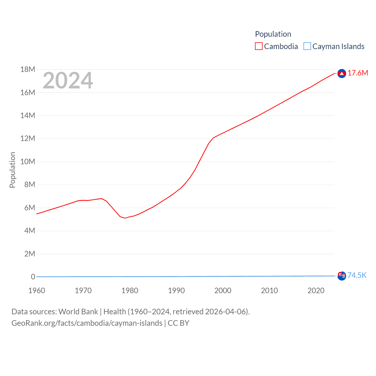 Cambodia has a population of 17.6M (ranked 73/197), compared with 74.5K in The Cayman Islands (ranked 187/197). Cambodia's land area is 68,155 sq mi versus 92.7 sq mi for The Cayman Islands (ranked 88th vs. 190th).