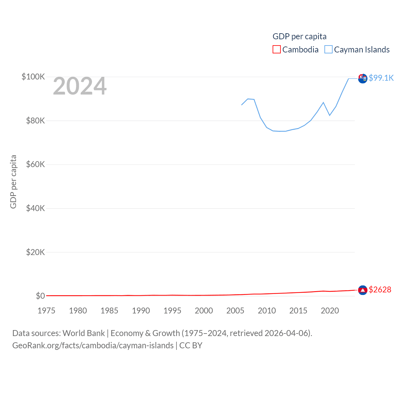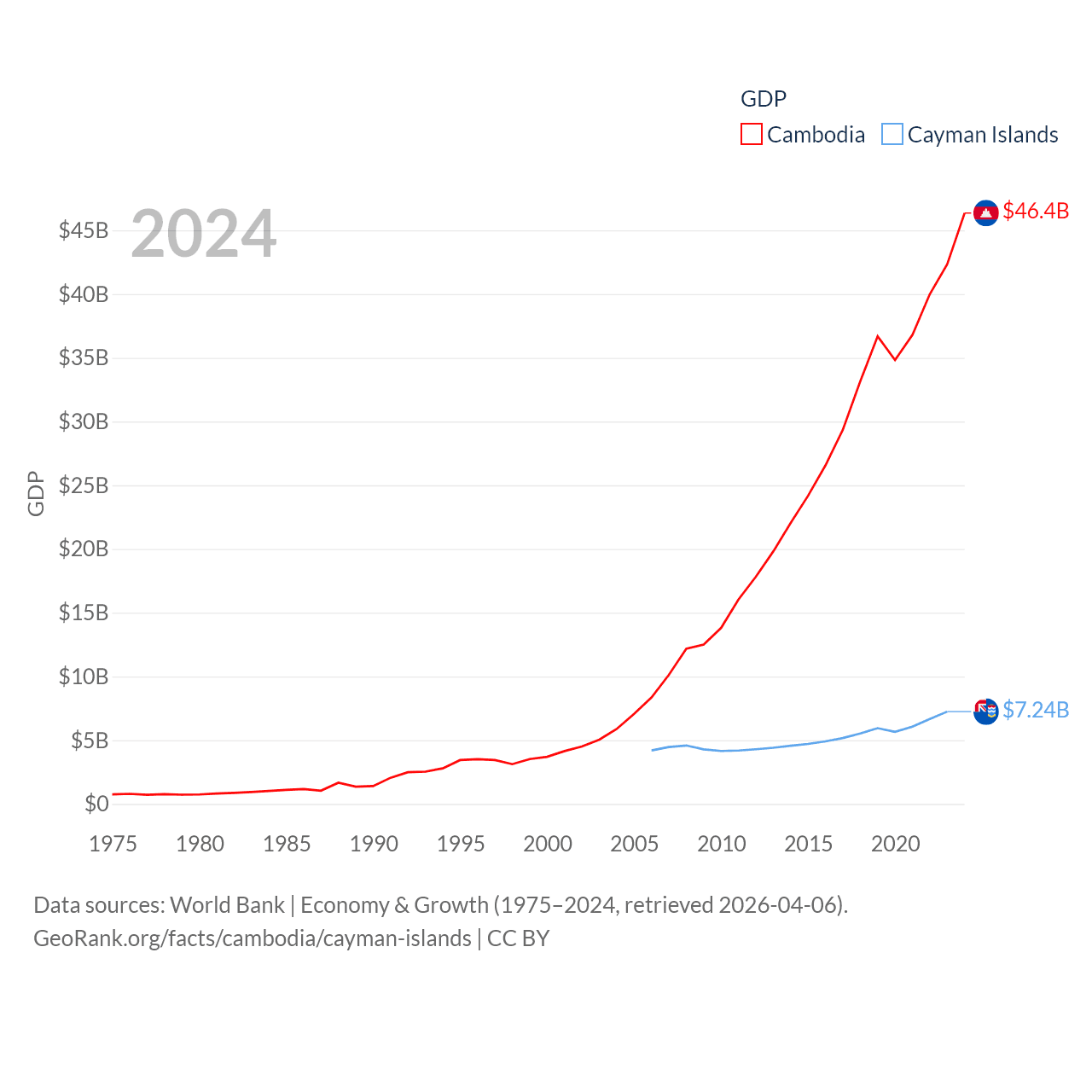 By GDP, Cambodia ranks 97/197 ($46.4B) and The Cayman Islands ranks 158/197 ($7.24B). By GDP per capita, Cambodia ranks 145/197 ($2,628), while The Cayman Islands ranks 6/197 ($99,144).