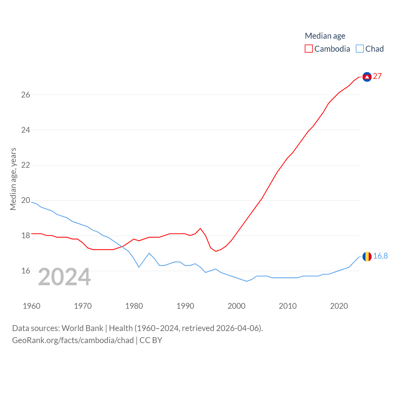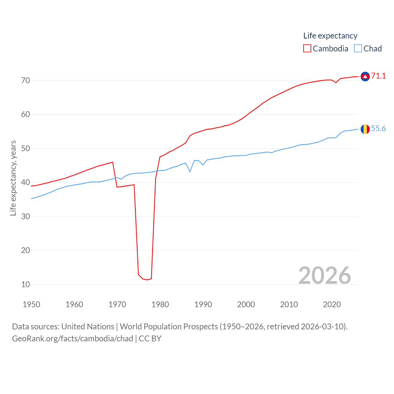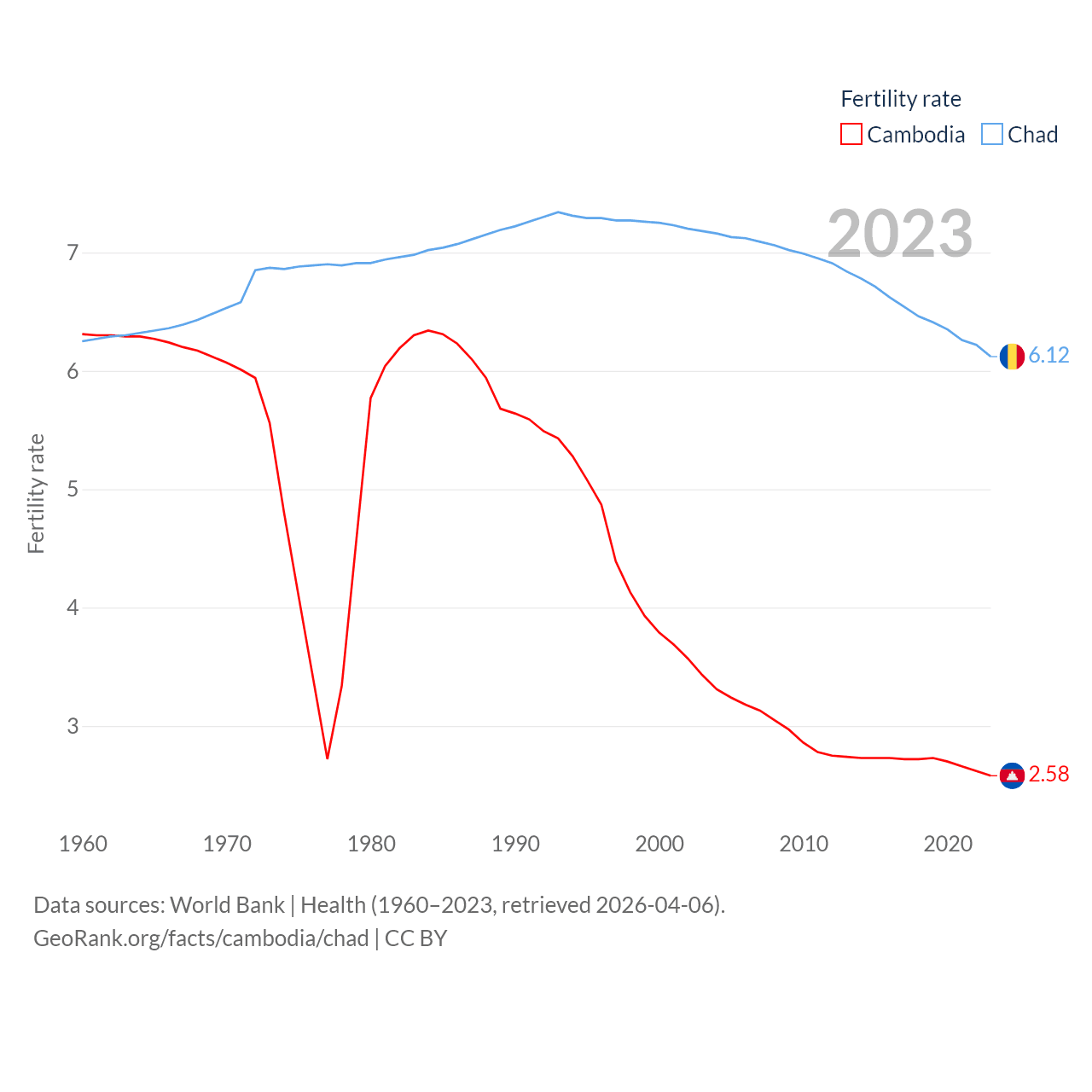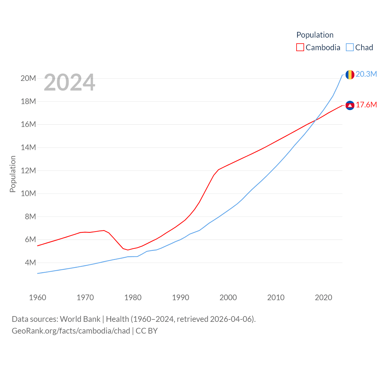 Cambodia has a population of 17.6M (ranked 73/197), compared with 20.3M in Chad (ranked 65/197). Cambodia's land area is 68,155 sq mi versus 486,180 sq mi for Chad (ranked 88th vs. 21st).