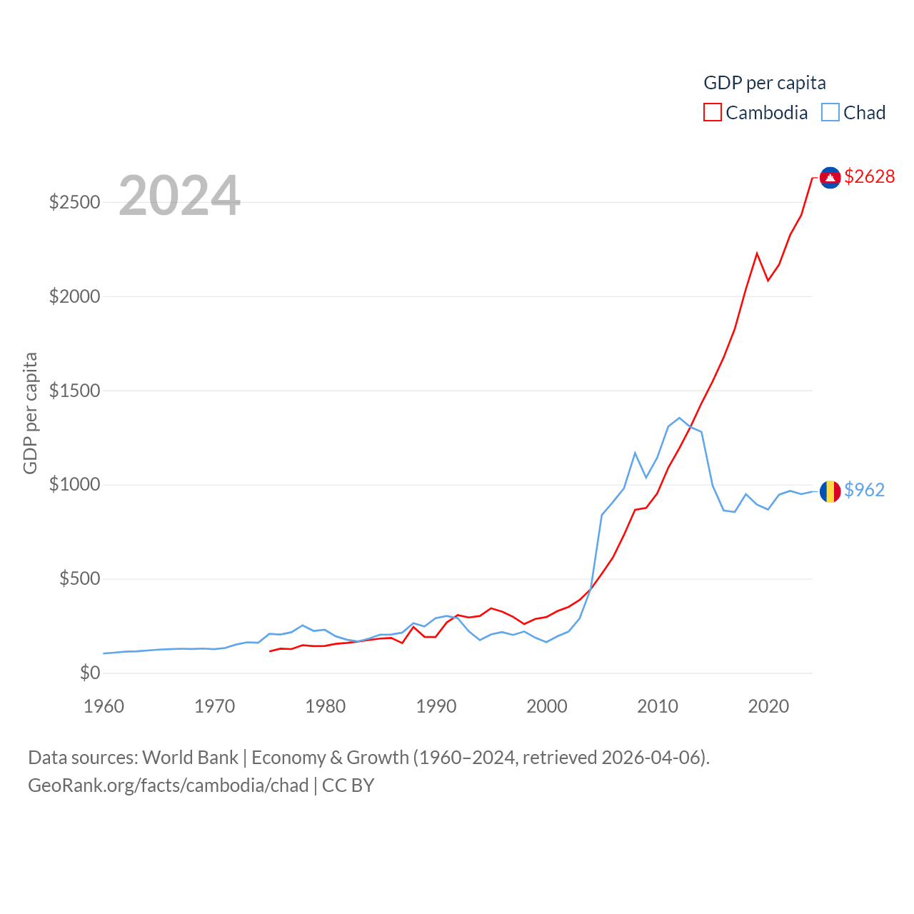 By GDP, Cambodia ranks 97/197 ($46.4B) and Chad ranks 132/197 ($19.5B). By GDP per capita, Cambodia ranks 145/197 ($2,628), while Chad ranks 182/197 ($962).