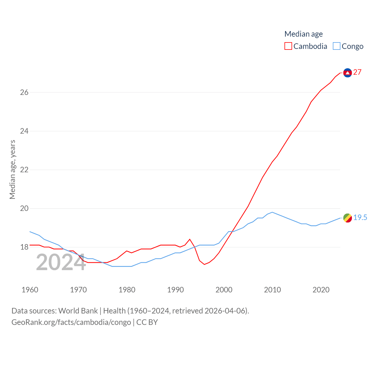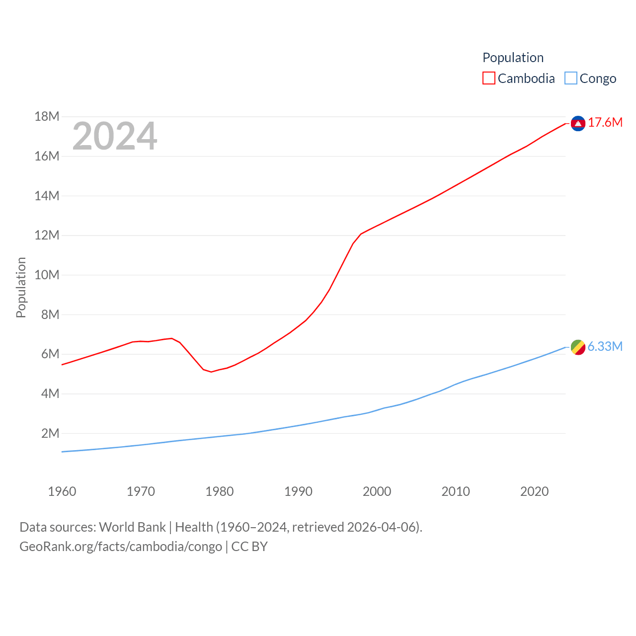 Cambodia has a population of 17.6M (ranked 73/197), compared with 6.33M in The Congo (ranked 112/197). Cambodia's land area is 68,155 sq mi versus 131,854 sq mi for The Congo (ranked 88th vs. 64th).