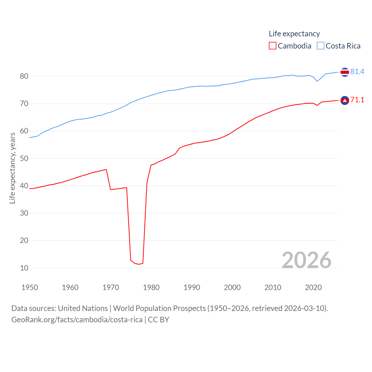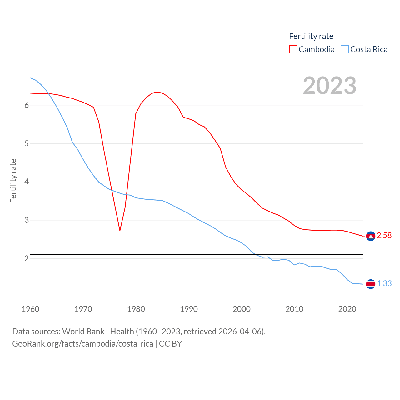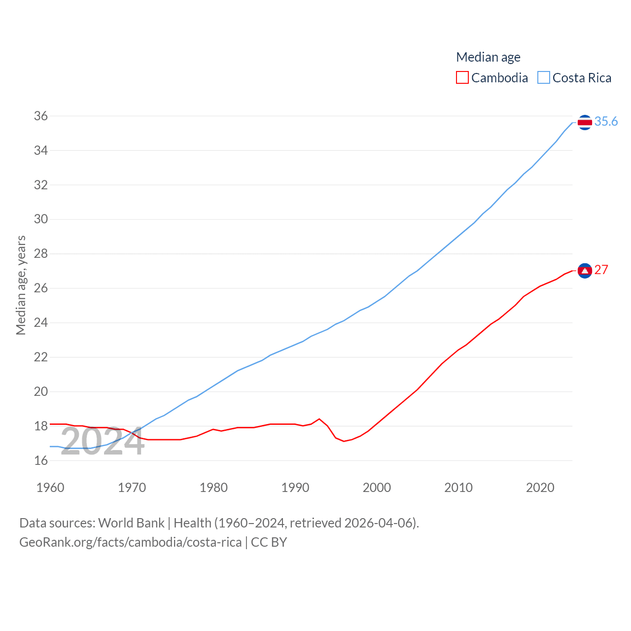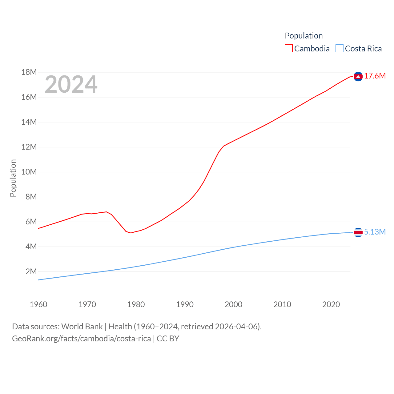 Cambodia has a population of 17.6M (ranked 73/197), compared with 5.13M in Costa Rica (ranked 126/197). Cambodia's land area is 68,155 sq mi versus 19,714 sq mi for Costa Rica (ranked 88th vs. 126th).