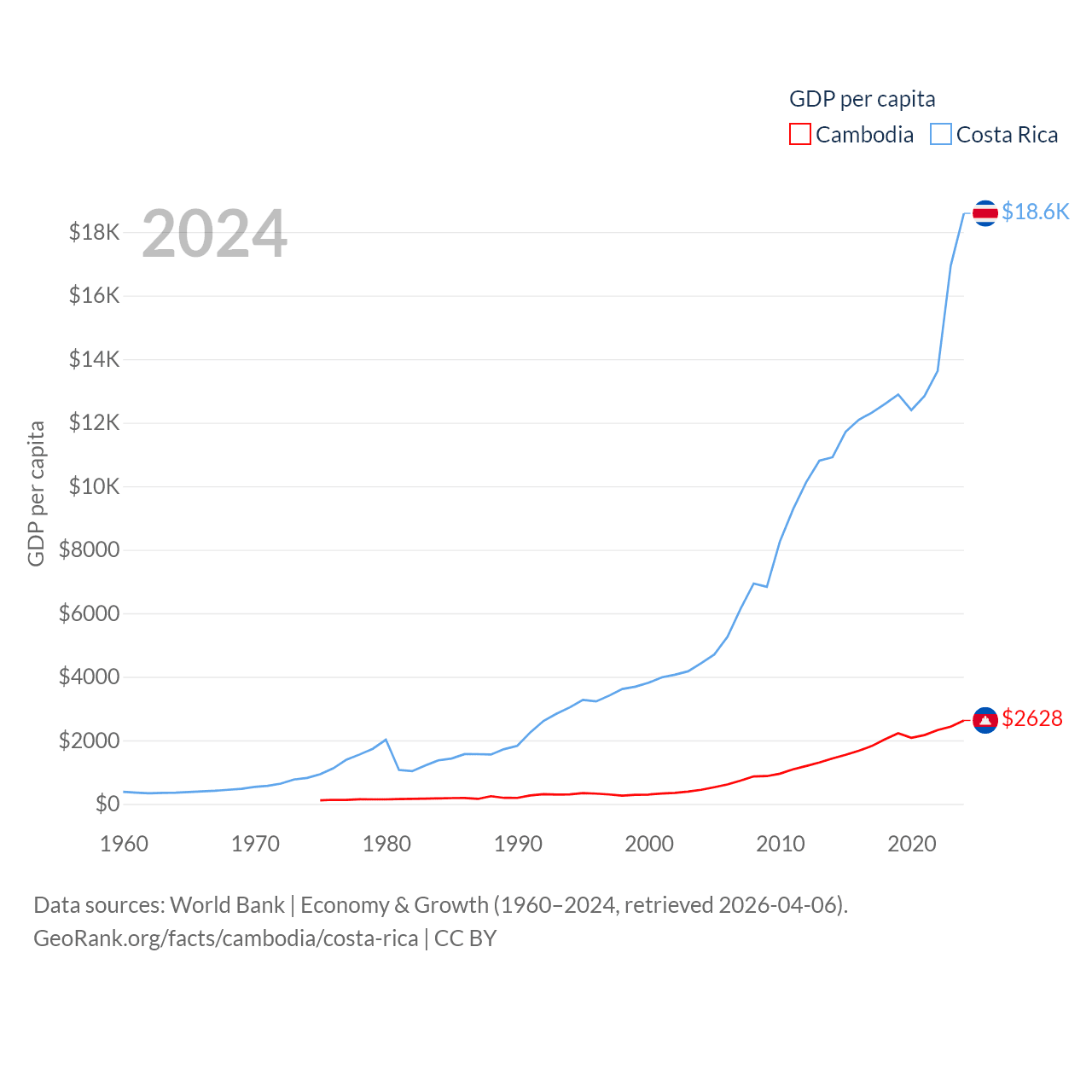 By GDP, Cambodia ranks 97/197 ($46.4B) and Costa Rica ranks 73/197 ($95.4B). By GDP per capita, Cambodia ranks 145/197 ($2,628), while Costa Rica ranks 62/197 ($18,587).