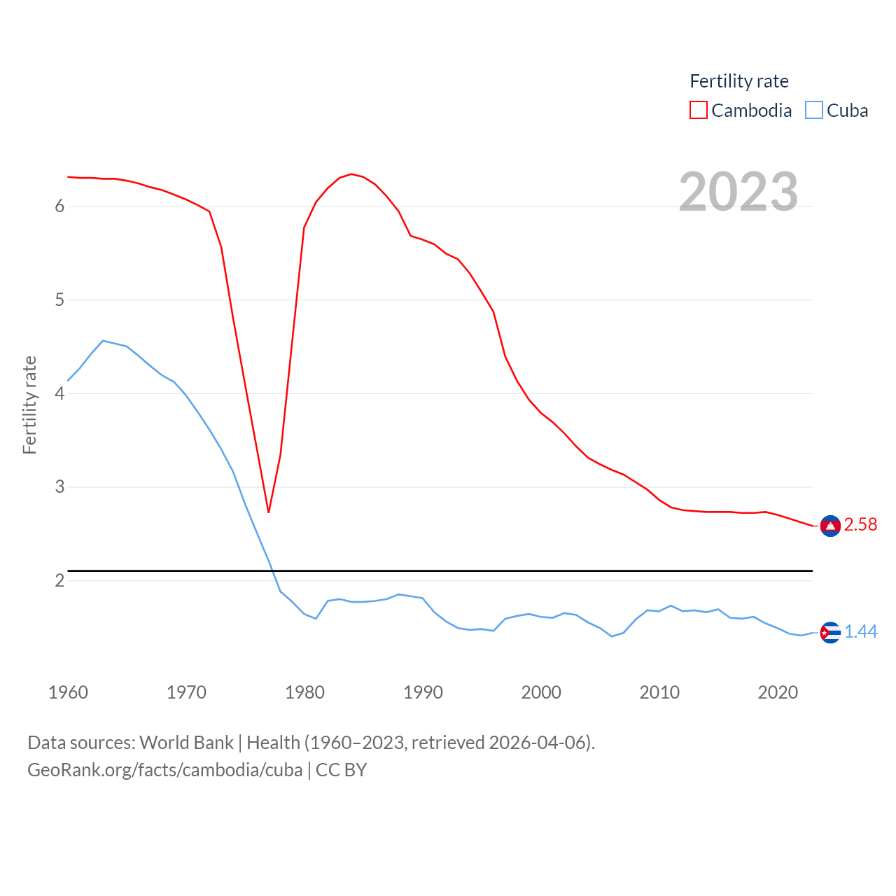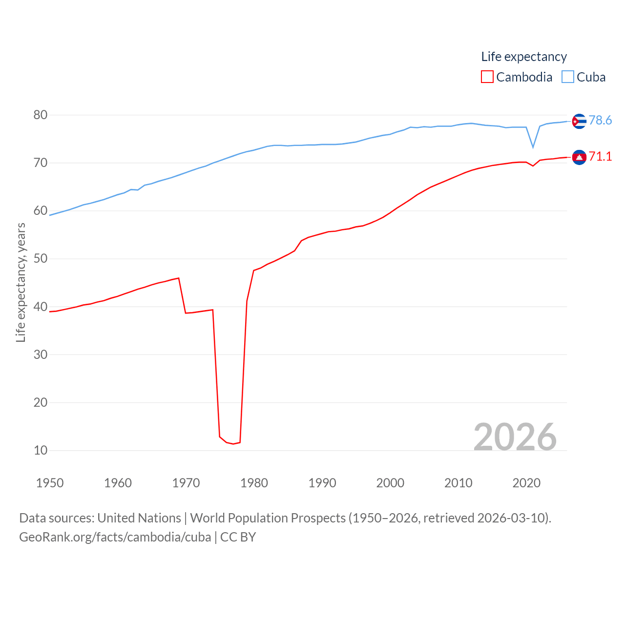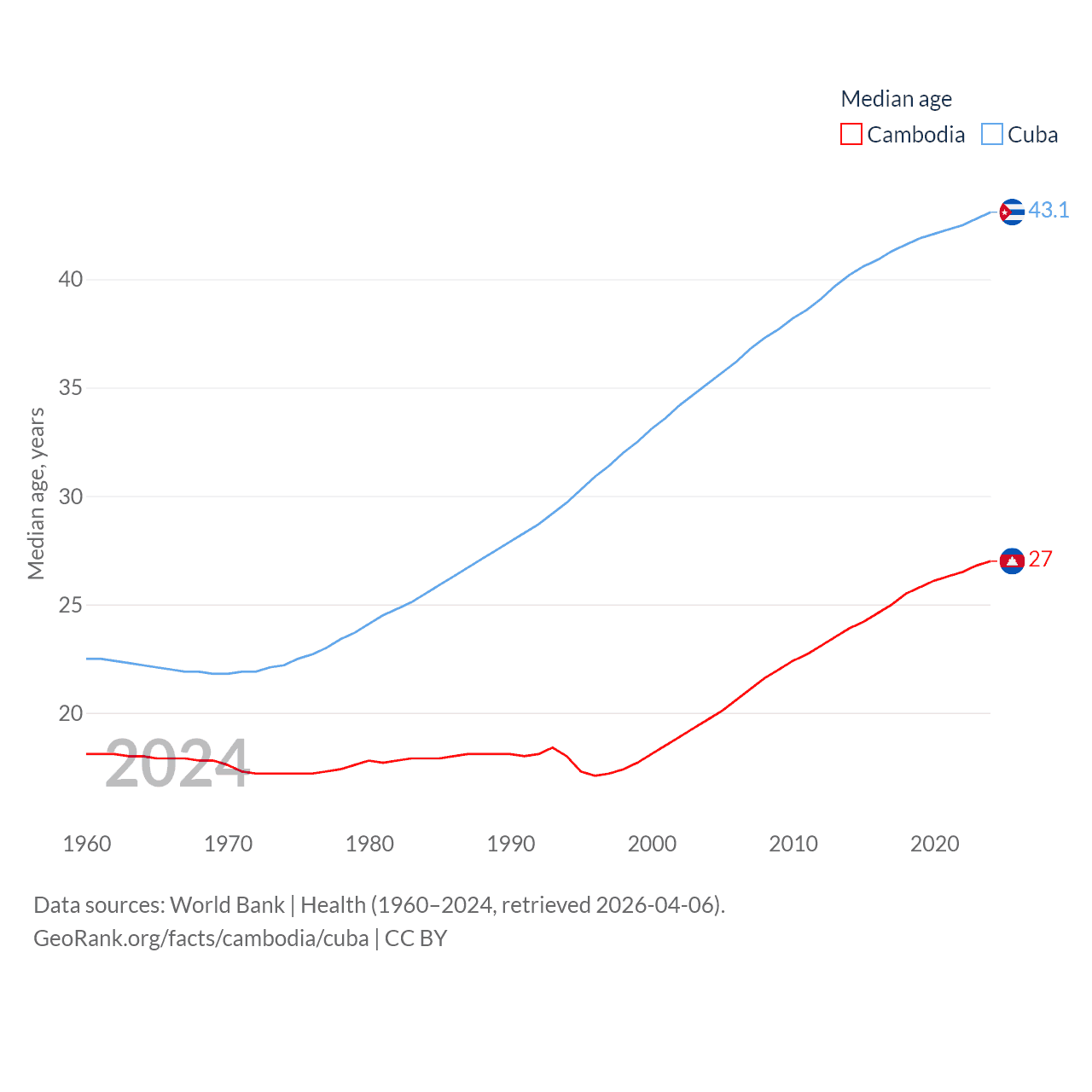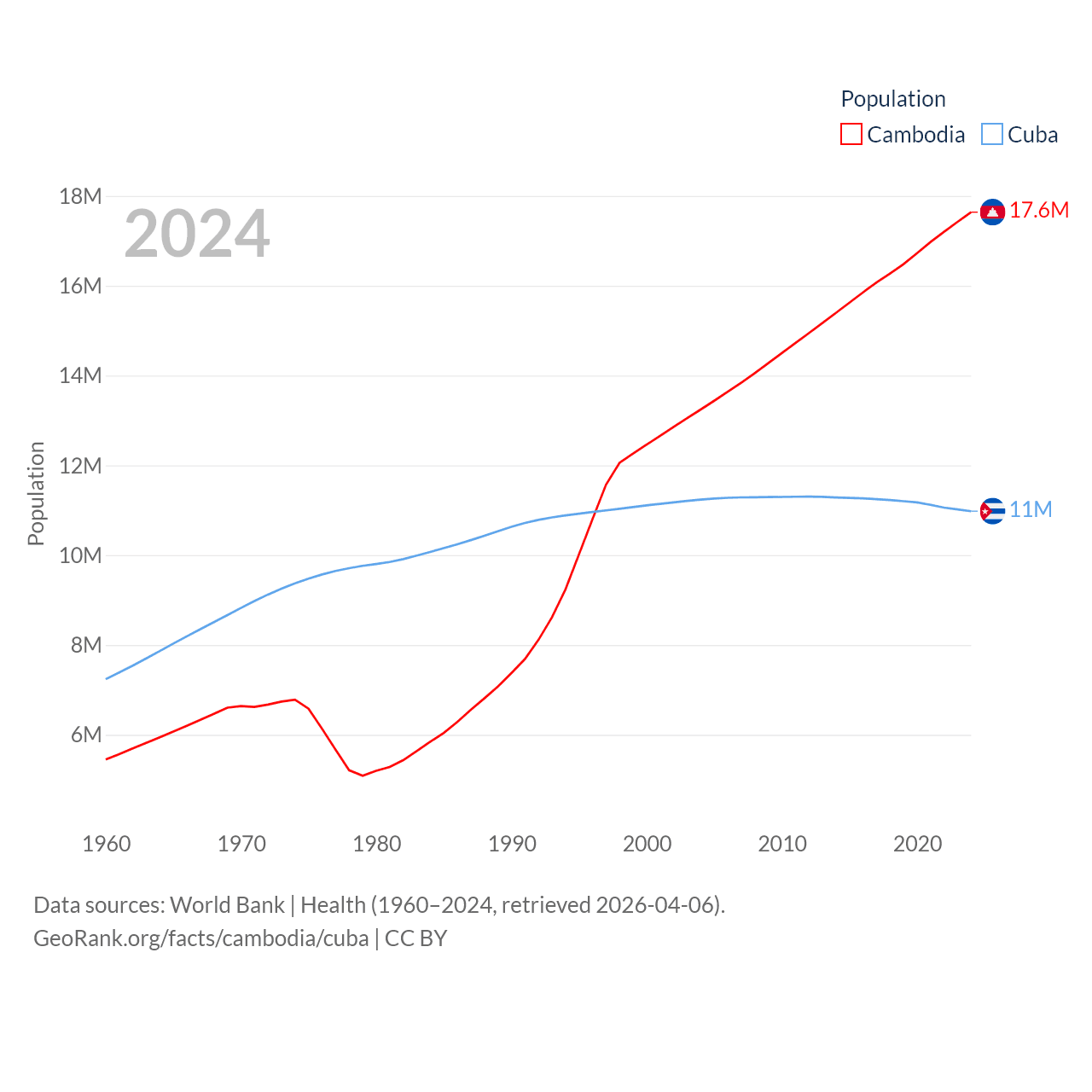 Cambodia has a population of 17.6M (ranked 73/197), compared with 11M in Cuba (ranked 87/197). Cambodia's land area is 68,155 sq mi versus 40,077 sq mi for Cuba (ranked 88th vs. 103rd).