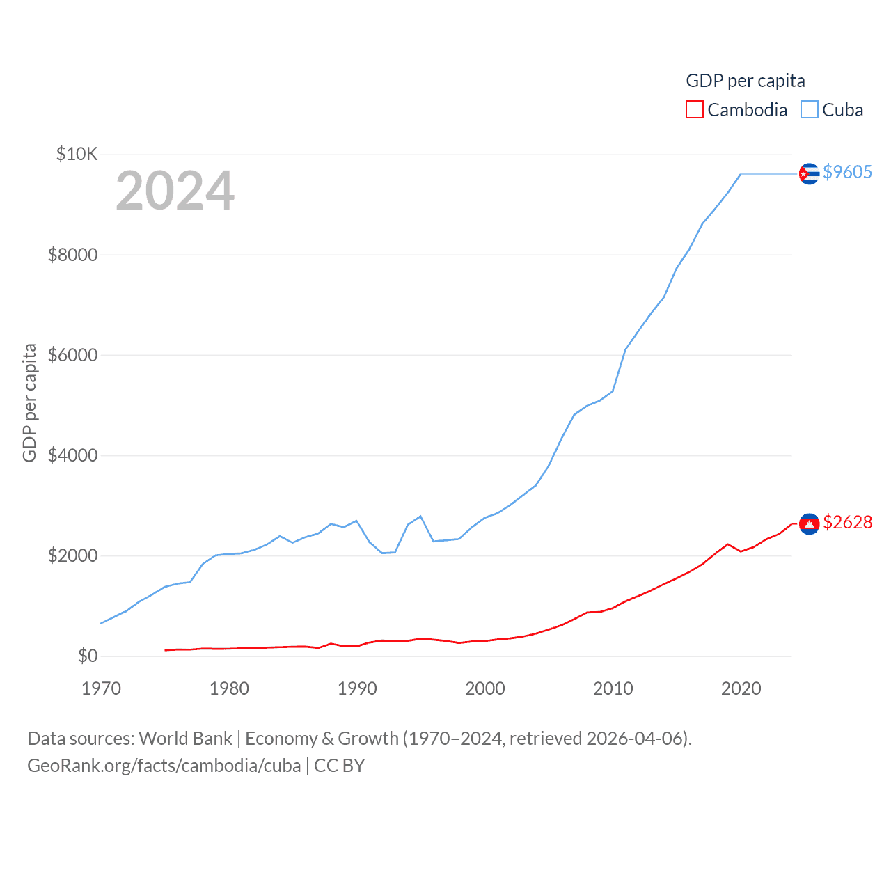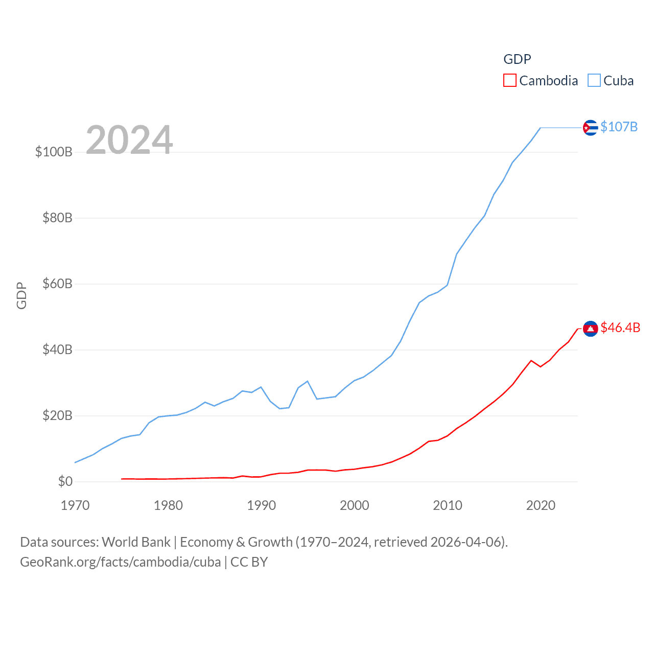 By GDP, Cambodia ranks 97/197 ($46.4B) and Cuba ranks 69/197 ($107B). By GDP per capita, Cambodia ranks 145/197 ($2,628), while Cuba ranks 86/197 ($9,605).