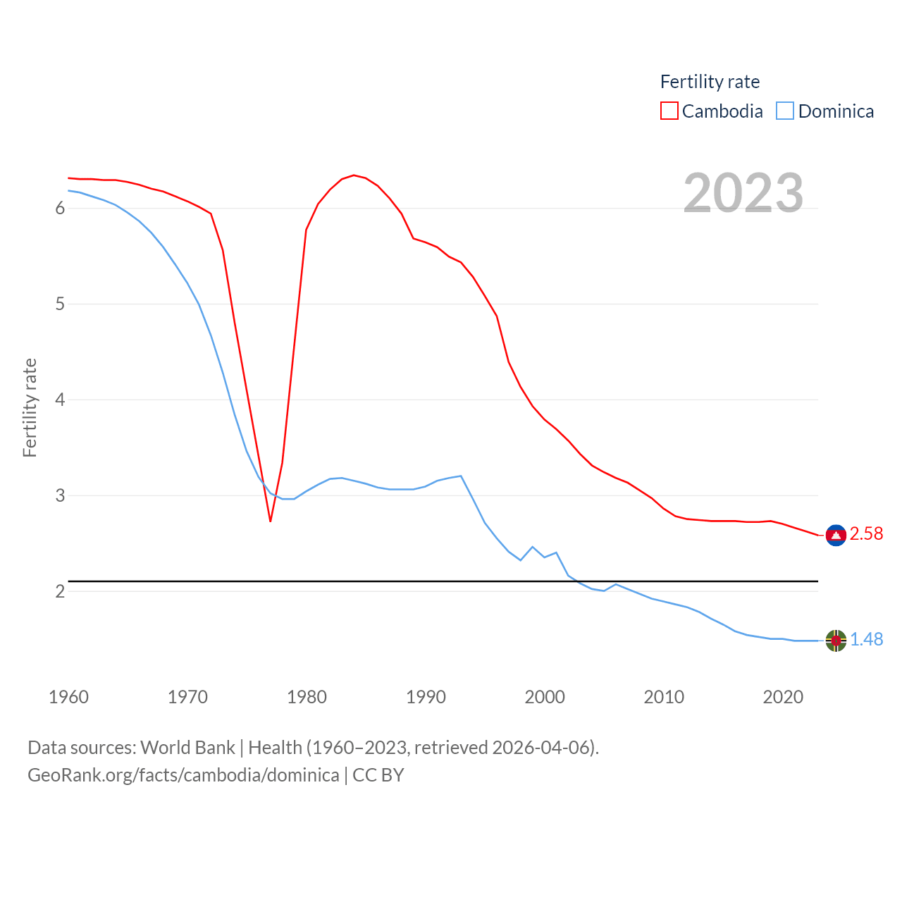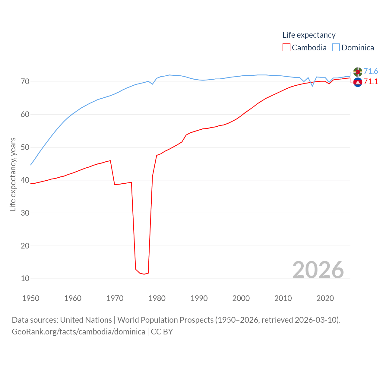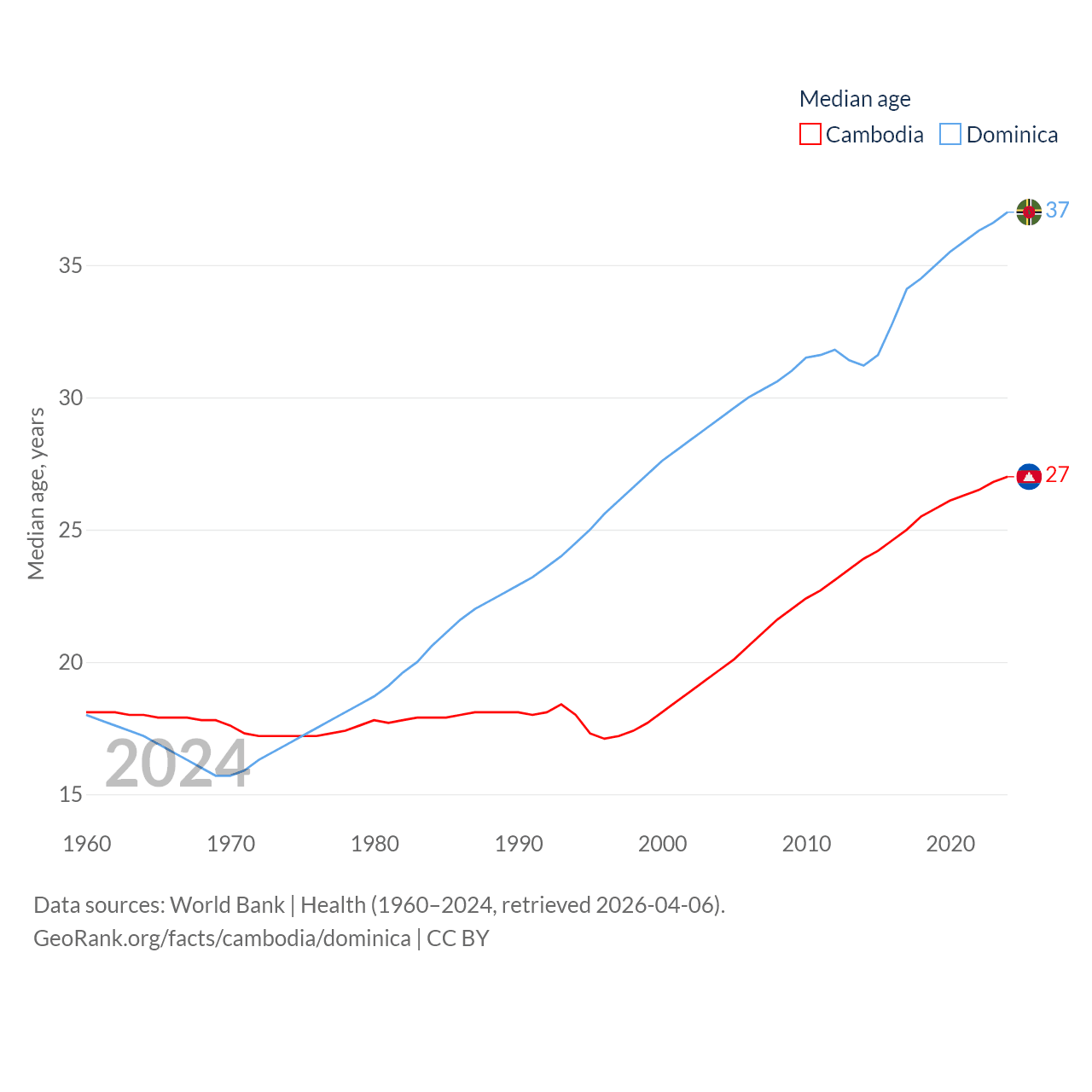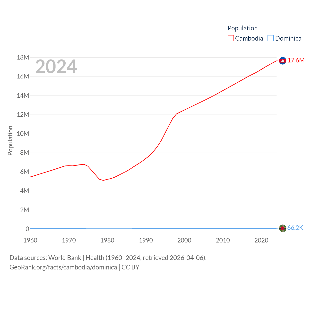 Cambodia has a population of 17.6M (ranked 73/197), compared with 66.2K in Dominica (ranked 188/197). Cambodia's land area is 68,155 sq mi versus 289.6 sq mi for Dominica (ranked 88th vs. 175th).