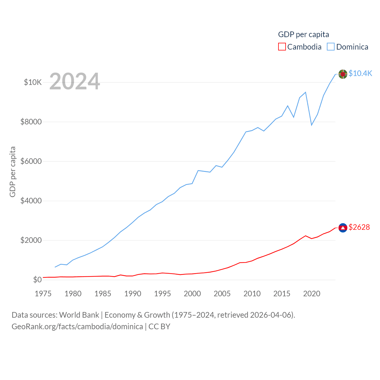 By GDP, Cambodia ranks 97/197 ($46.4B) and Dominica ranks 190/197 ($689M). By GDP per capita, Cambodia ranks 145/197 ($2,628), while Dominica ranks 84/197 ($10,405).