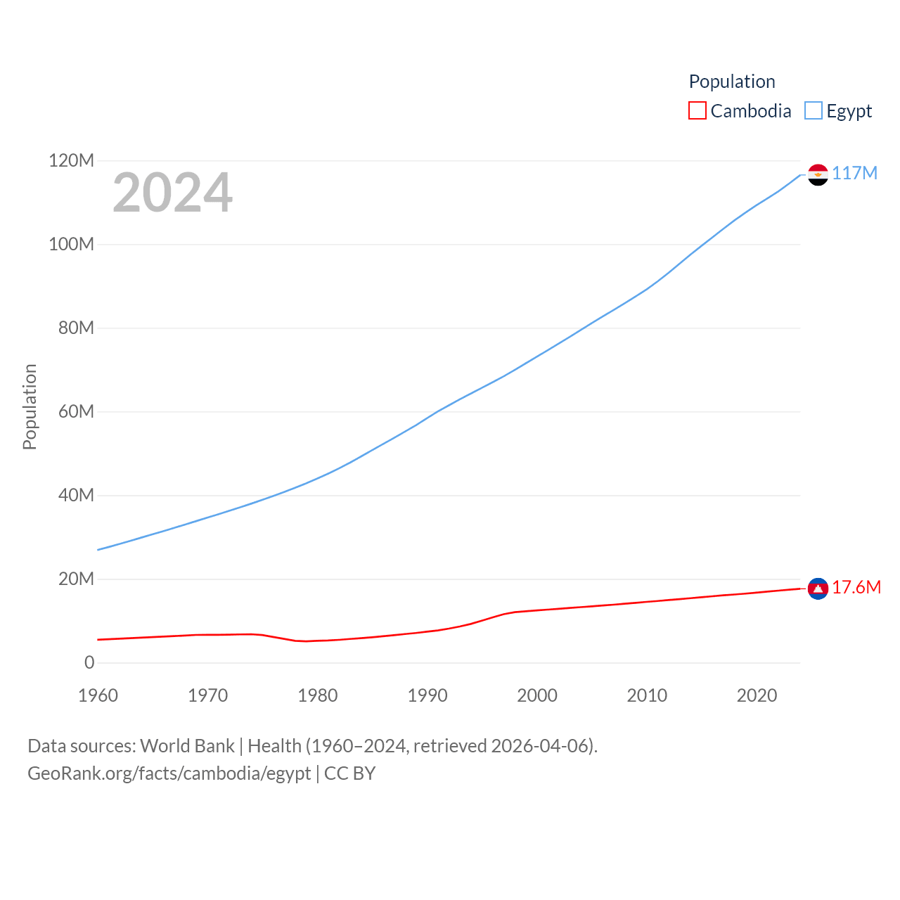 Cambodia has a population of 17.6M (ranked 73/197), compared with 117M in Egypt (ranked 13/197). Cambodia's land area is 68,155 sq mi versus 384,345 sq mi for Egypt (ranked 88th vs. 29th).