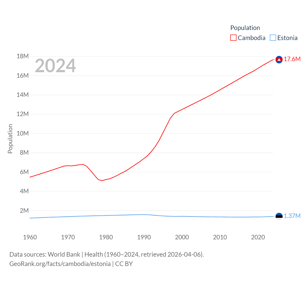 Cambodia has a population of 17.6M (ranked 73/197), compared with 1.37M in Estonia (ranked 153/197). Cambodia's land area is 68,155 sq mi versus 16,498 sq mi for Estonia (ranked 88th vs. 129th).