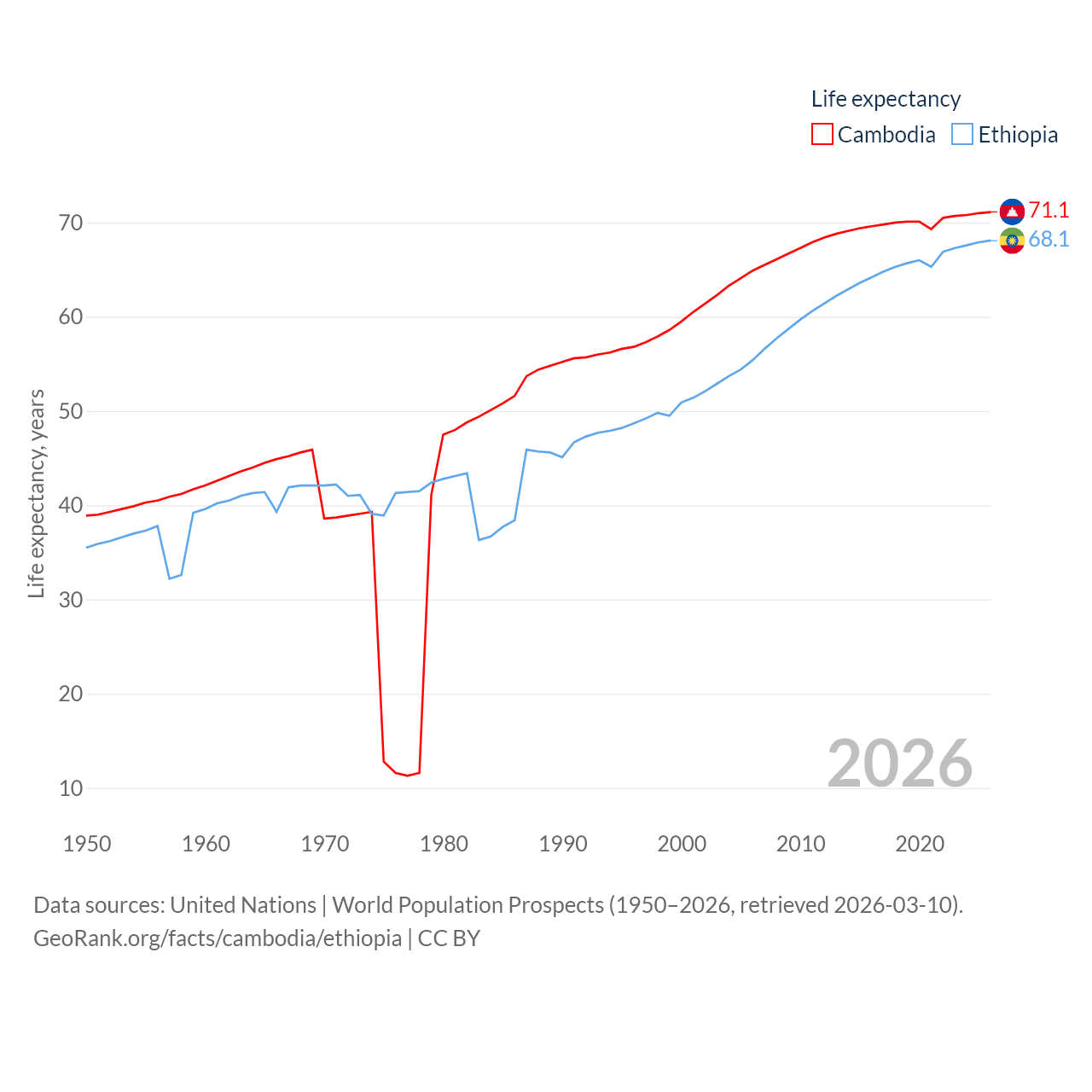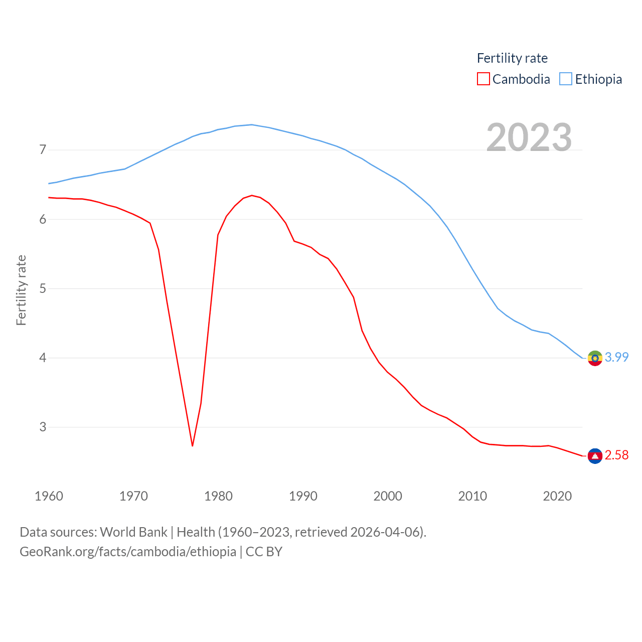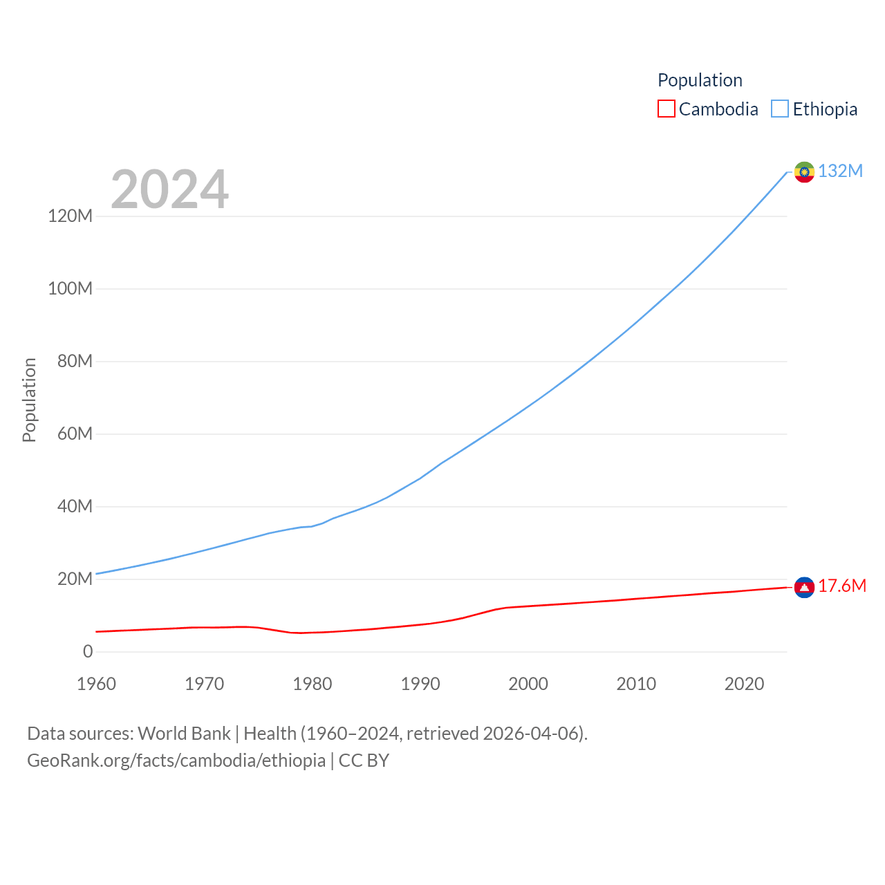 Cambodia has a population of 17.6M (ranked 73/197), compared with 132M in Ethiopia (ranked 10/197). Cambodia's land area is 68,155 sq mi versus 435,716 sq mi for Ethiopia (ranked 88th vs. 25th).