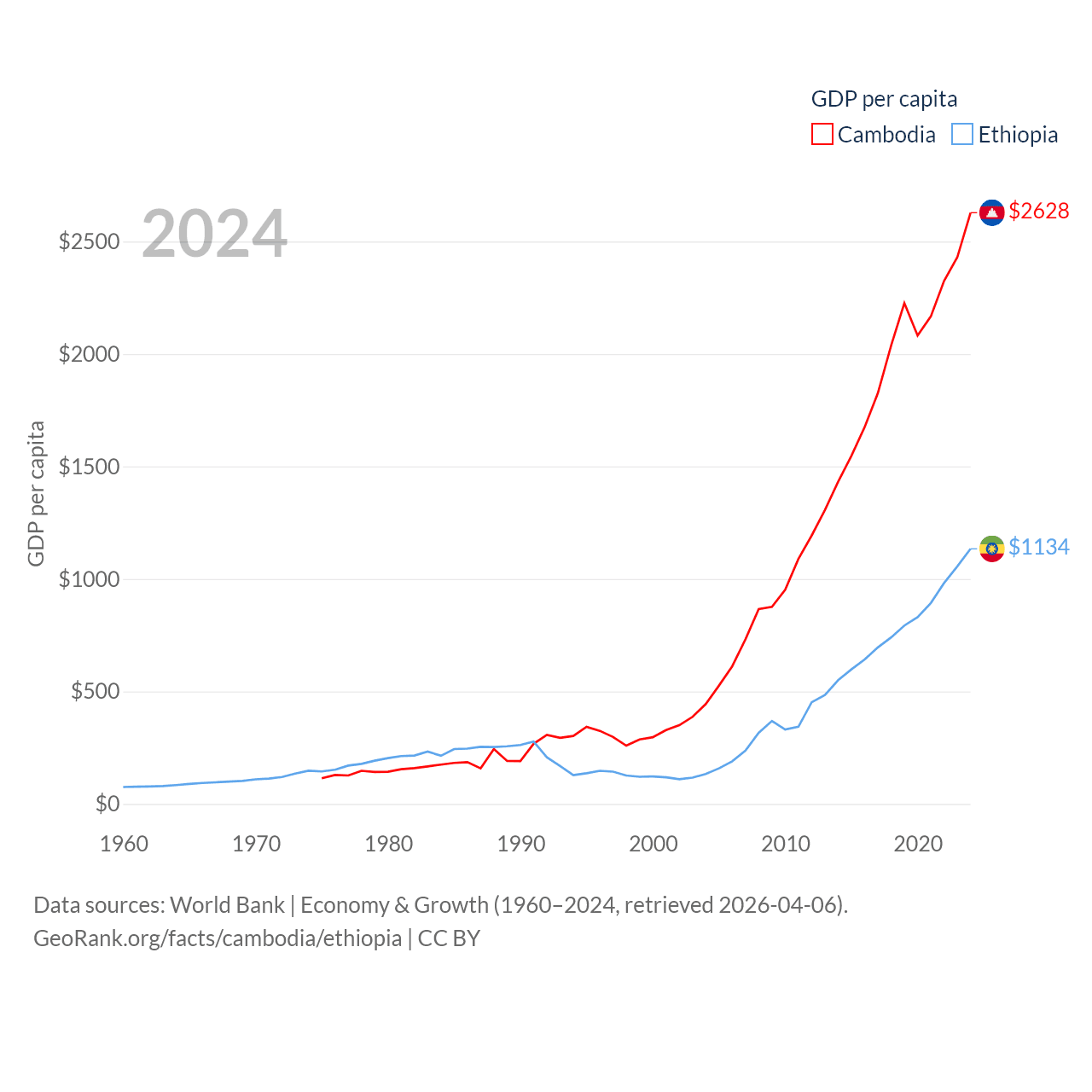 By GDP, Cambodia ranks 97/197 ($46.4B) and Ethiopia ranks 60/197 ($150B). By GDP per capita, Cambodia ranks 145/197 ($2,628), while Ethiopia ranks 171/197 ($1,134).