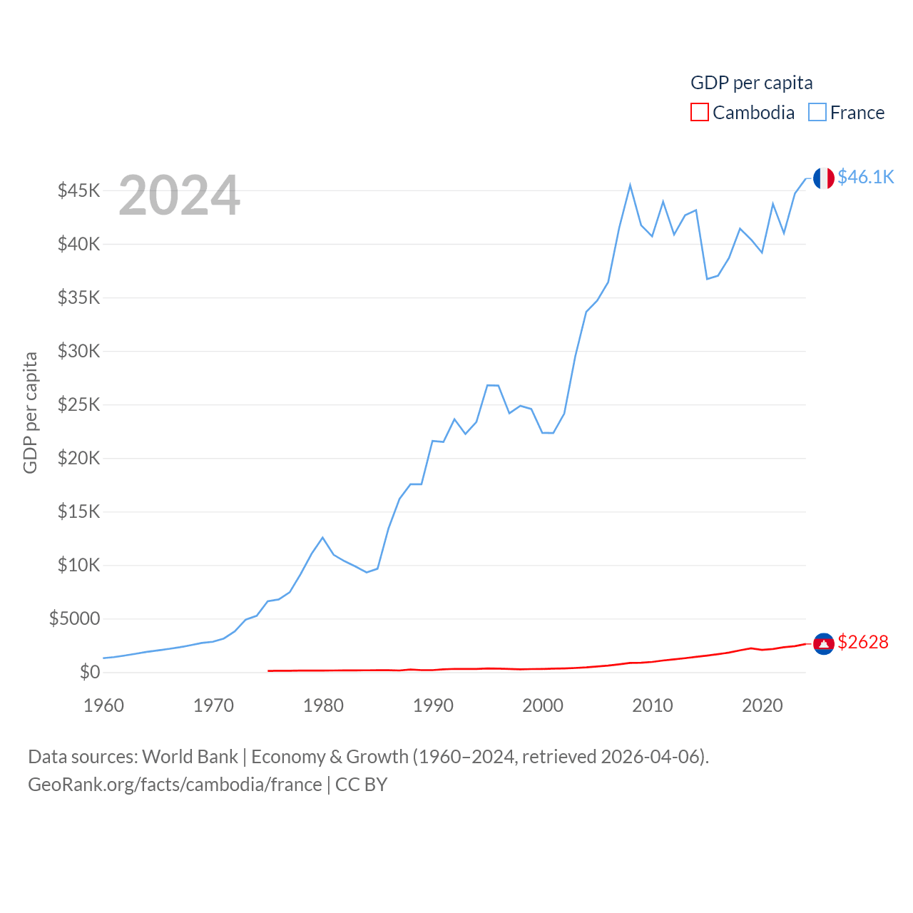 By GDP, Cambodia ranks 97/197 ($46.4B) and France ranks 7/197 ($3.16T). By GDP per capita, Cambodia ranks 145/197 ($2,628), while France ranks 27/197 ($46,103).