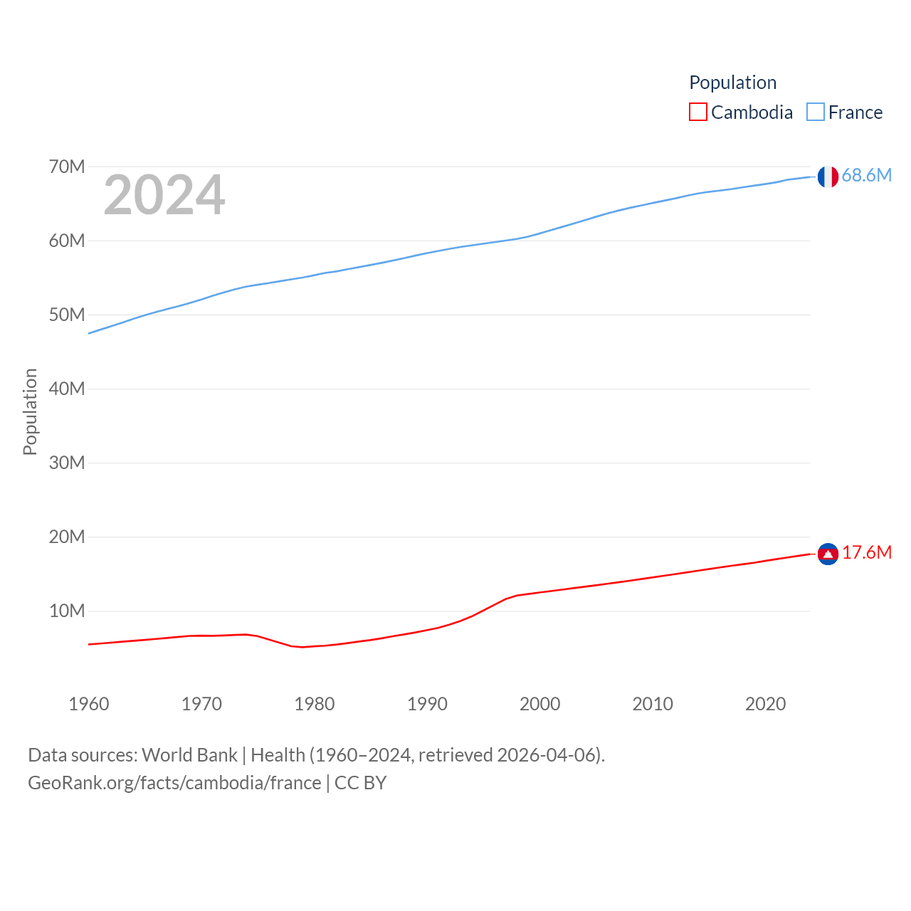 Cambodia has a population of 17.6M (ranked 73/197), compared with 68.6M in France (ranked 23/197). Cambodia's land area is 68,155 sq mi versus 208,090 sq mi for France (ranked 88th vs. 48th).