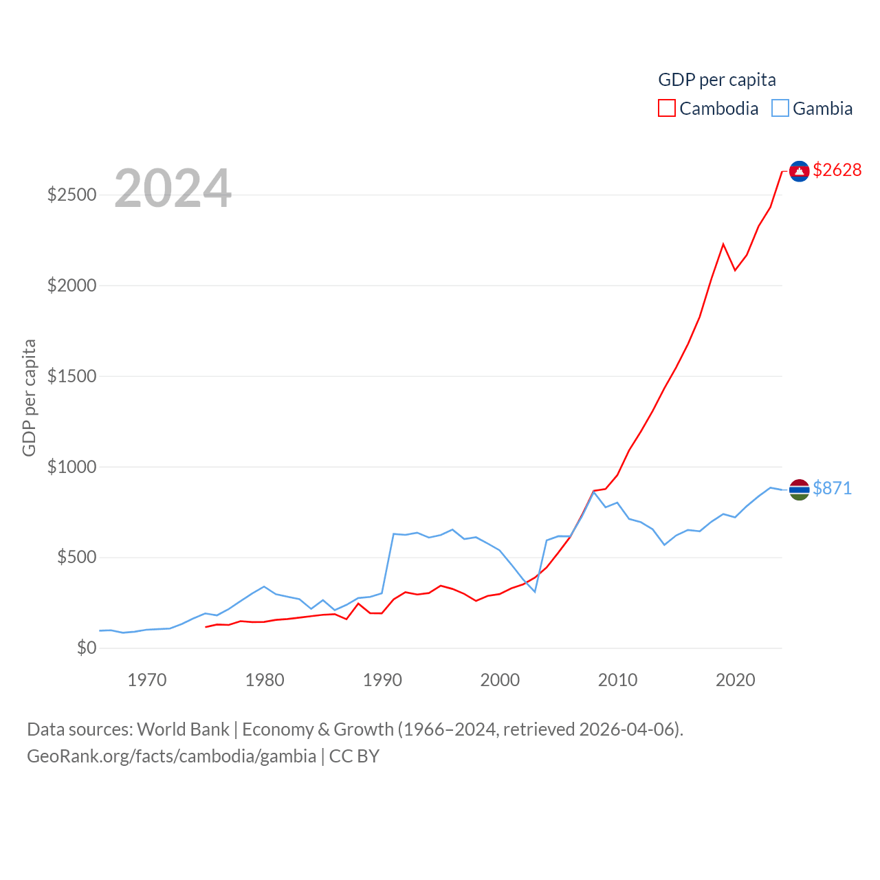 By GDP, Cambodia ranks 97/197 ($46.4B) and The Gambia ranks 174/197 ($2.4B). By GDP per capita, Cambodia ranks 145/197 ($2,628), while The Gambia ranks 183/197 ($871).