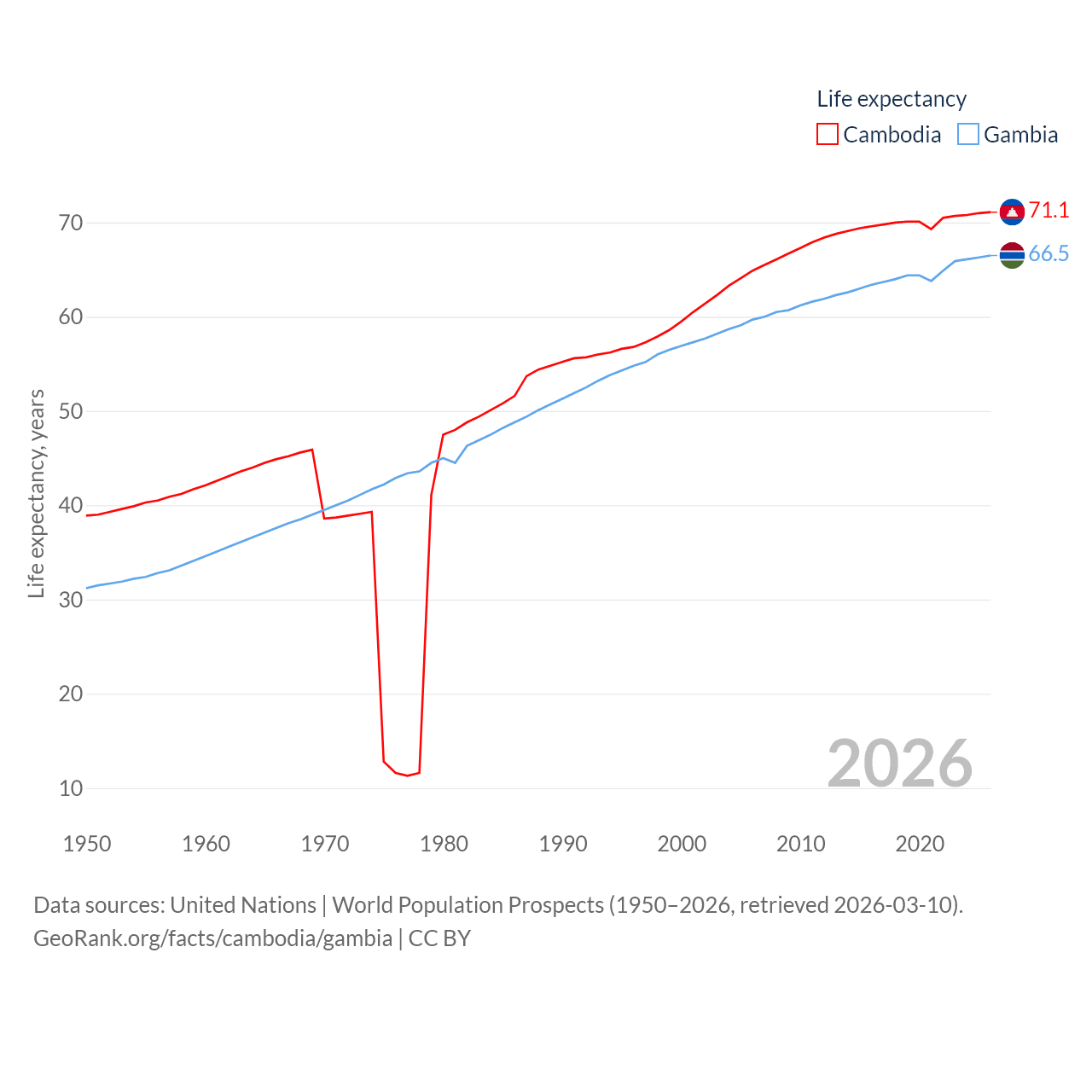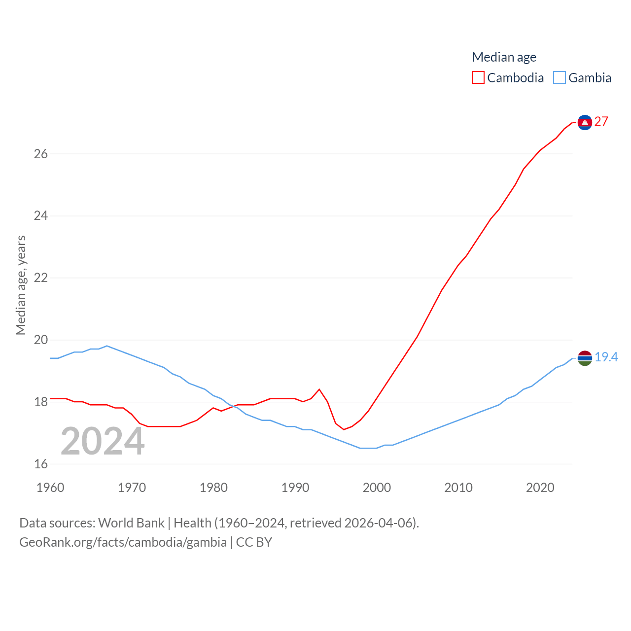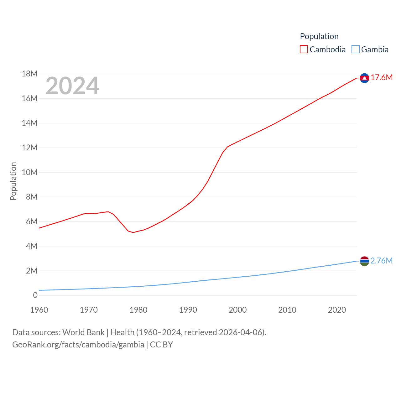 Cambodia has a population of 17.6M (ranked 73/197), compared with 2.76M in The Gambia (ranked 140/197). Cambodia's land area is 68,155 sq mi versus 3,907 sq mi for The Gambia (ranked 88th vs. 161st).