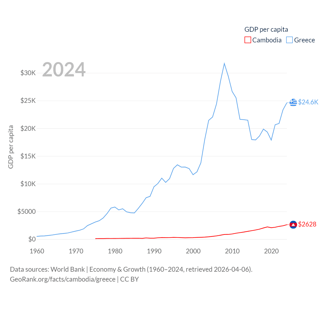 By GDP, Cambodia ranks 97/197 ($46.4B) and Greece ranks 53/197 ($256B). By GDP per capita, Cambodia ranks 145/197 ($2,628), while Greece ranks 49/197 ($24,626).