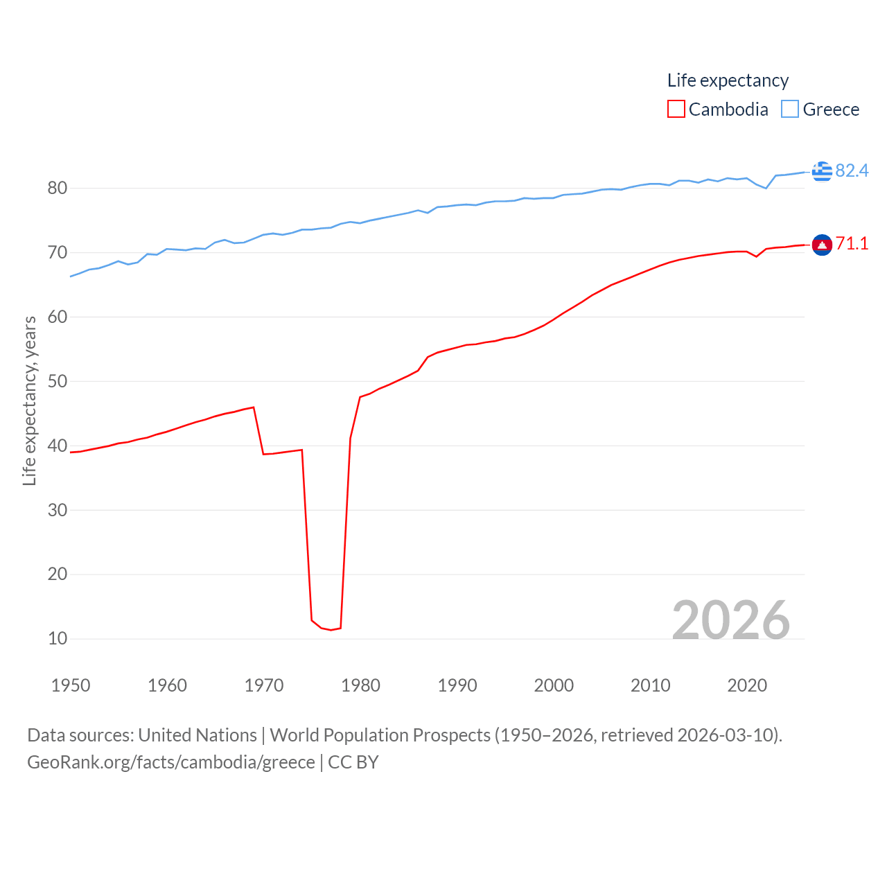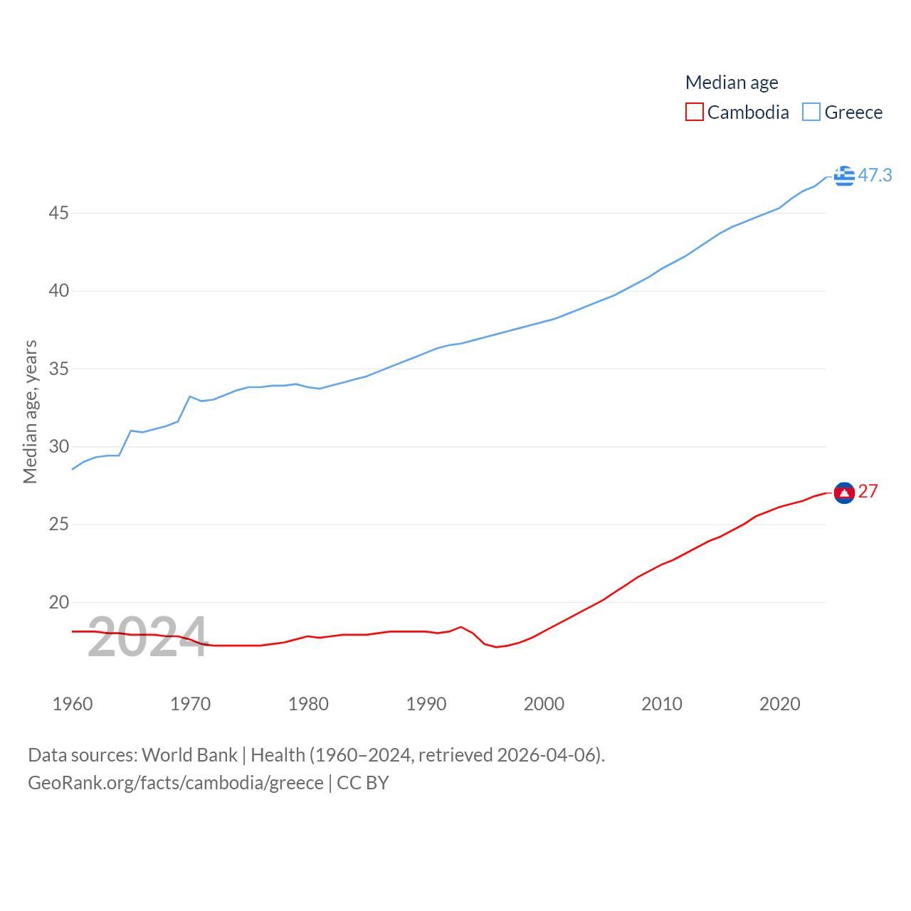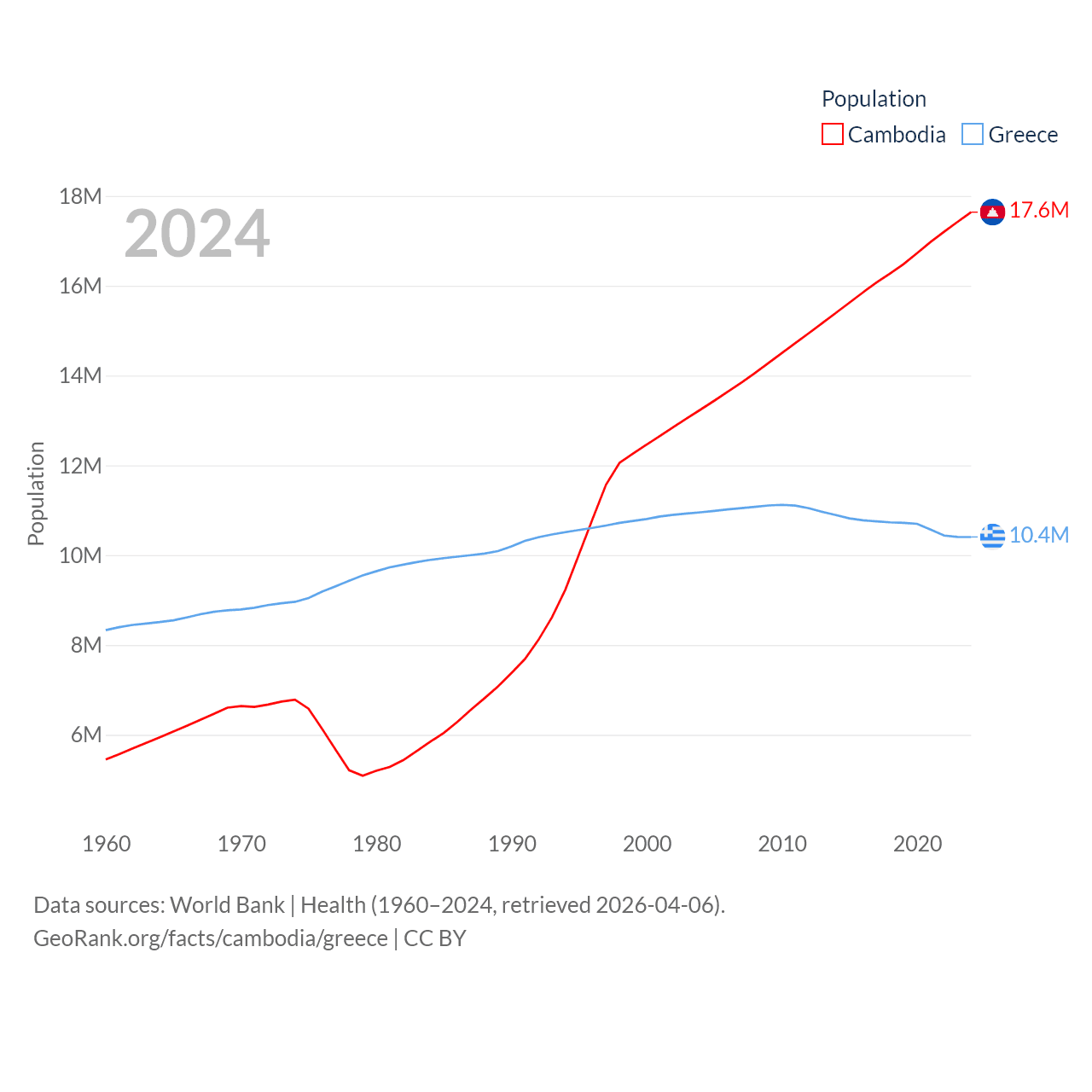 Cambodia has a population of 17.6M (ranked 73/197), compared with 10.4M in Greece (ranked 94/197). Cambodia's land area is 68,155 sq mi versus 49,769 sq mi for Greece (ranked 88th vs. 95th).