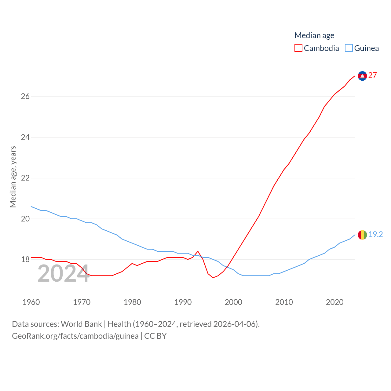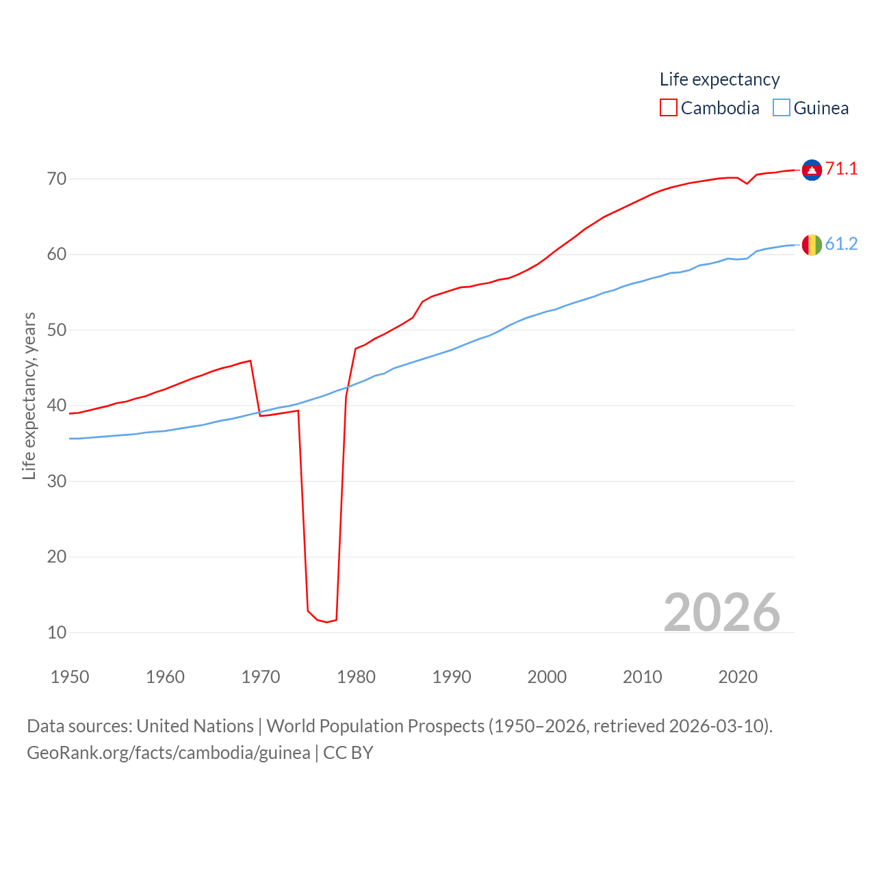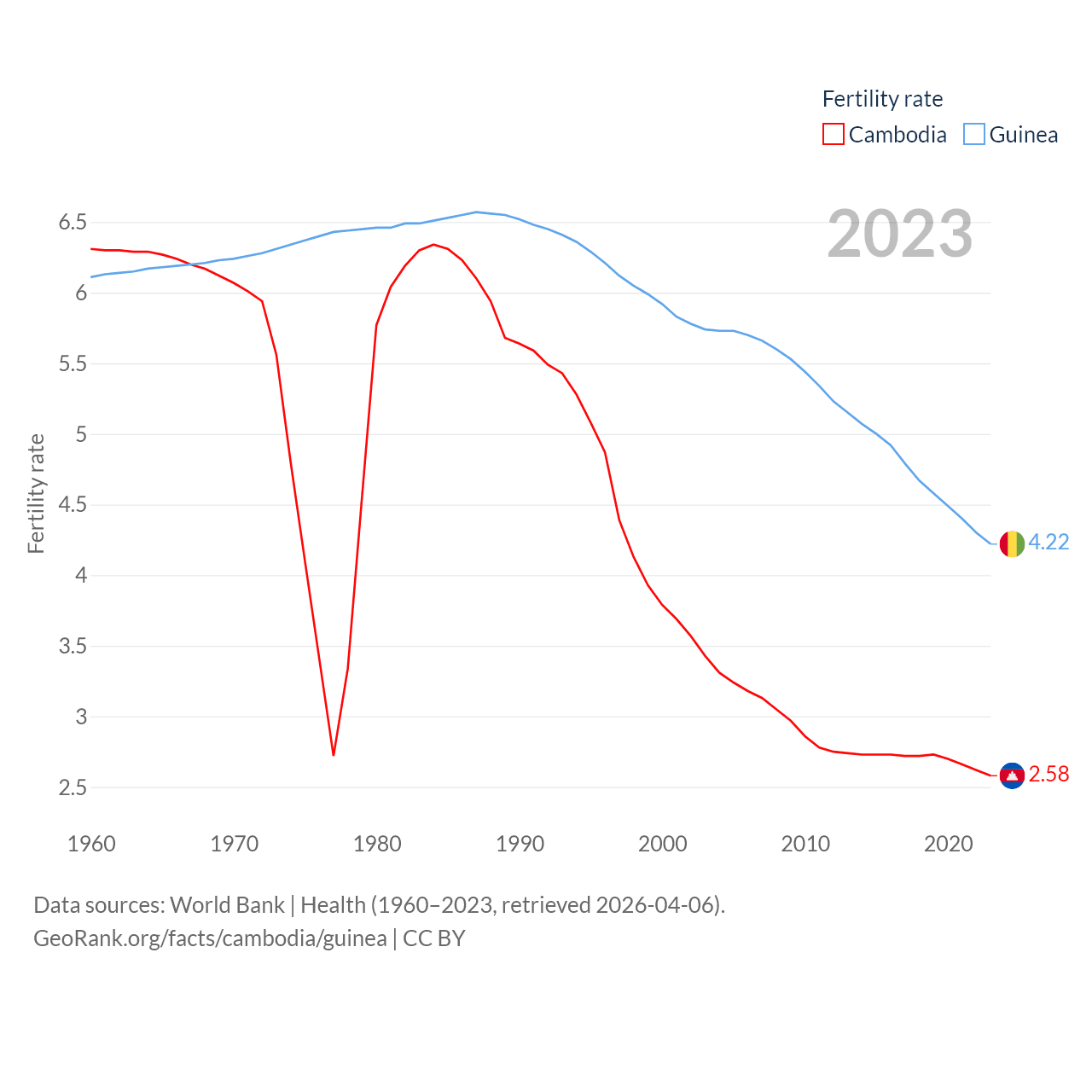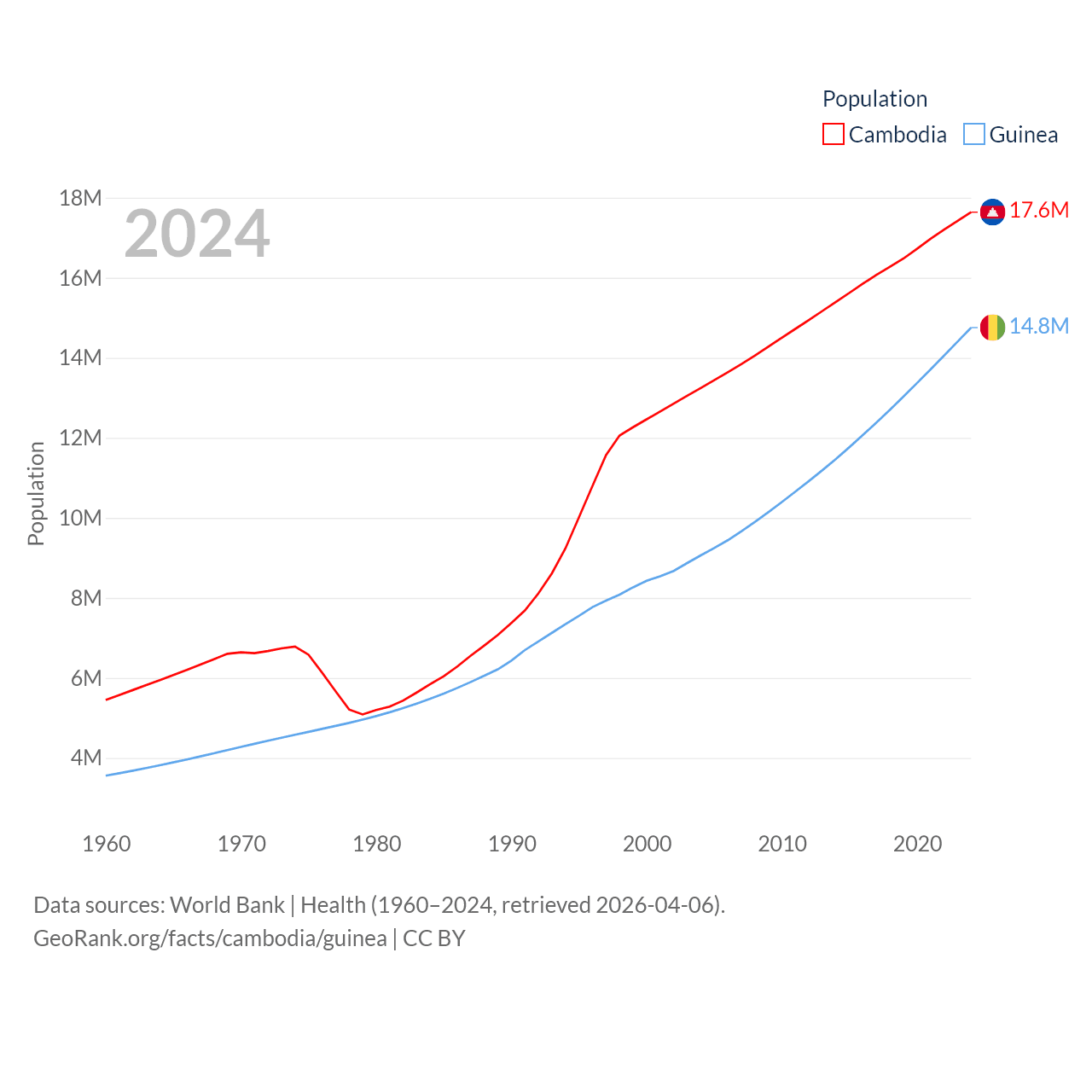 Cambodia has a population of 17.6M (ranked 73/197), compared with 14.8M in Guinea (ranked 75/197). Cambodia's land area is 68,155 sq mi versus 94,873 sq mi for Guinea (ranked 88th vs. 77th).