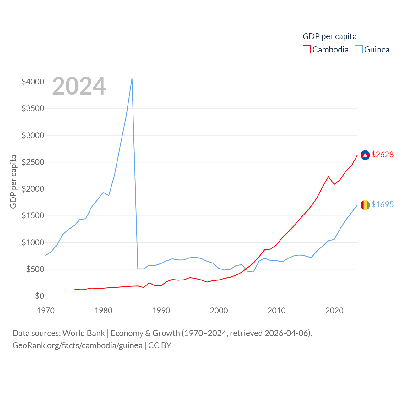 By GDP, Cambodia ranks 97/197 ($46.4B) and Guinea ranks 118/197 ($25B). By GDP per capita, Cambodia ranks 145/197 ($2,628), while Guinea ranks 160/197 ($1,695).