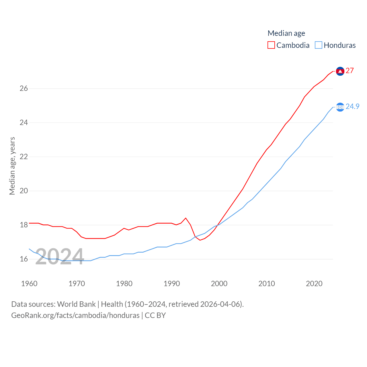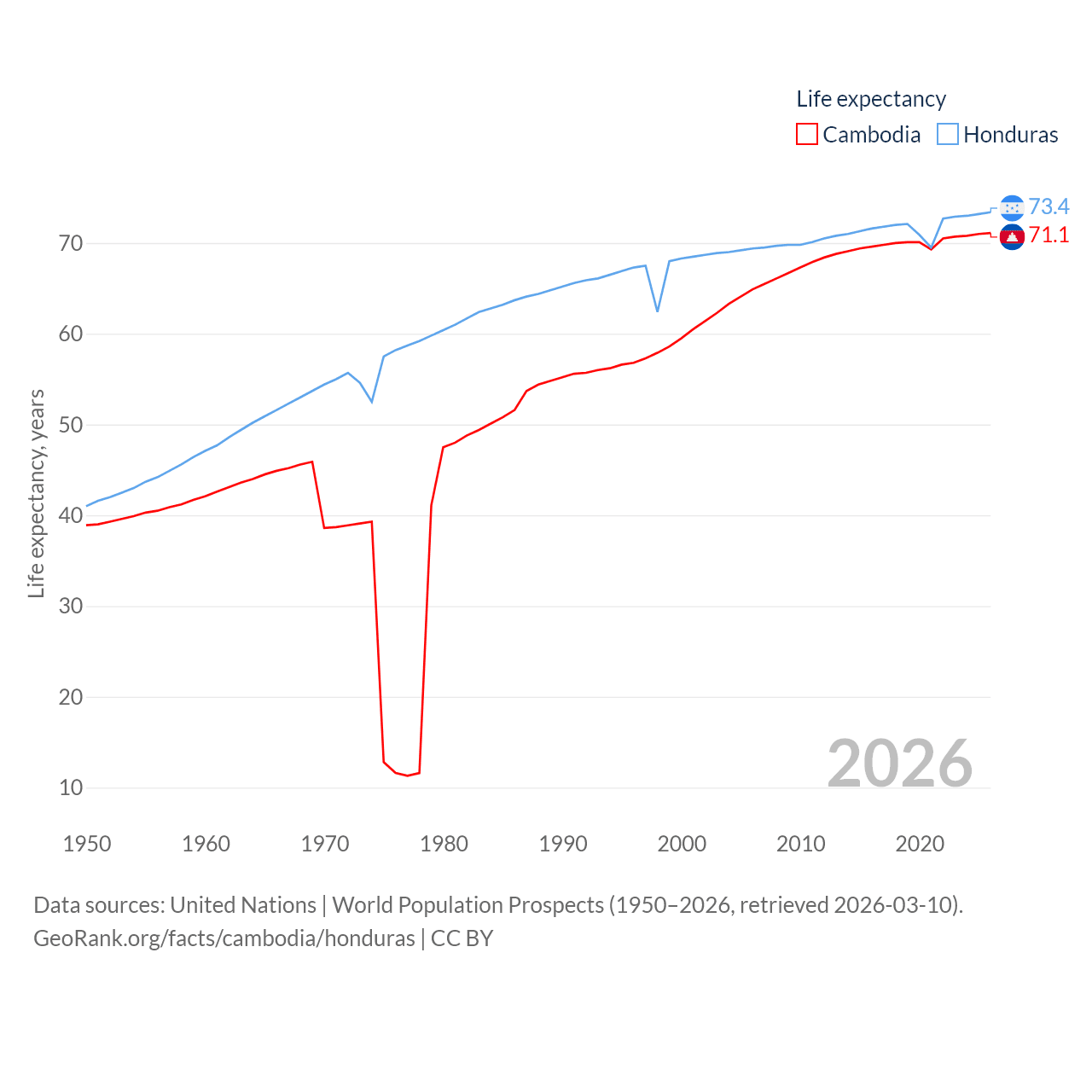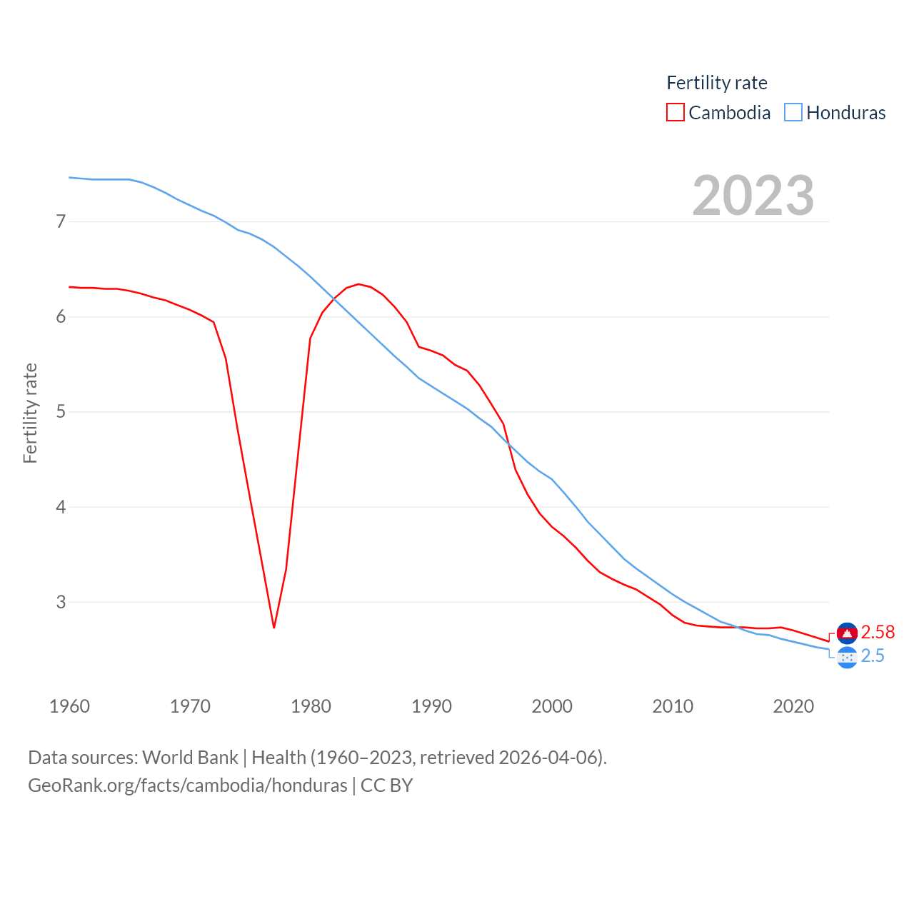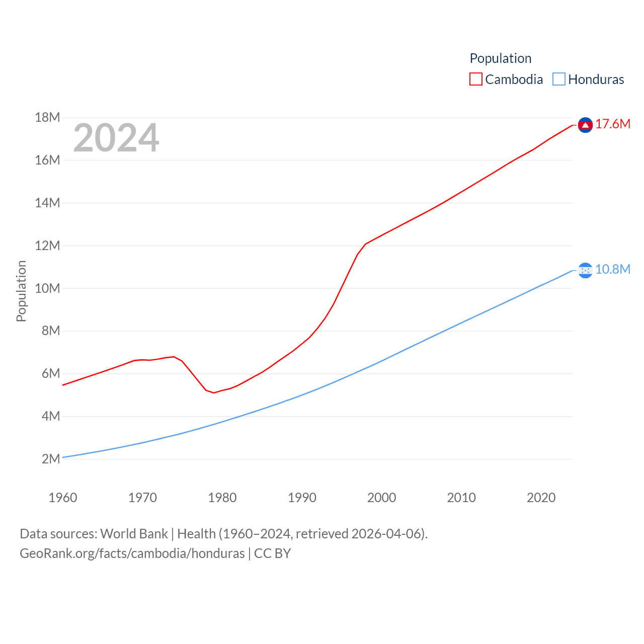 Cambodia has a population of 17.6M (ranked 73/197), compared with 10.8M in Honduras (ranked 89/197). Cambodia's land area is 68,155 sq mi versus 43,201 sq mi for Honduras (ranked 88th vs. 100th).