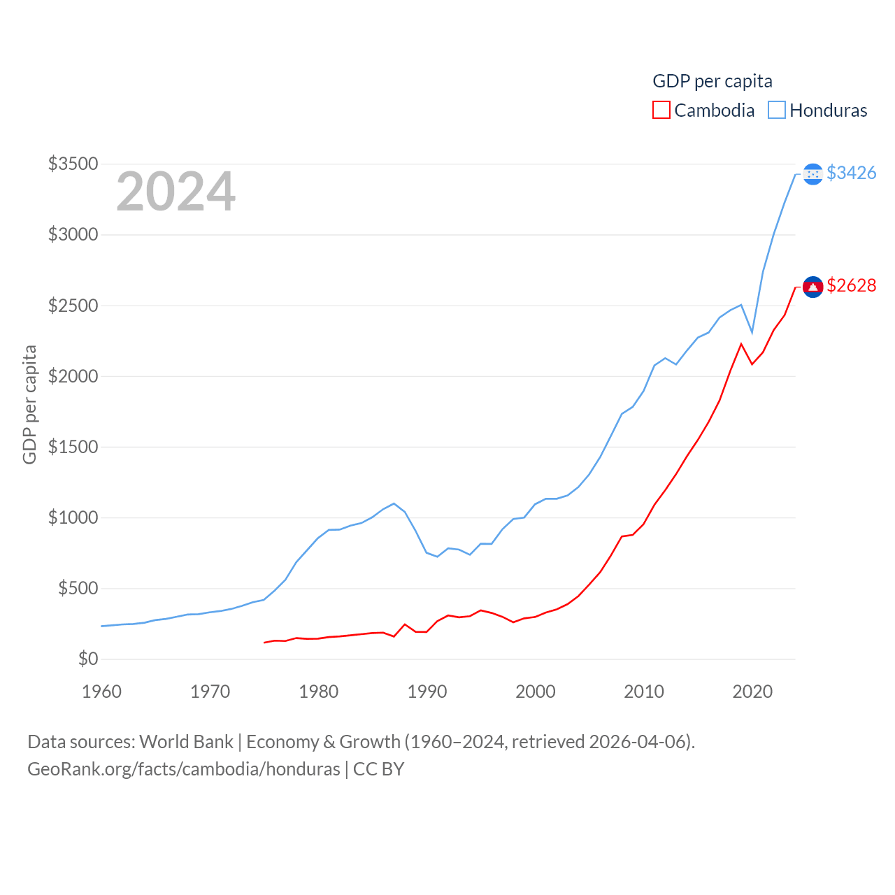 By GDP, Cambodia ranks 97/197 ($46.4B) and Honduras ranks 104/197 ($37.1B). By GDP per capita, Cambodia ranks 145/197 ($2,628), while Honduras ranks 136/197 ($3,426).