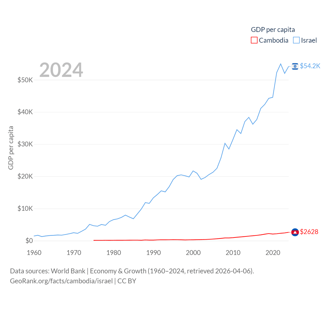 By GDP, Cambodia ranks 97/197 ($46.4B) and Israel ranks 29/197 ($540B). By GDP per capita, Cambodia ranks 145/197 ($2,628), while Israel ranks 21/197 ($54,177).