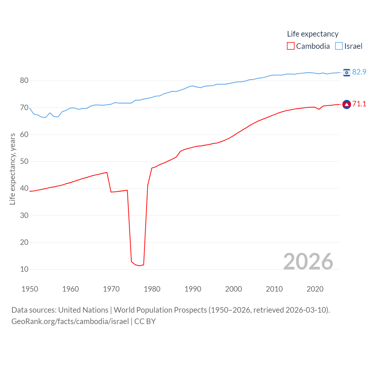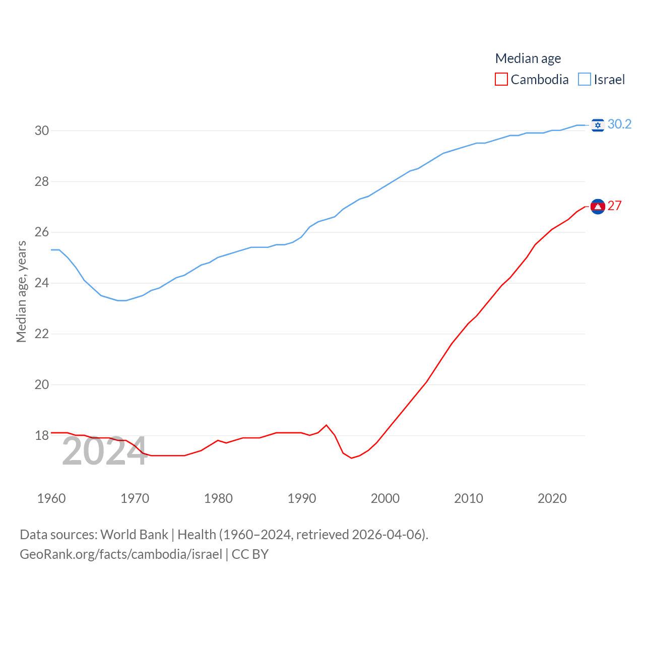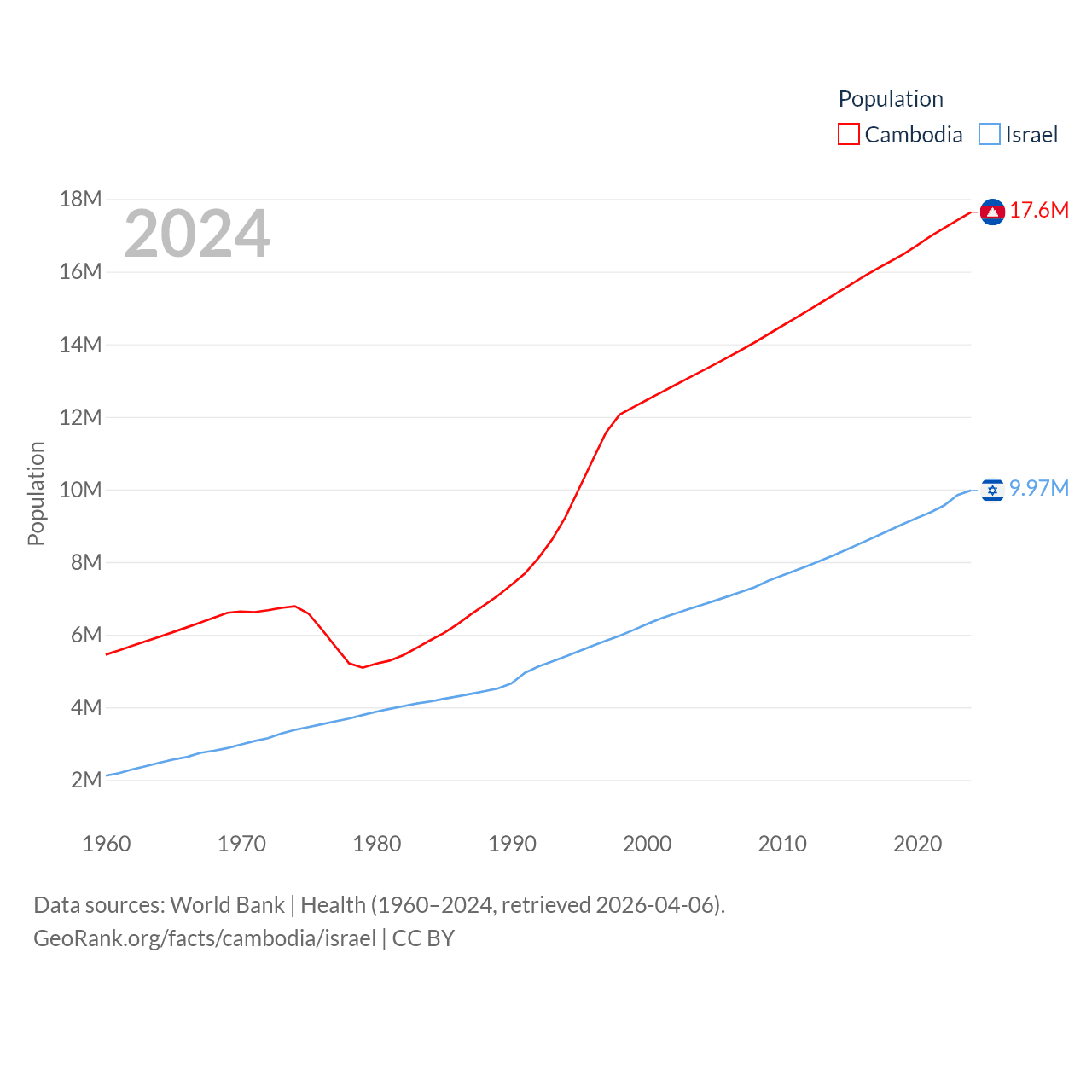 Cambodia has a population of 17.6M (ranked 73/197), compared with 9.97M in Israel (ranked 96/197). Cambodia's land area is 68,155 sq mi versus 8,355 sq mi for Israel (ranked 88th vs. 149th).