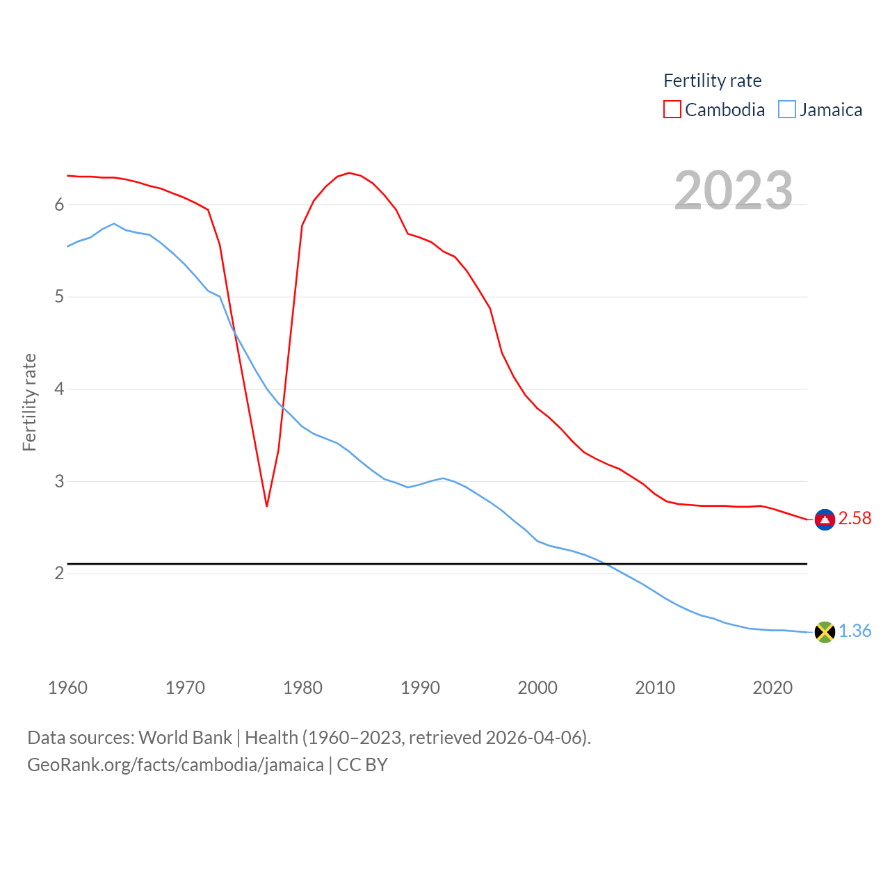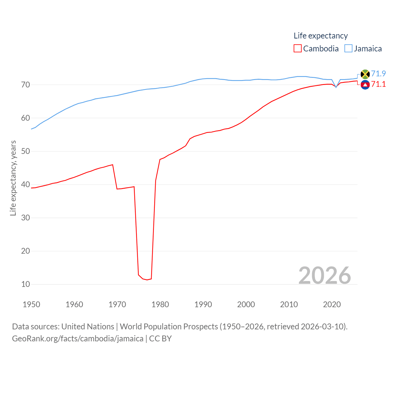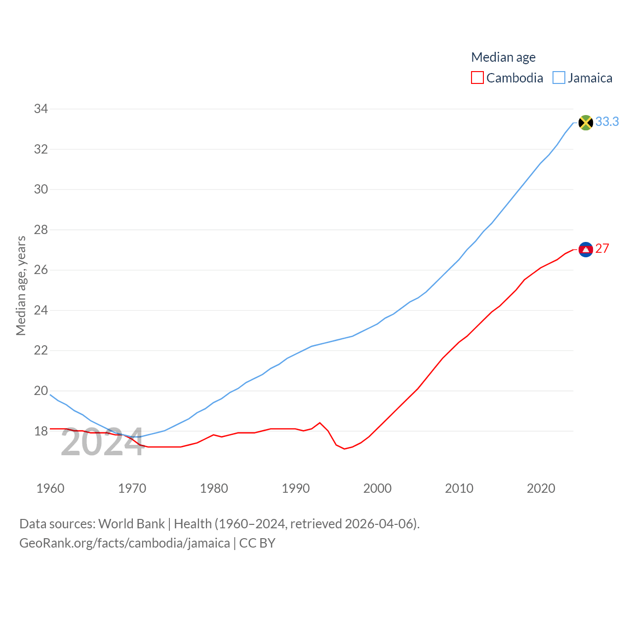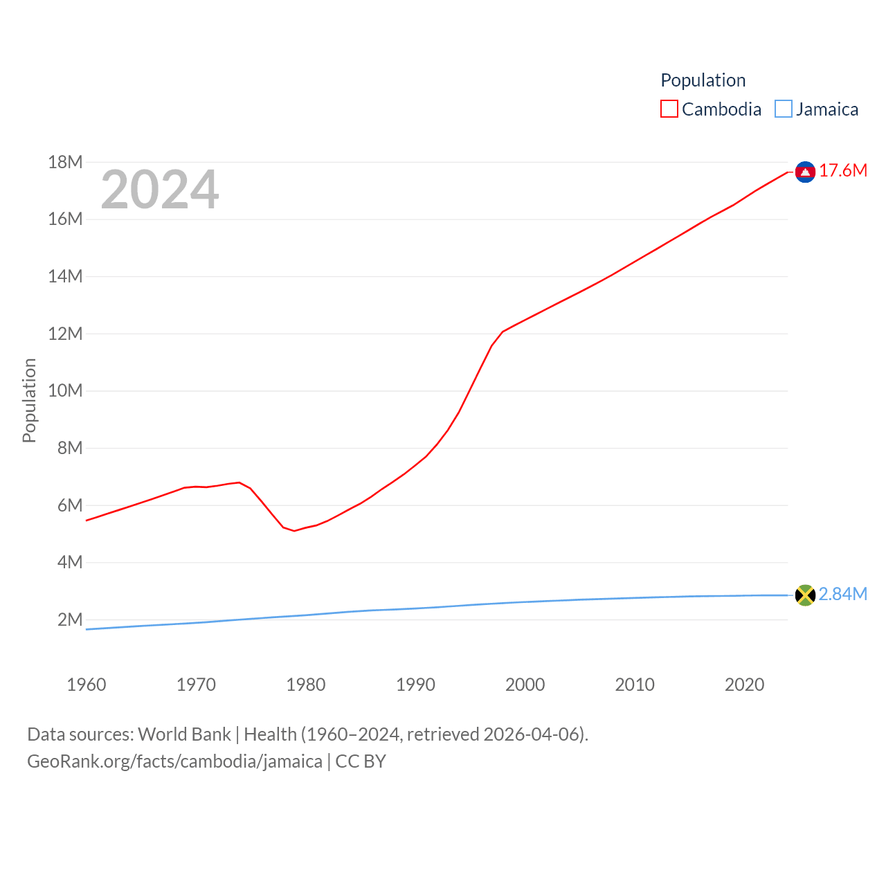 Cambodia has a population of 17.6M (ranked 73/197), compared with 2.84M in Jamaica (ranked 139/197). Cambodia's land area is 68,155 sq mi versus 4,181 sq mi for Jamaica (ranked 88th vs. 159th).