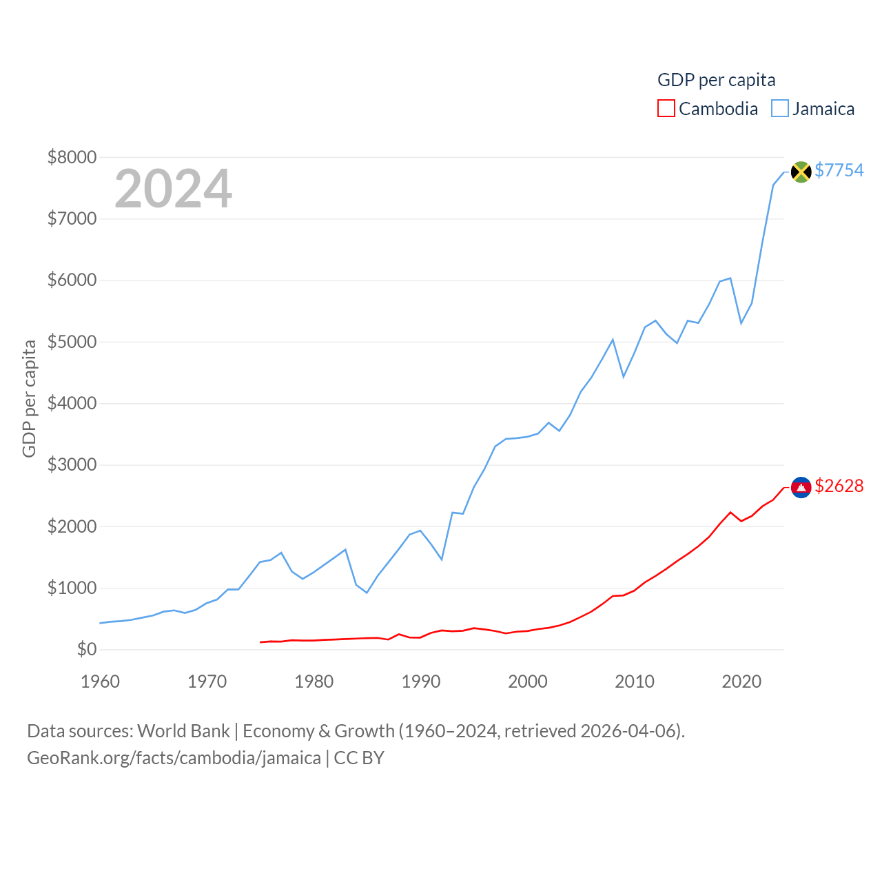By GDP, Cambodia ranks 97/197 ($46.4B) and Jamaica ranks 124/197 ($22B). By GDP per capita, Cambodia ranks 145/197 ($2,628), while Jamaica ranks 95/197 ($7,754).