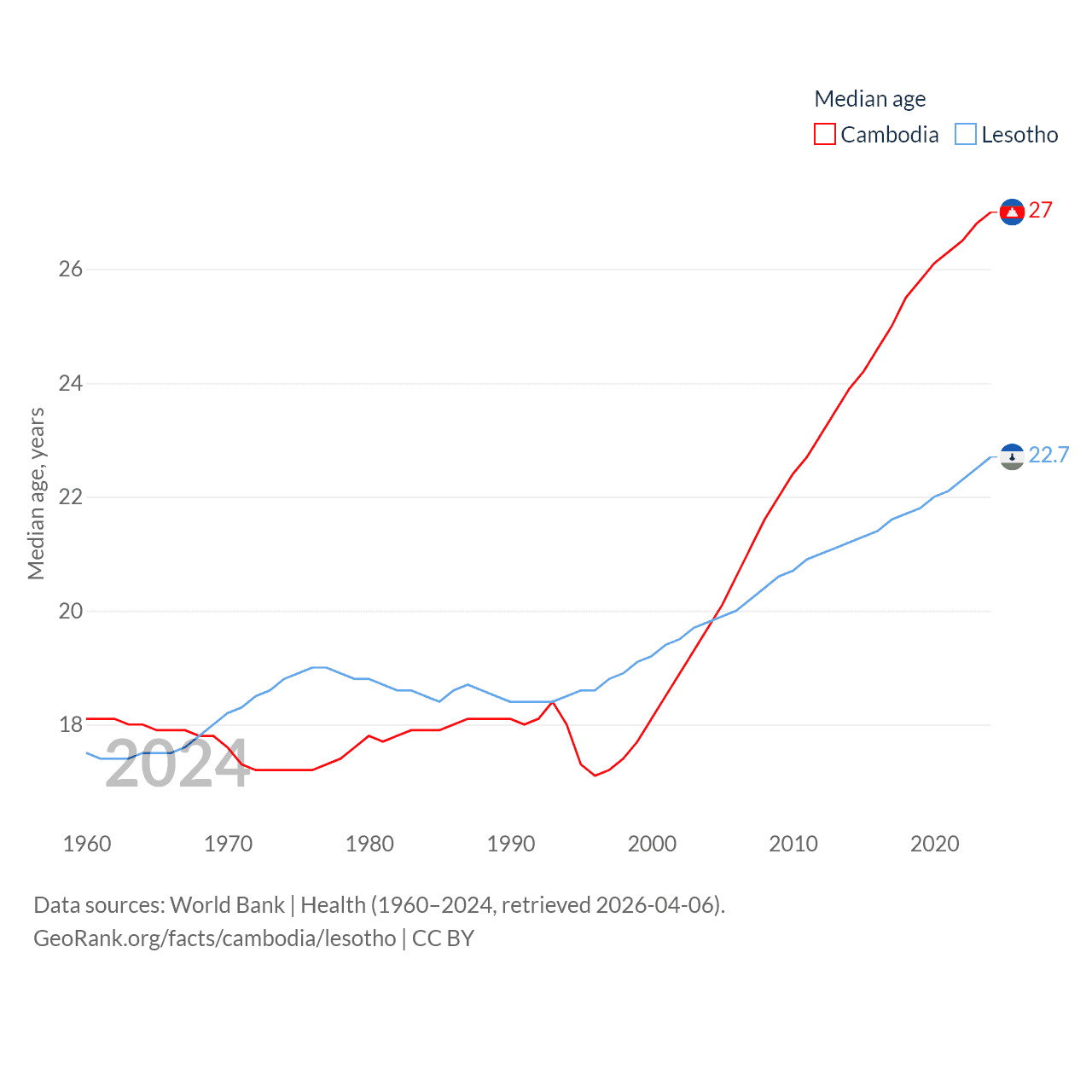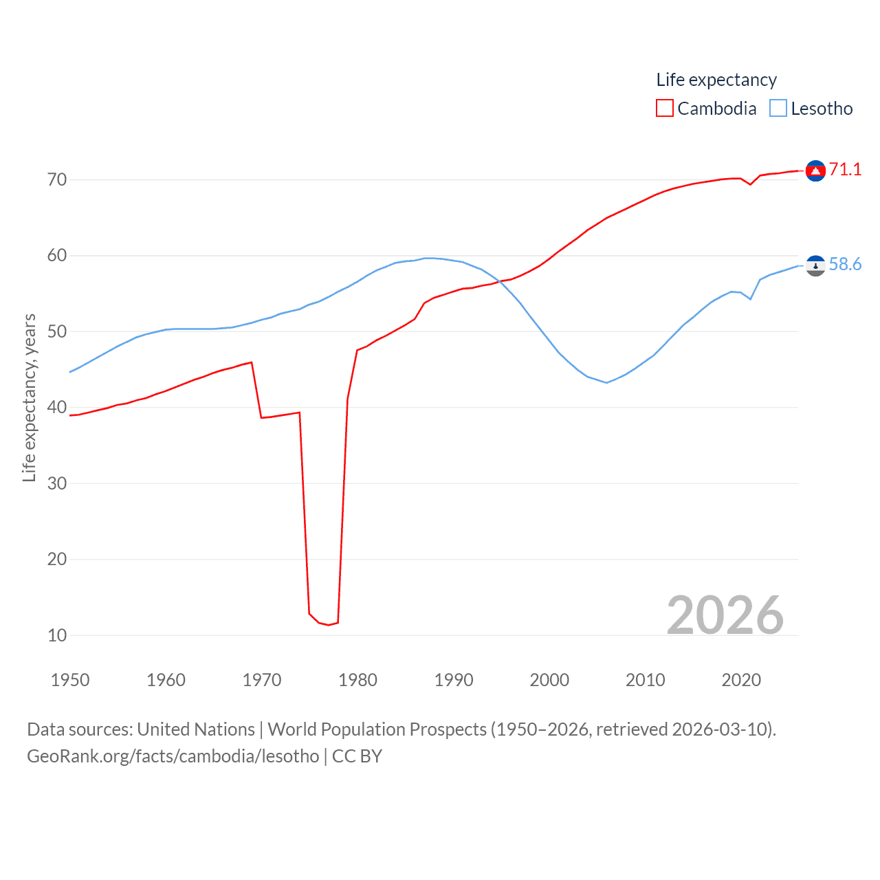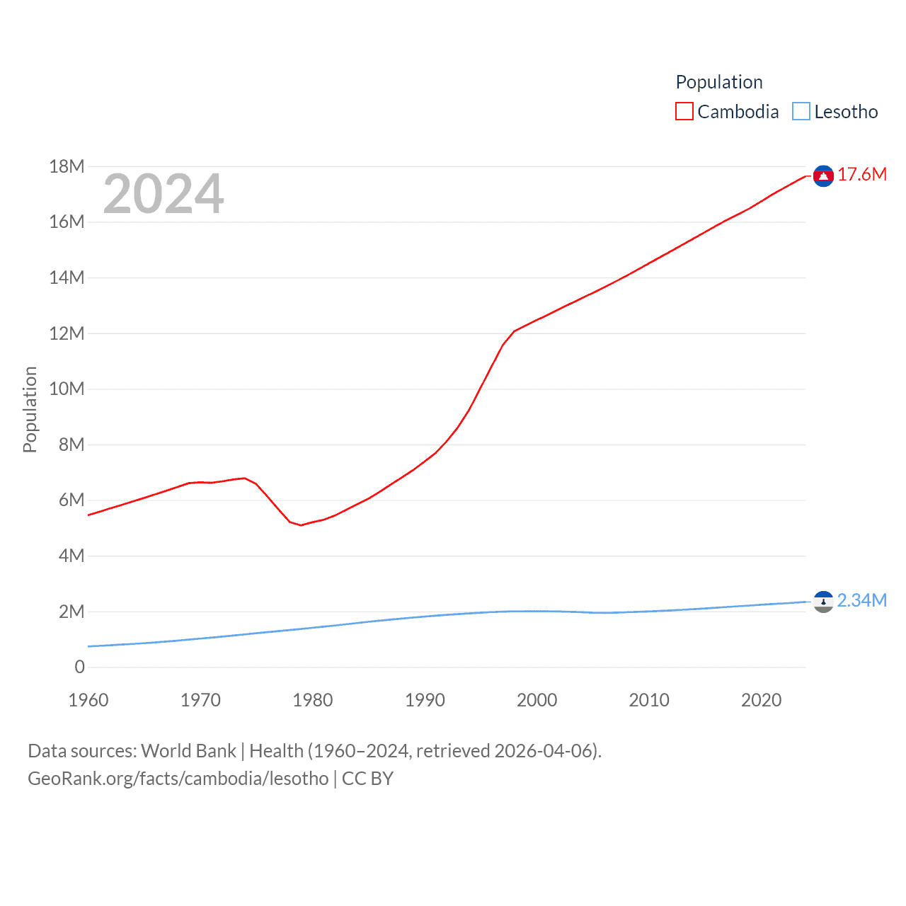 Cambodia has a population of 17.6M (ranked 73/197), compared with 2.34M in Lesotho (ranked 145/197). Cambodia's land area is 68,155 sq mi versus 11,722 sq mi for Lesotho (ranked 88th vs. 137th).