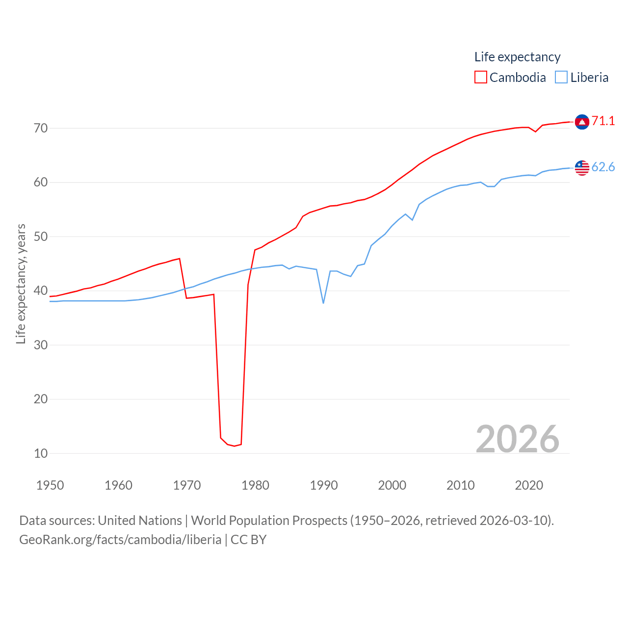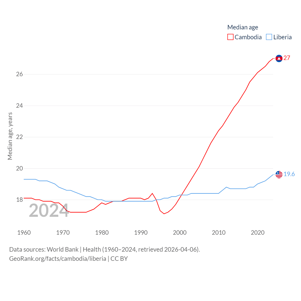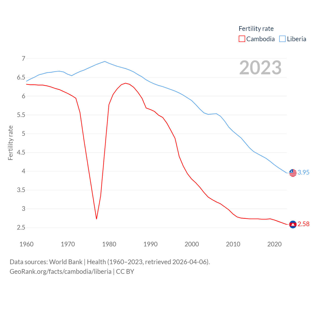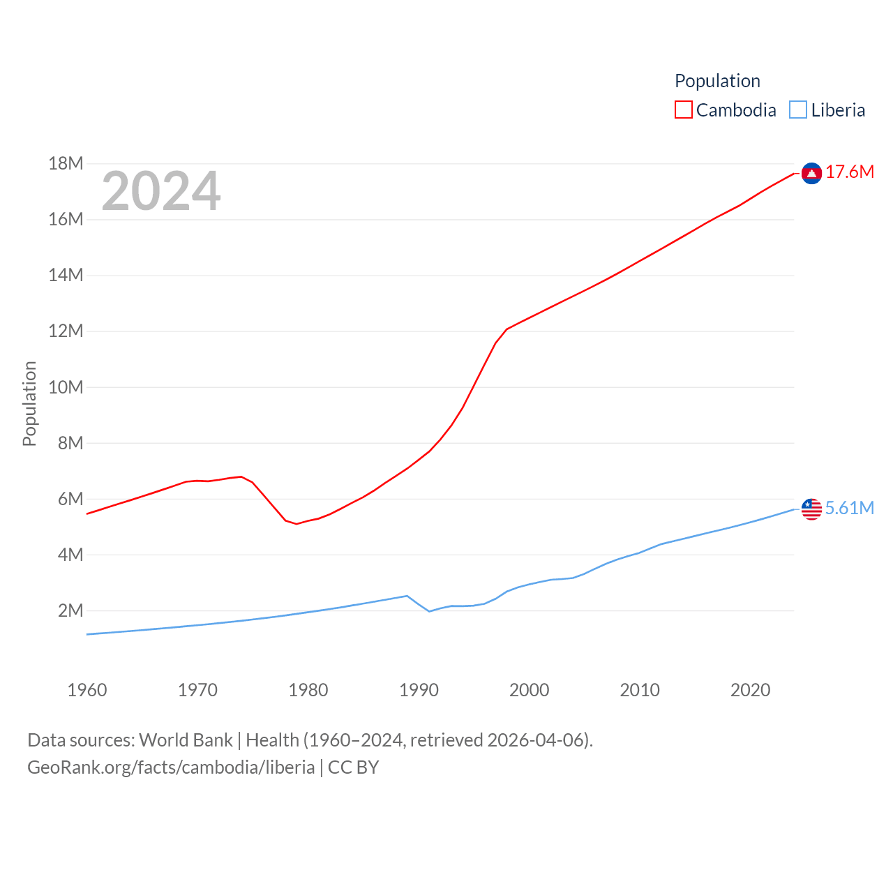 Cambodia has a population of 17.6M (ranked 73/197), compared with 5.61M in Liberia (ranked 117/197). Cambodia's land area is 68,155 sq mi versus 37,189 sq mi for Liberia (ranked 88th vs. 106th).
