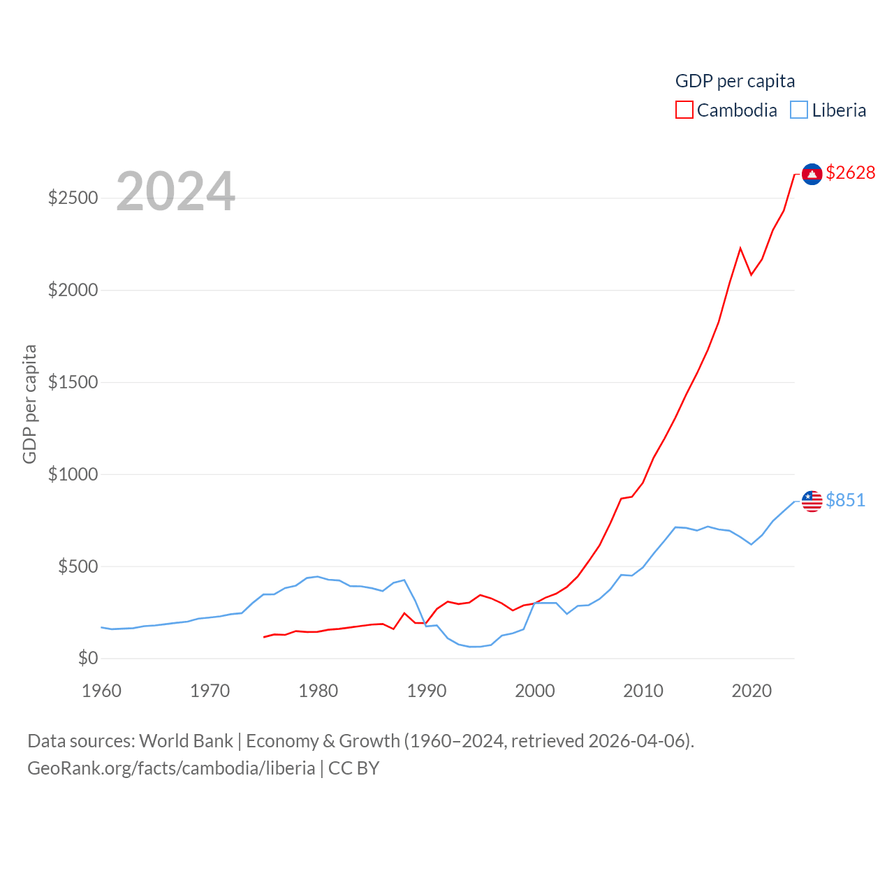 By GDP, Cambodia ranks 97/197 ($46.4B) and Liberia ranks 163/197 ($4.78B). By GDP per capita, Cambodia ranks 145/197 ($2,628), while Liberia ranks 184/197 ($851).