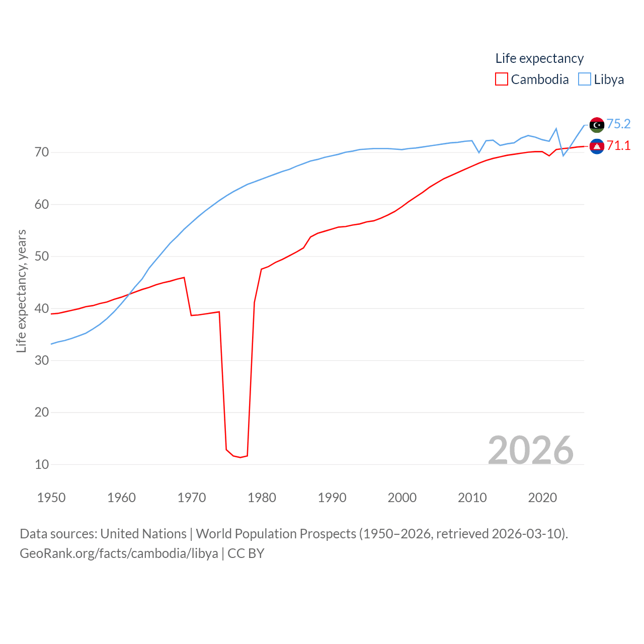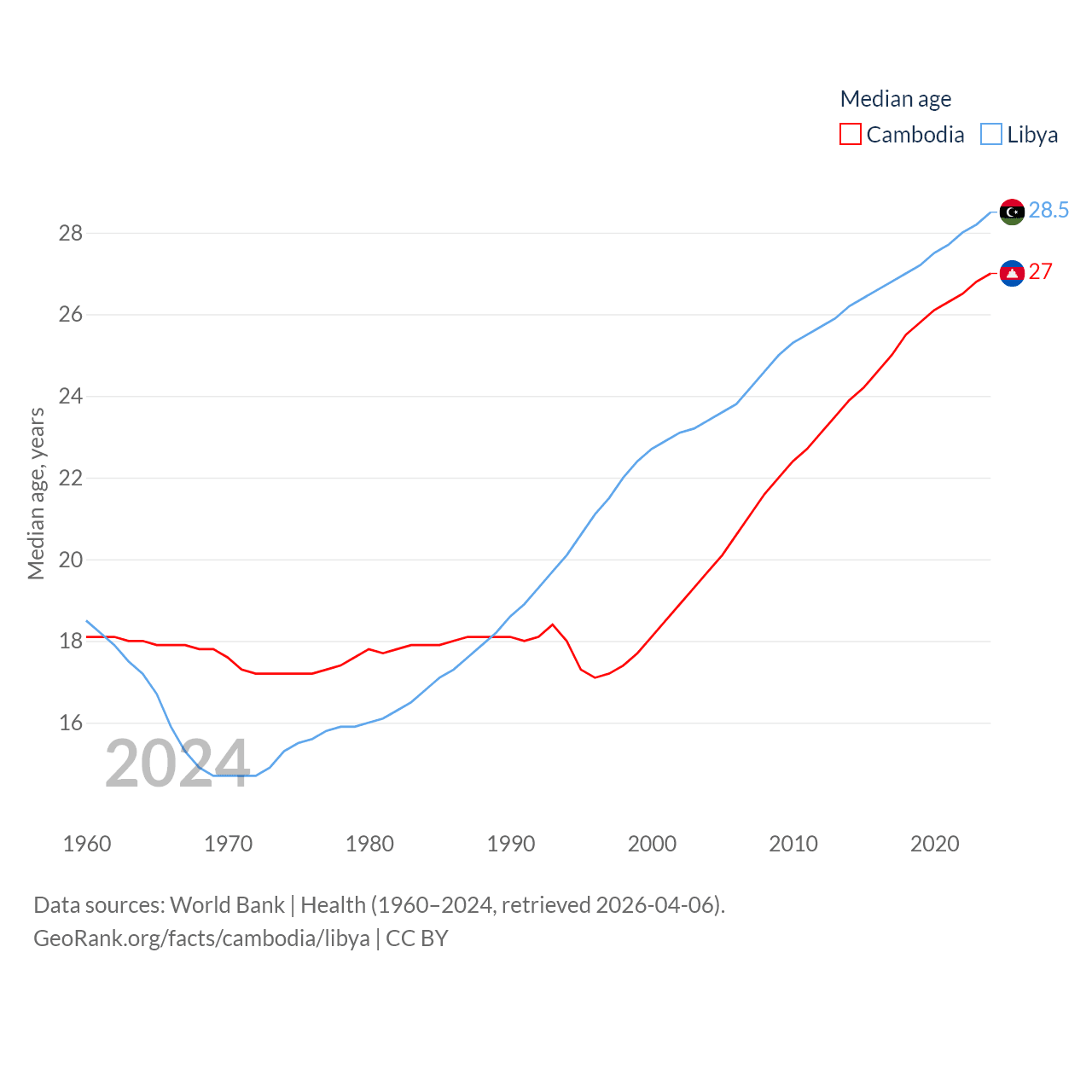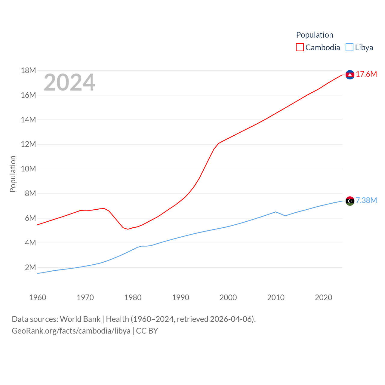 Cambodia has a population of 17.6M (ranked 73/197), compared with 7.38M in Libya (ranked 105/197). Cambodia's land area is 68,155 sq mi versus 679,362 sq mi for Libya (ranked 88th vs. 16th).