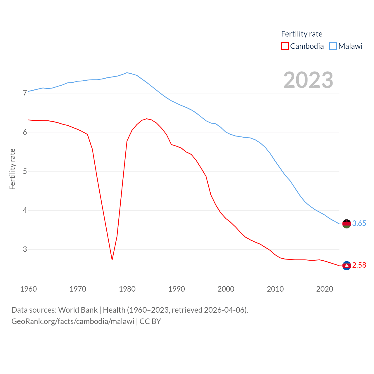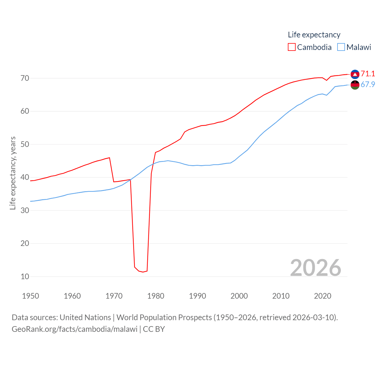 Cambodia has a population of 17.6M (ranked 73/197), compared with 21.7M in Malawi (ranked 62/197). Cambodia's land area is 68,155 sq mi versus 36,402 sq mi for Malawi (ranked 88th vs. 107th).