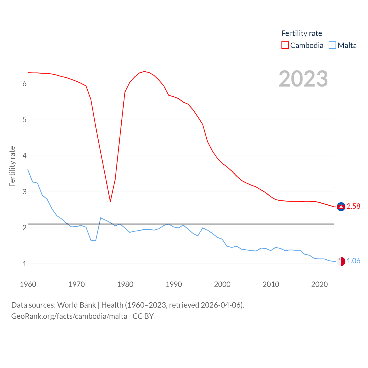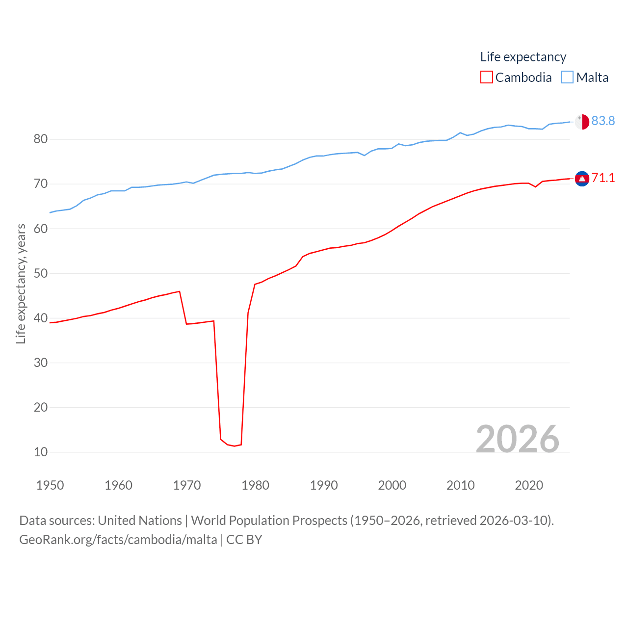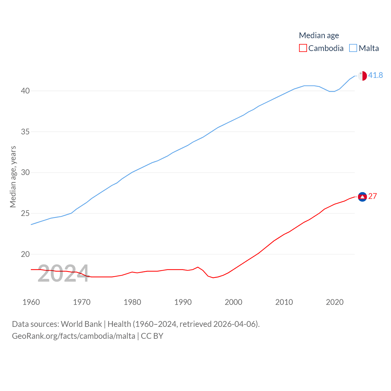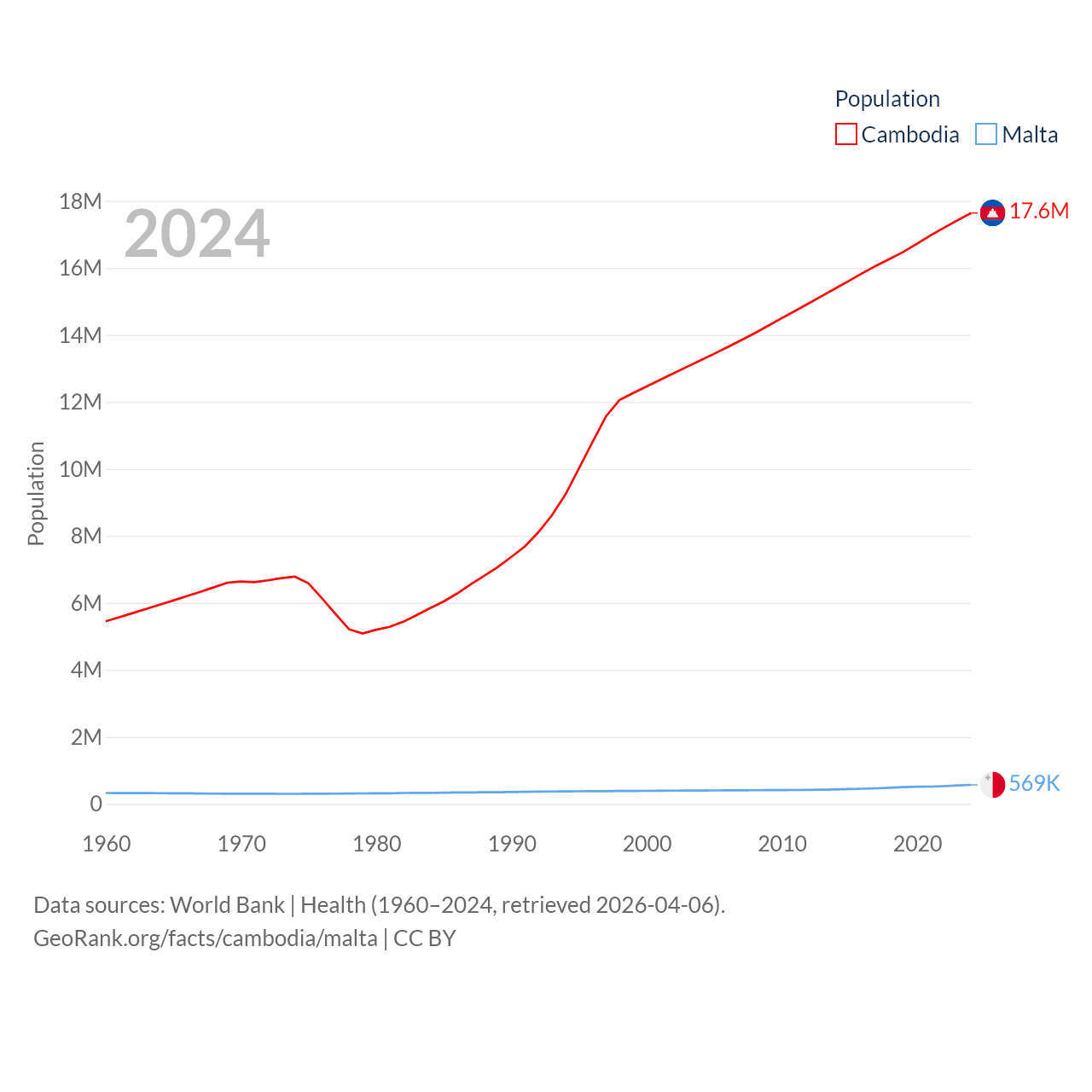 Cambodia has a population of 17.6M (ranked 73/197), compared with 569K in Malta (ranked 167/197). Cambodia's land area is 68,155 sq mi versus 123.6 sq mi for Malta (ranked 88th vs. 187th).