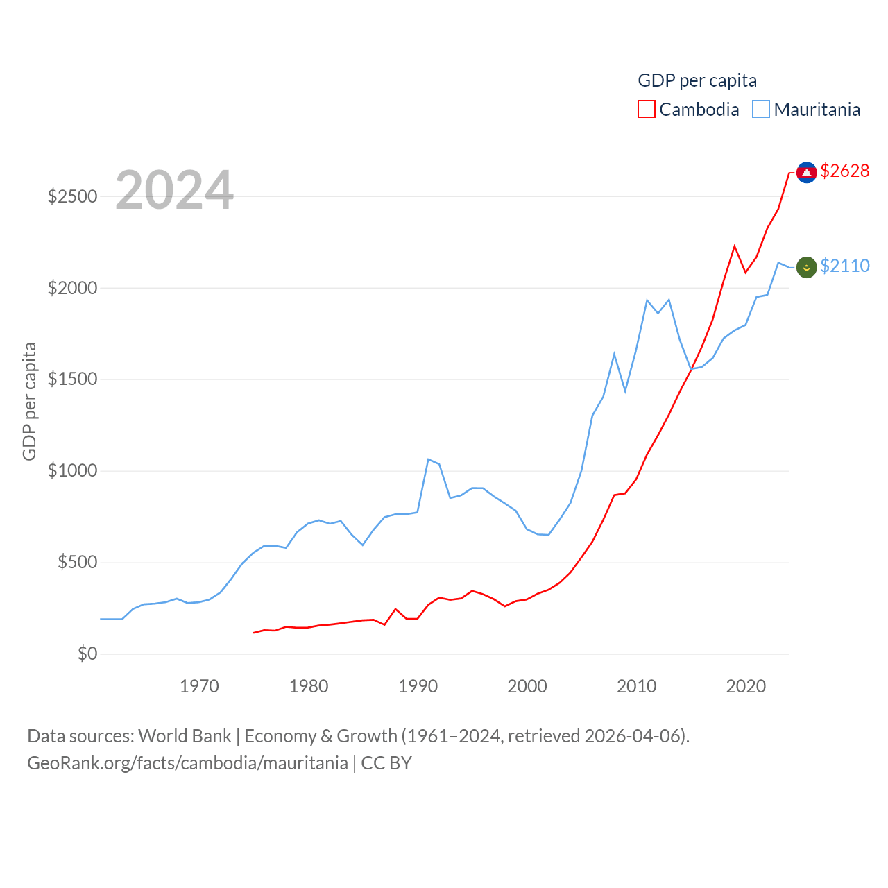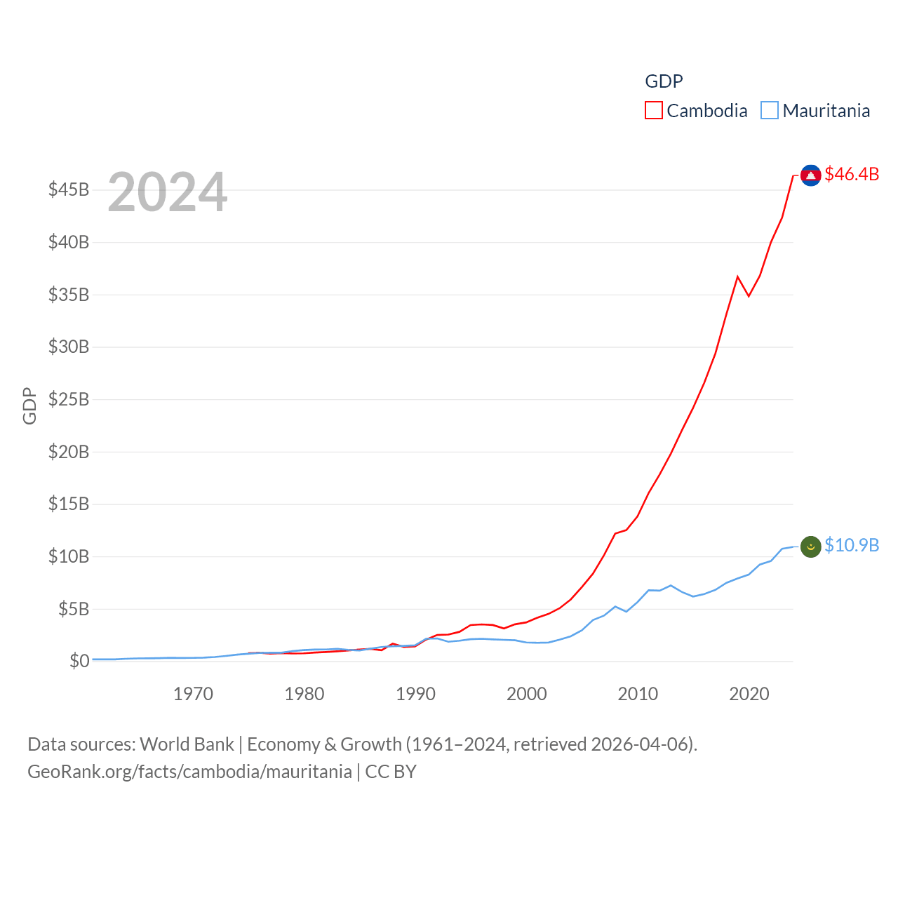 By GDP, Cambodia ranks 97/197 ($46.4B) and Mauritania ranks 153/197 ($10.9B). By GDP per capita, Cambodia ranks 145/197 ($2,628), while Mauritania ranks 156/197 ($2,110).