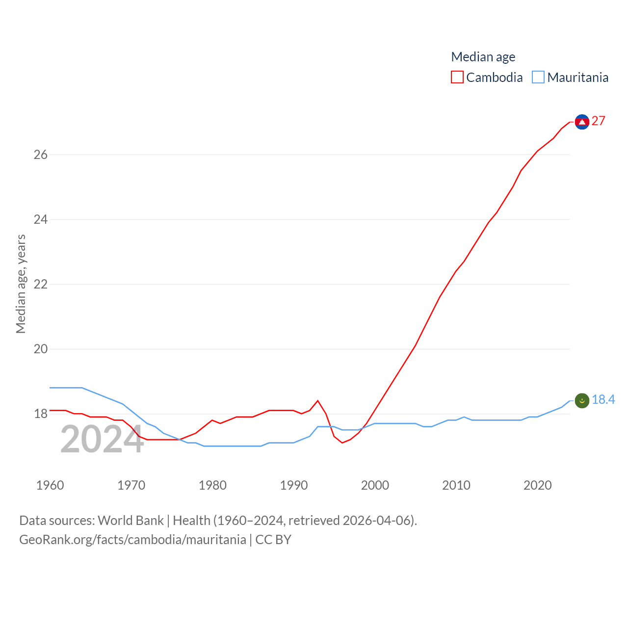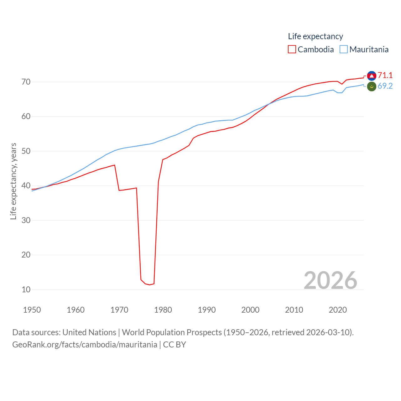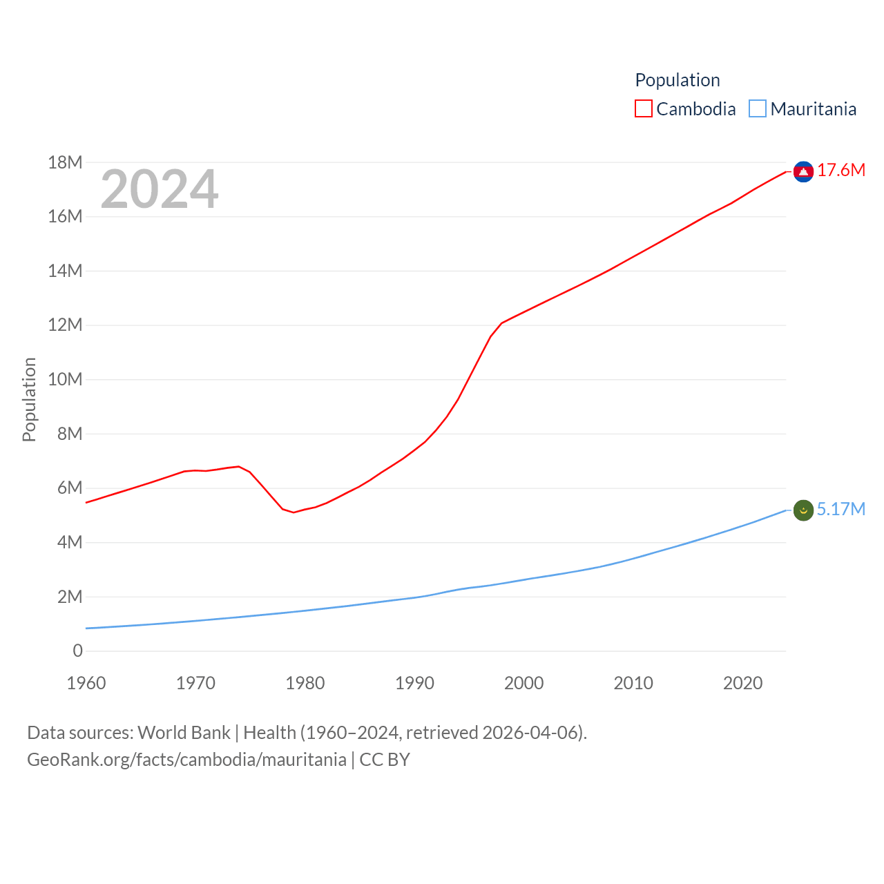 Cambodia has a population of 17.6M (ranked 73/197), compared with 5.17M in Mauritania (ranked 125/197). Cambodia's land area is 68,155 sq mi versus 397,955 sq mi for Mauritania (ranked 88th vs. 28th).