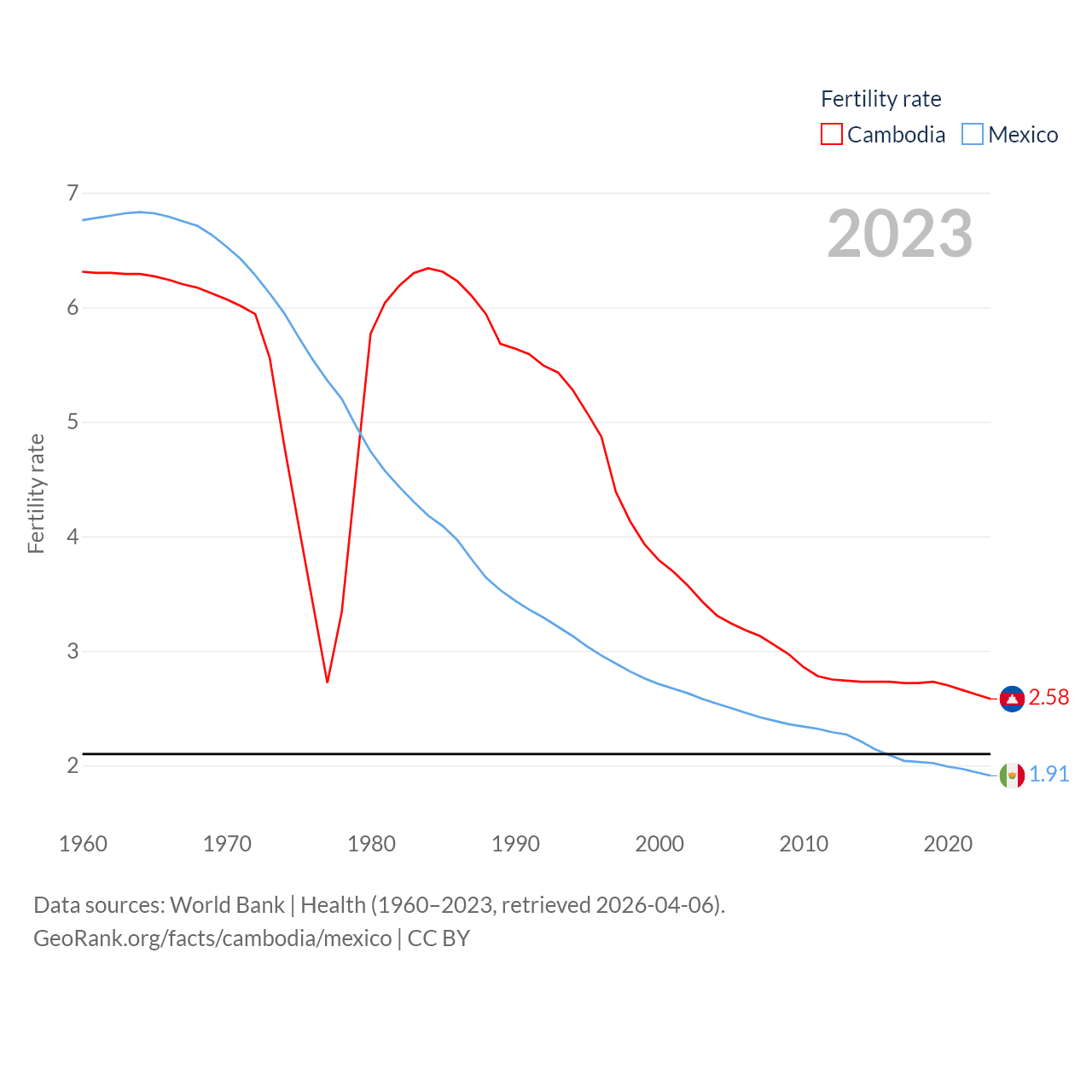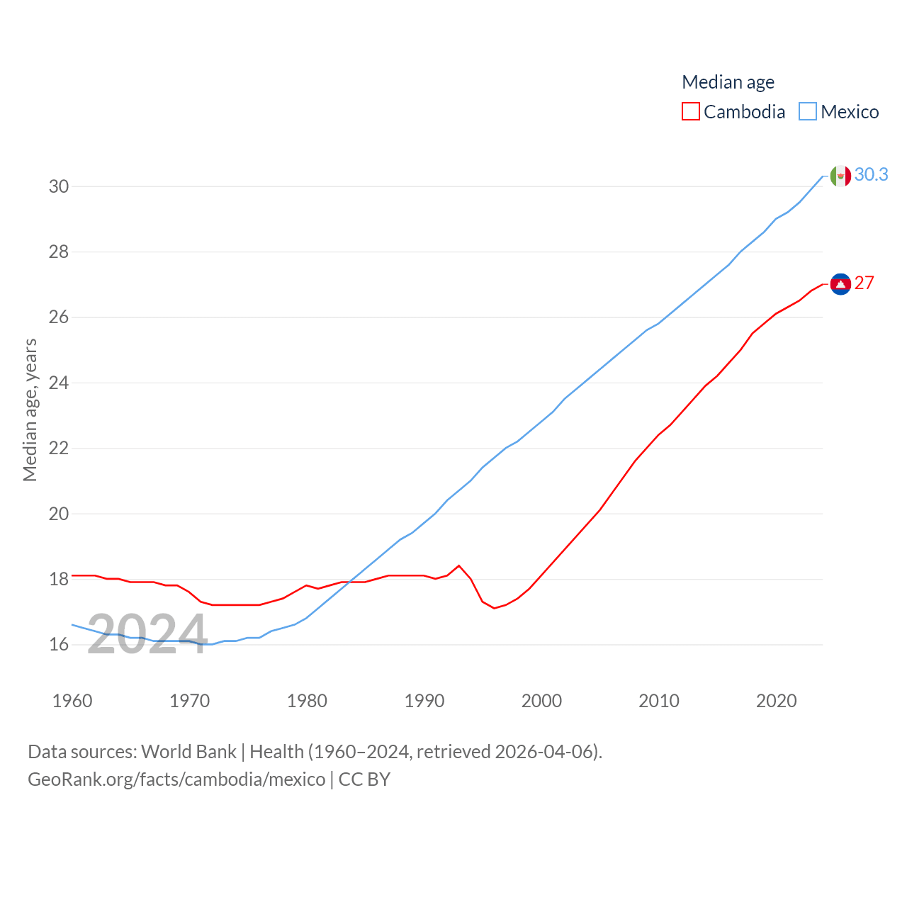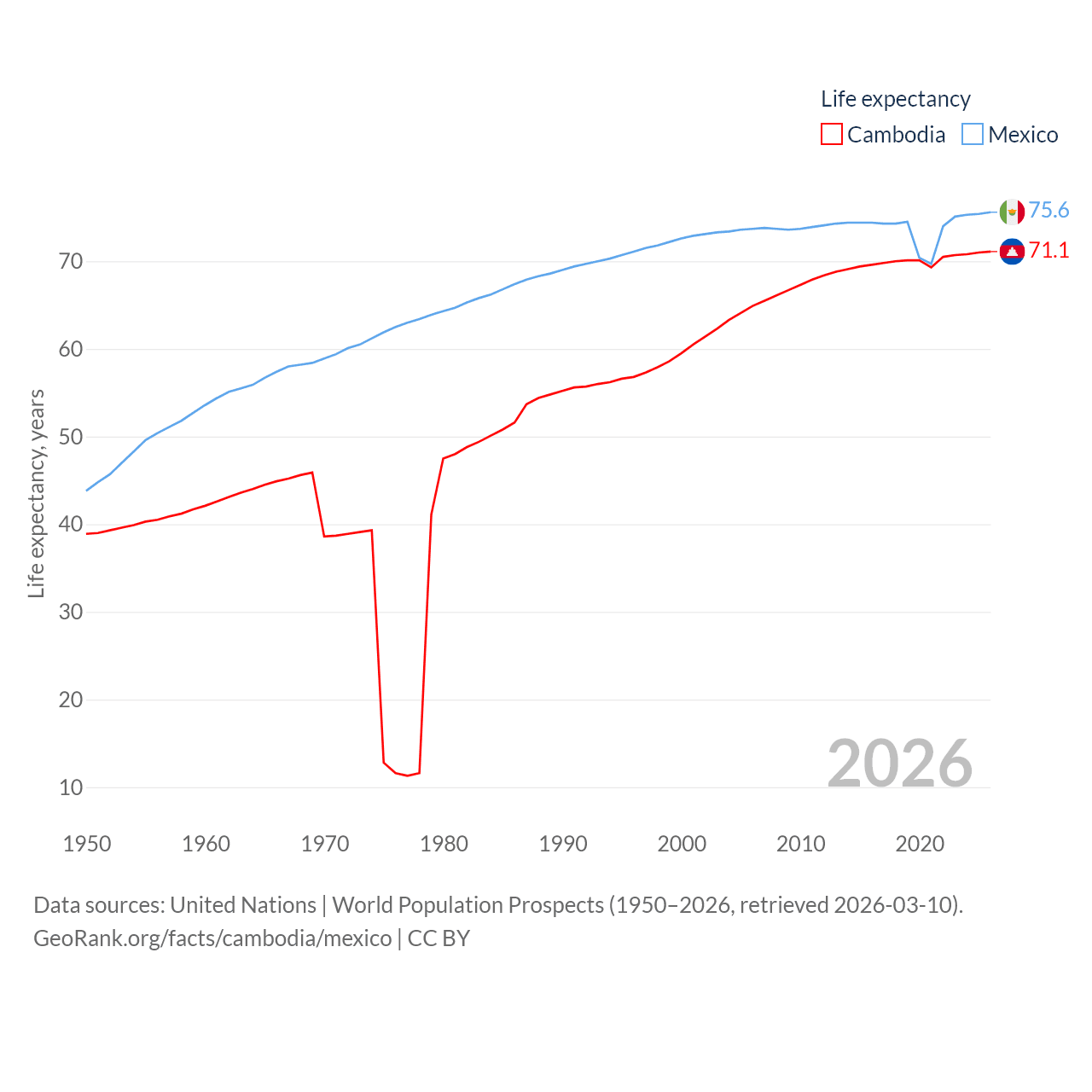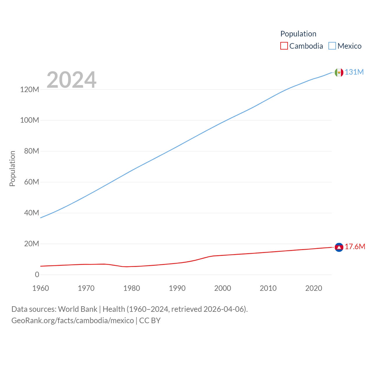 Cambodia has a population of 17.6M (ranked 73/197), compared with 131M in Mexico (ranked 11/197). Cambodia's land area is 68,155 sq mi versus 750,563 sq mi for Mexico (ranked 88th vs. 13th).