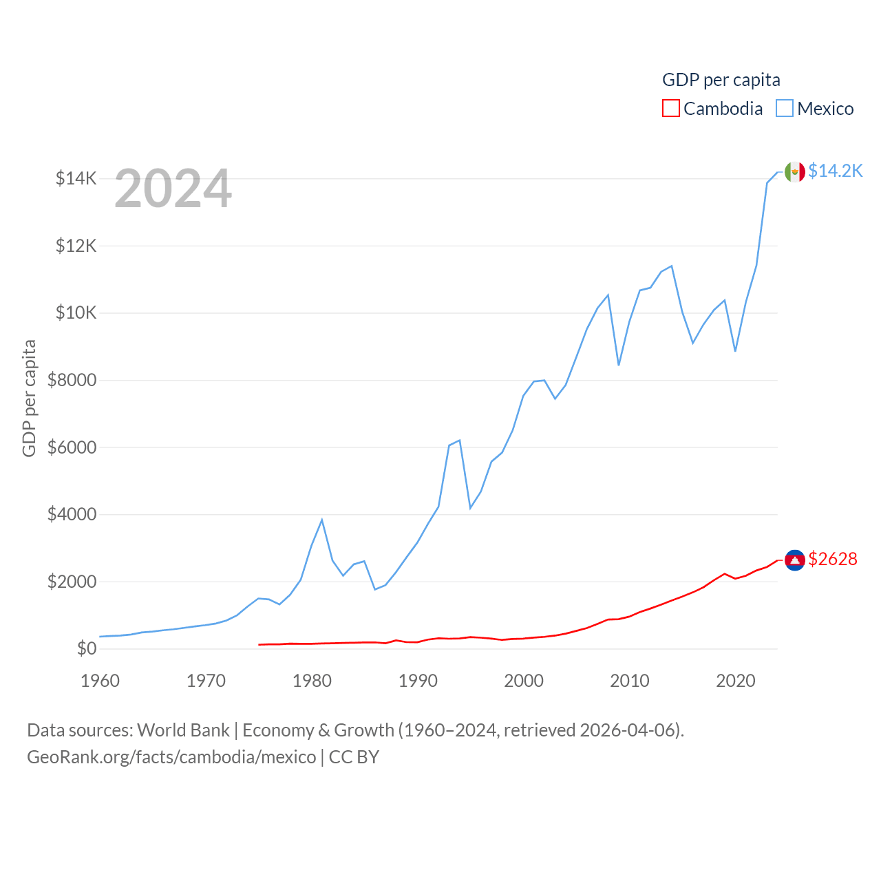 By GDP, Cambodia ranks 97/197 ($46.4B) and Mexico ranks 13/197 ($1.86T). By GDP per capita, Cambodia ranks 145/197 ($2,628), while Mexico ranks 69/197 ($14,186).