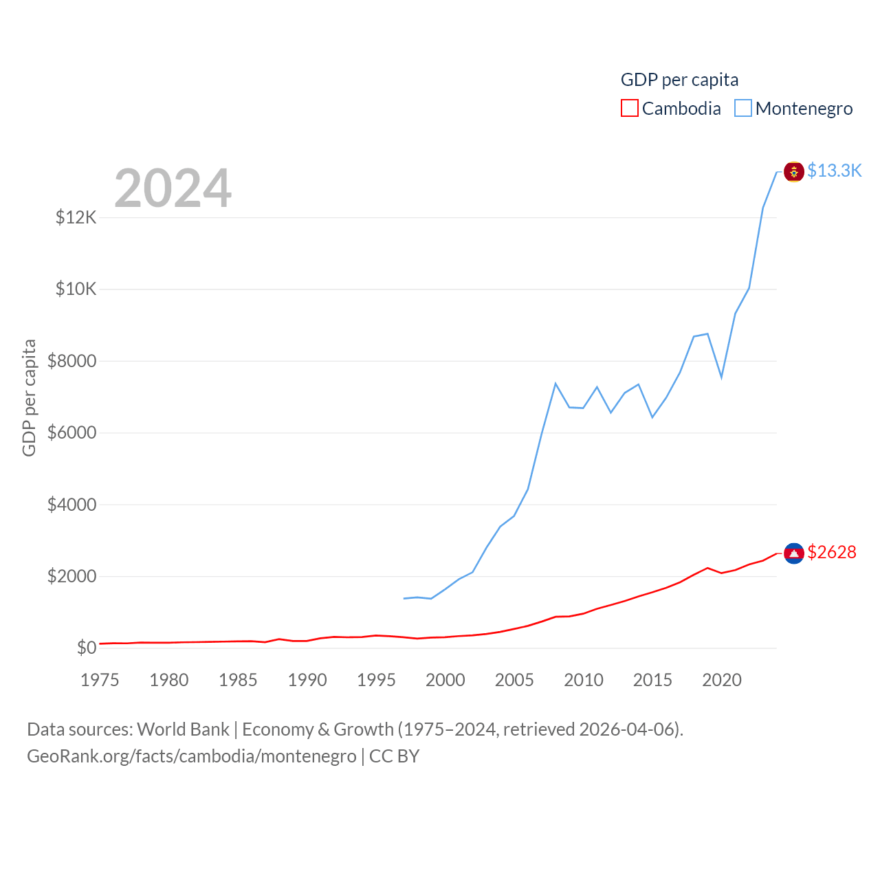 By GDP, Cambodia ranks 97/197 ($46.4B) and Montenegro ranks 155/197 ($8.27B). By GDP per capita, Cambodia ranks 145/197 ($2,628), while Montenegro ranks 77/197 ($13,263).