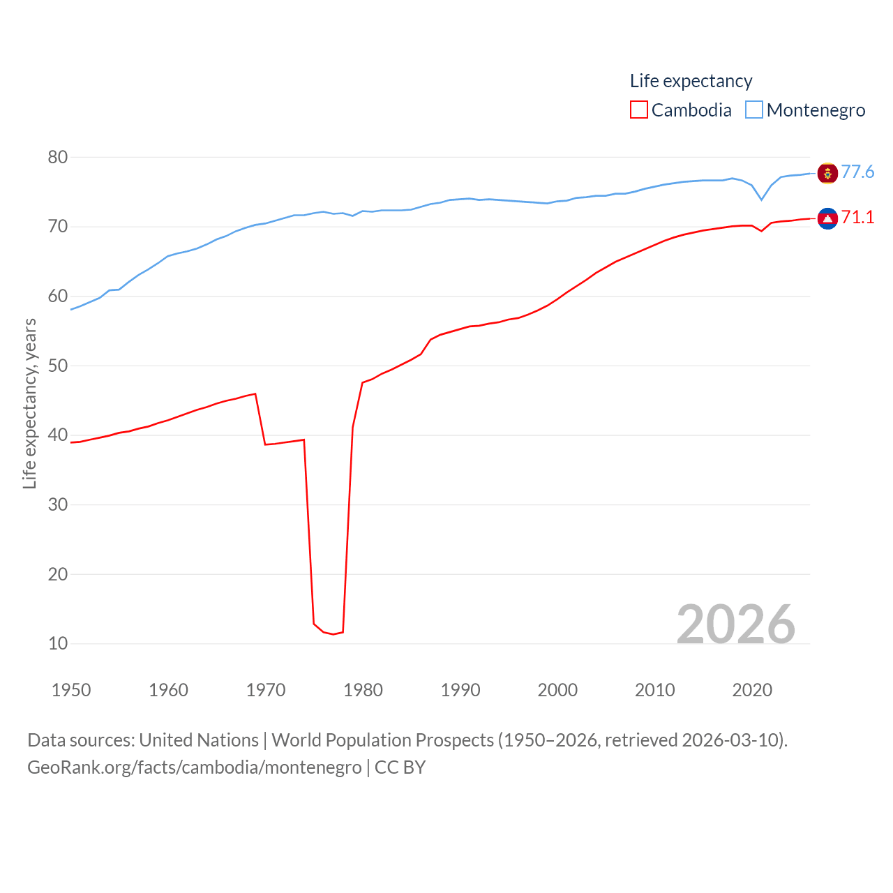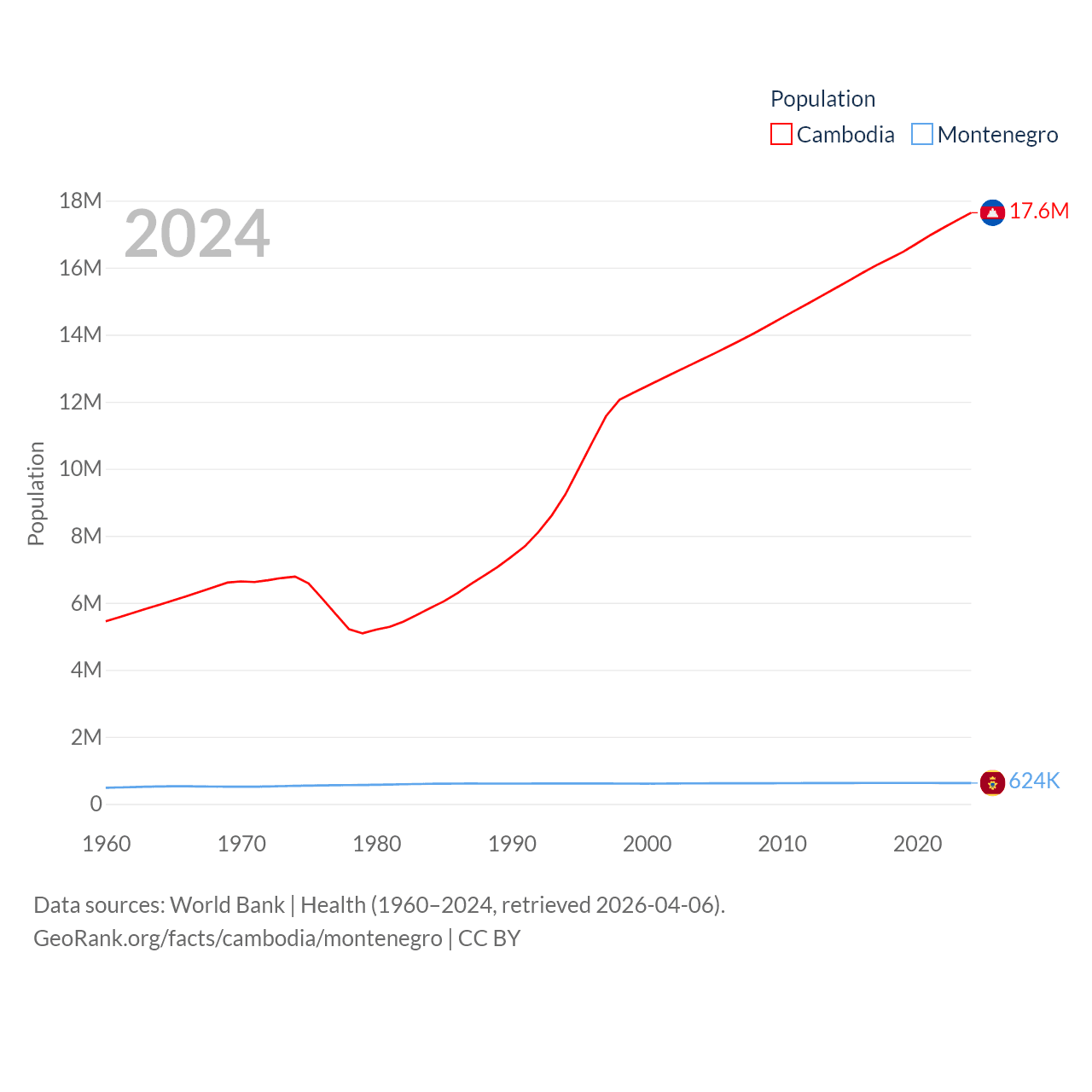 Cambodia has a population of 17.6M (ranked 73/197), compared with 624K in Montenegro (ranked 166/197). Cambodia's land area is 68,155 sq mi versus 5,193 sq mi for Montenegro (ranked 88th vs. 156th).