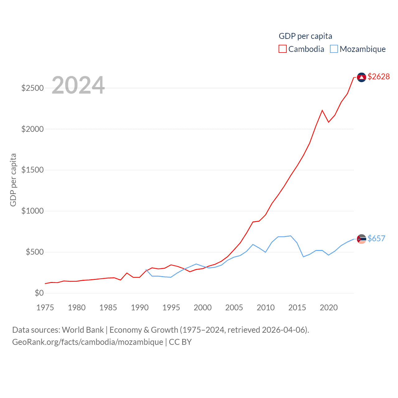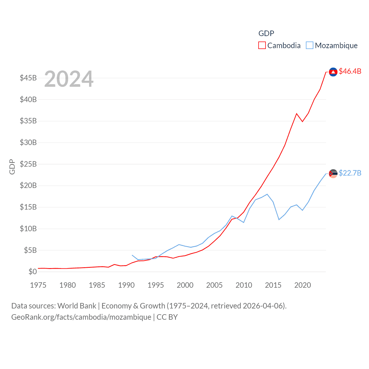 By GDP, Cambodia ranks 97/197 ($46.4B) and Mozambique ranks 123/197 ($22.7B). By GDP per capita, Cambodia ranks 145/197 ($2,628), while Mozambique ranks 189/197 ($657).