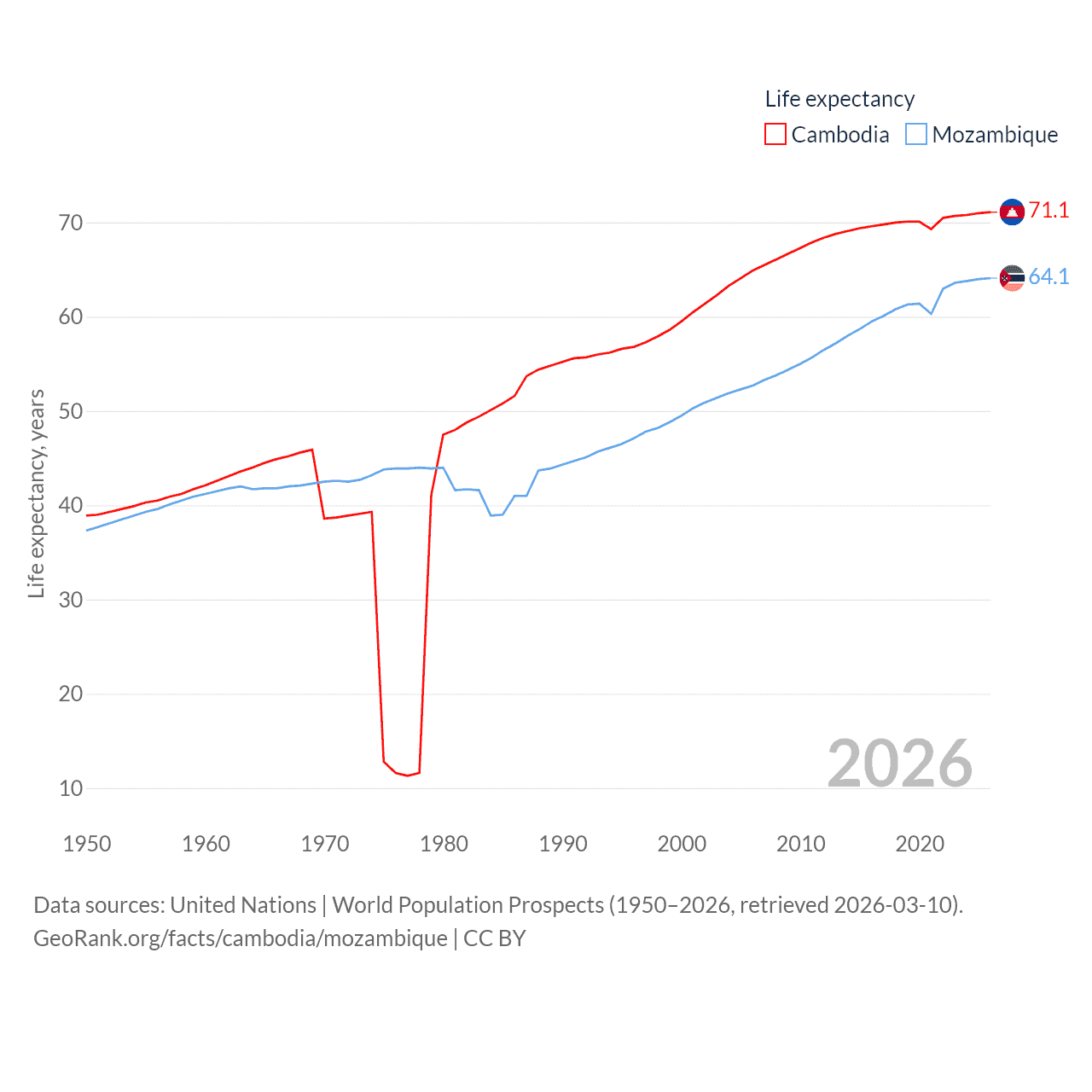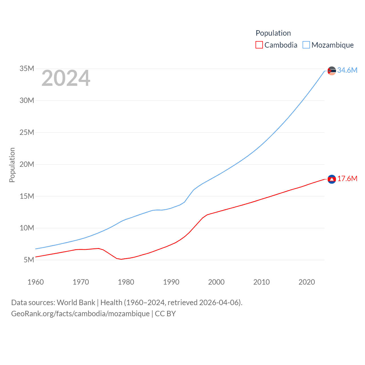 Cambodia has a population of 17.6M (ranked 73/197), compared with 34.6M in Mozambique (ranked 46/197). Cambodia's land area is 68,155 sq mi versus 303,623 sq mi for Mozambique (ranked 88th vs. 34th).