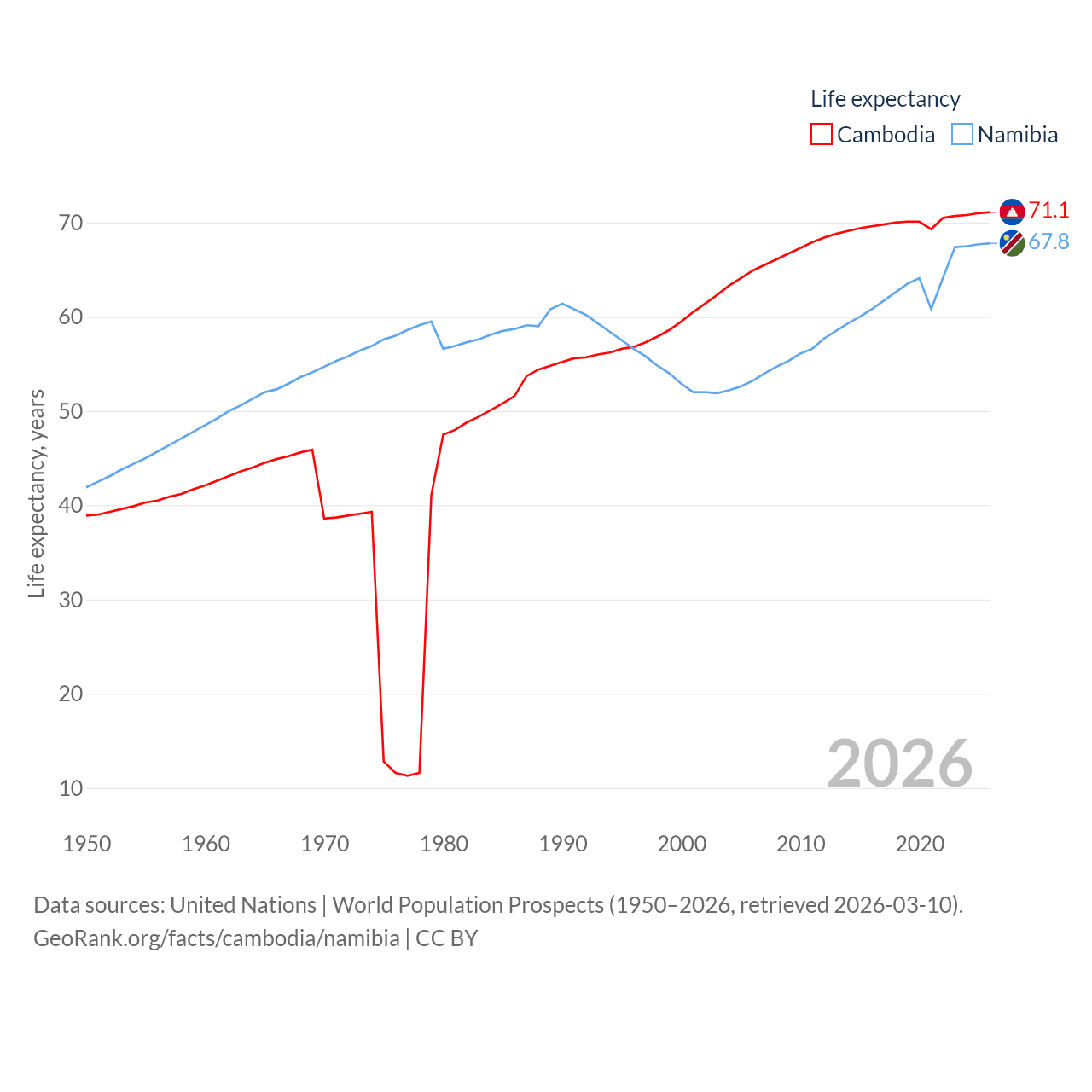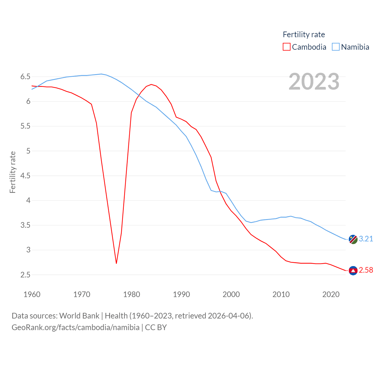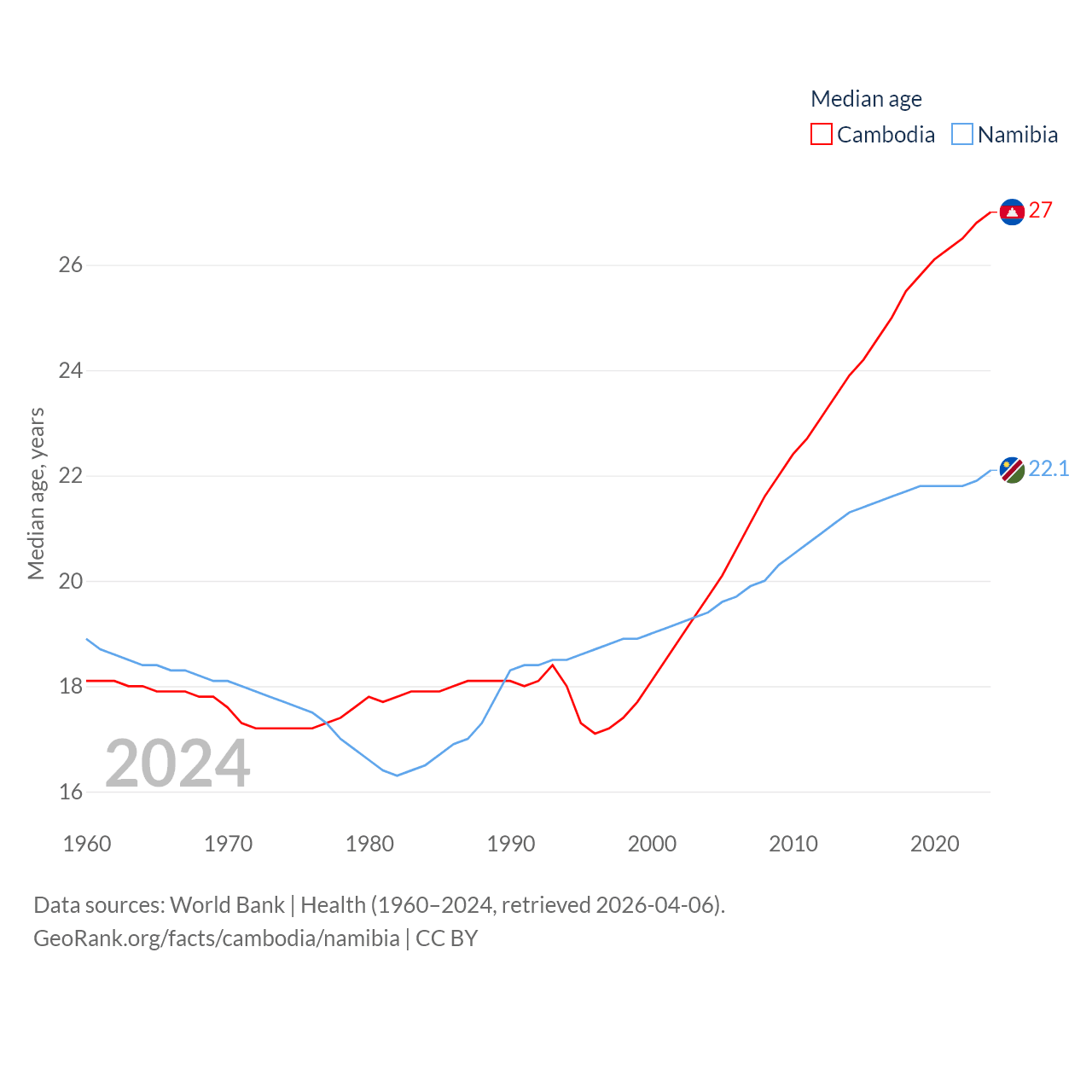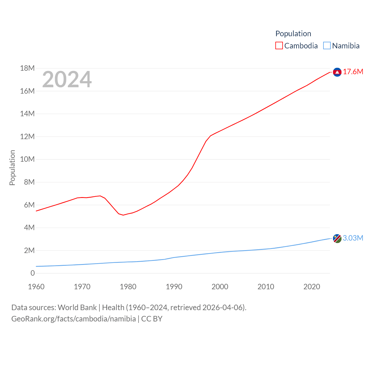 Cambodia has a population of 17.6M (ranked 73/197), compared with 3.03M in Namibia (ranked 136/197). Cambodia's land area is 68,155 sq mi versus 317,874 sq mi for Namibia (ranked 88th vs. 33rd).