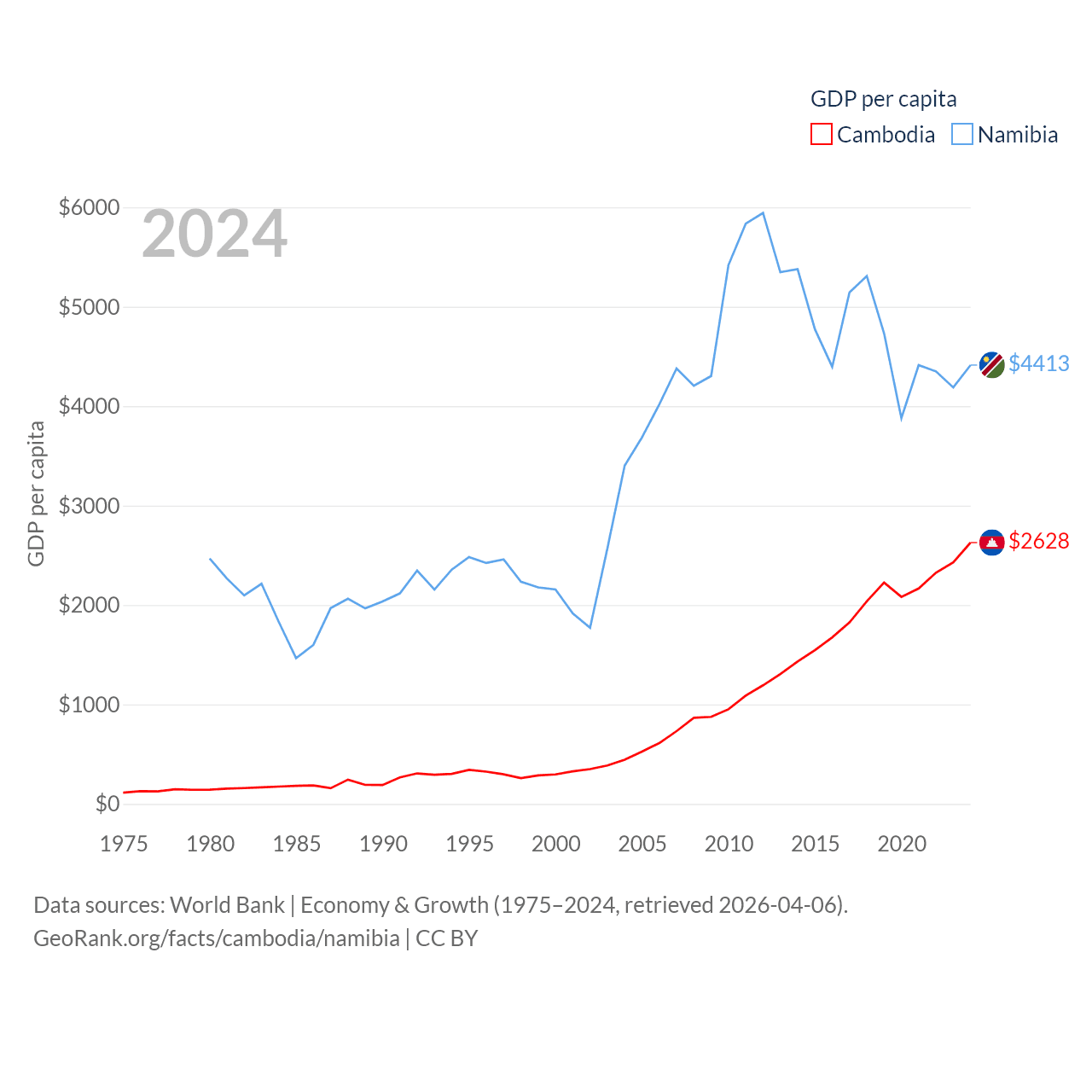 By GDP, Cambodia ranks 97/197 ($46.4B) and Namibia ranks 147/197 ($13.4B). By GDP per capita, Cambodia ranks 145/197 ($2,628), while Namibia ranks 126/197 ($4,413).
