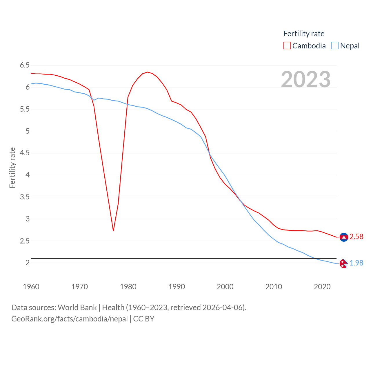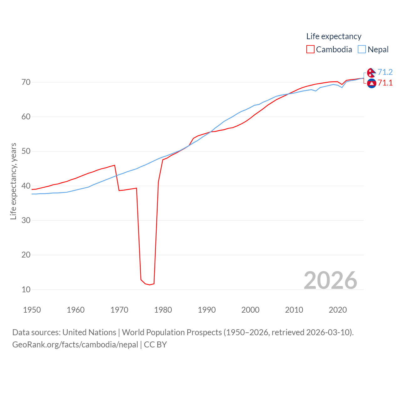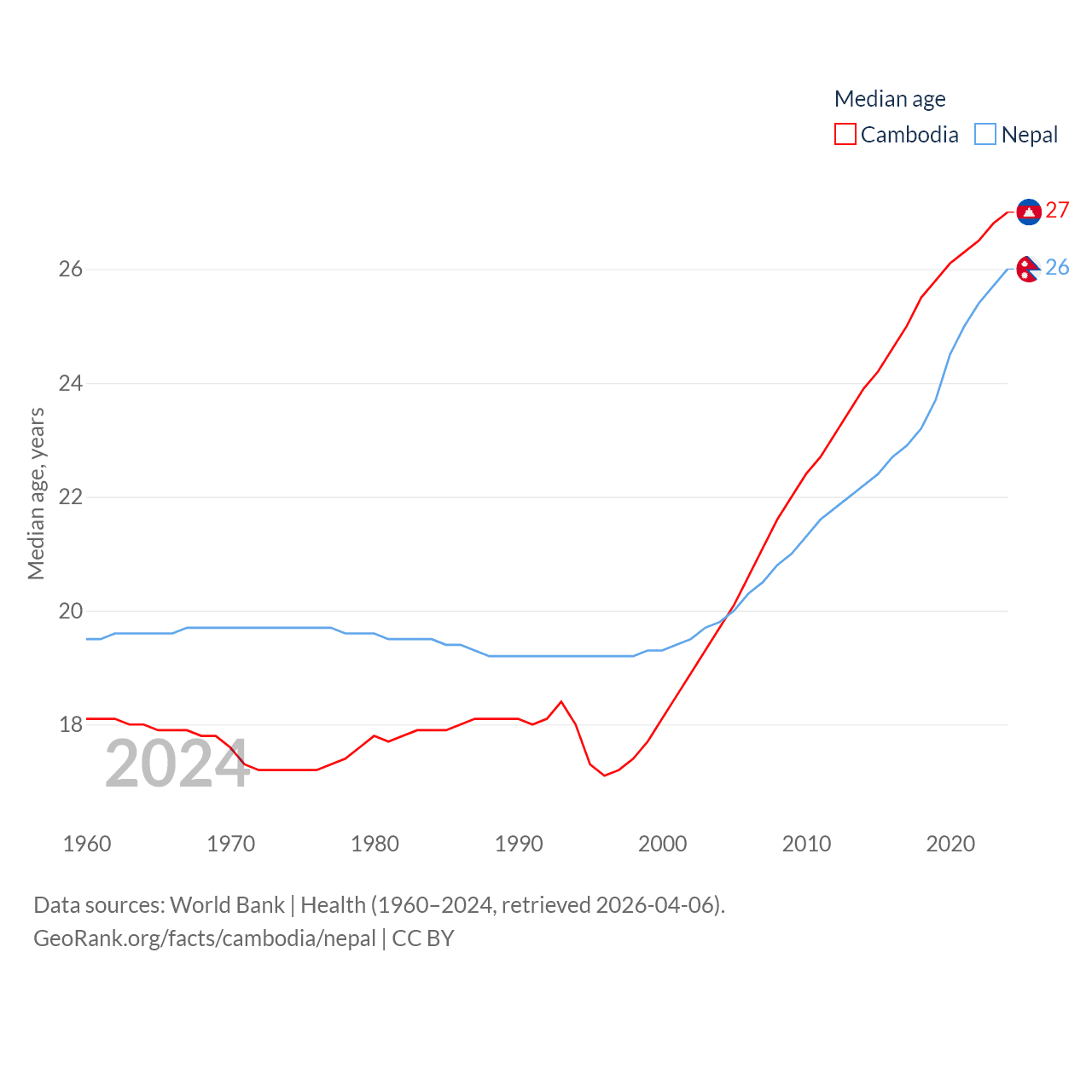 Cambodia has a population of 17.6M (ranked 73/197), compared with 29.7M in Nepal (ranked 51/197). Cambodia's land area is 68,155 sq mi versus 55,348 sq mi for Nepal (ranked 88th vs. 92nd).