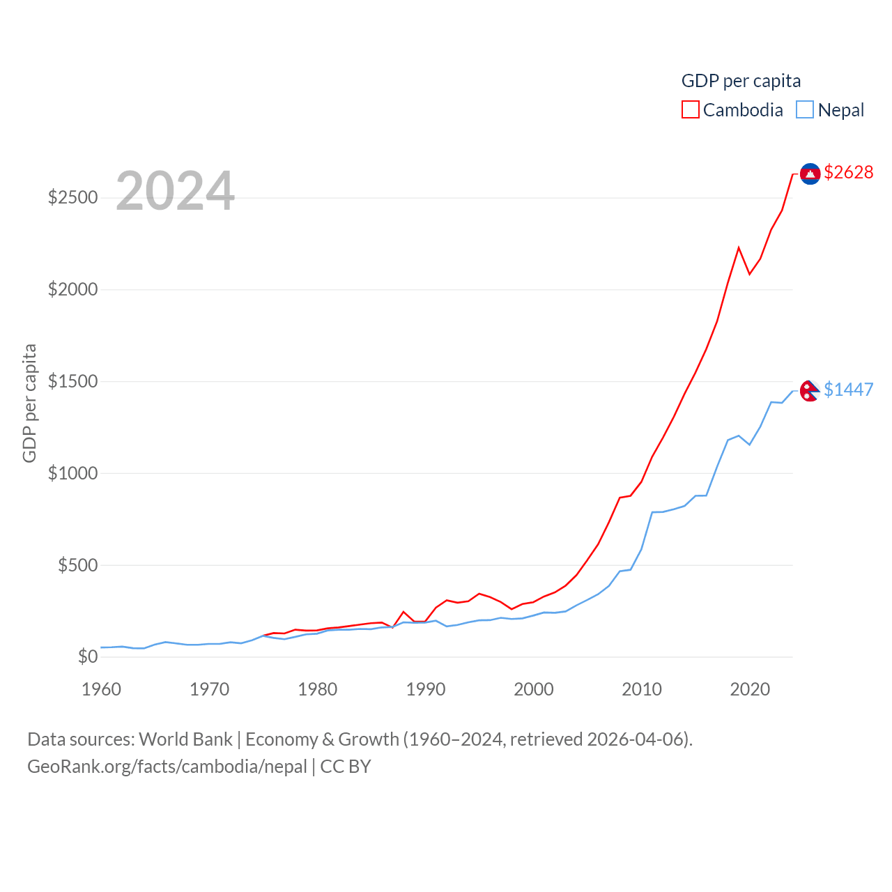 By GDP, Cambodia ranks 97/197 ($46.4B) and Nepal ranks 101/197 ($42.9B). By GDP per capita, Cambodia ranks 145/197 ($2,628), while Nepal ranks 164/197 ($1,447).