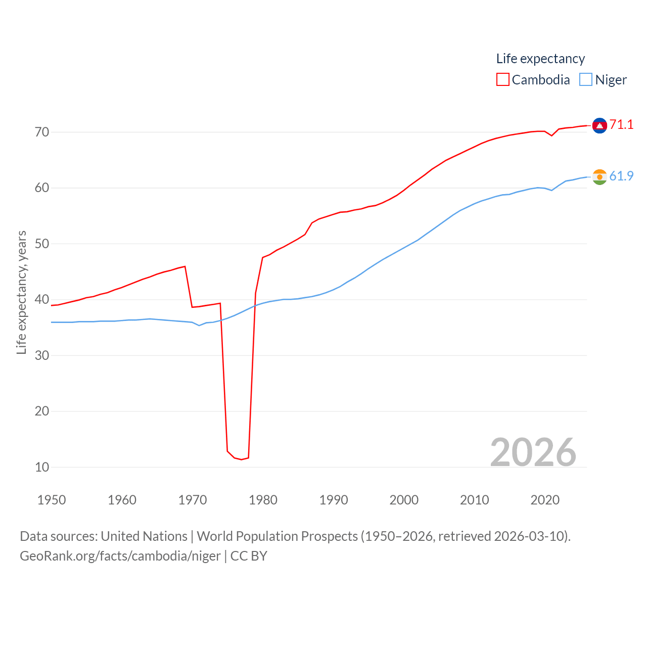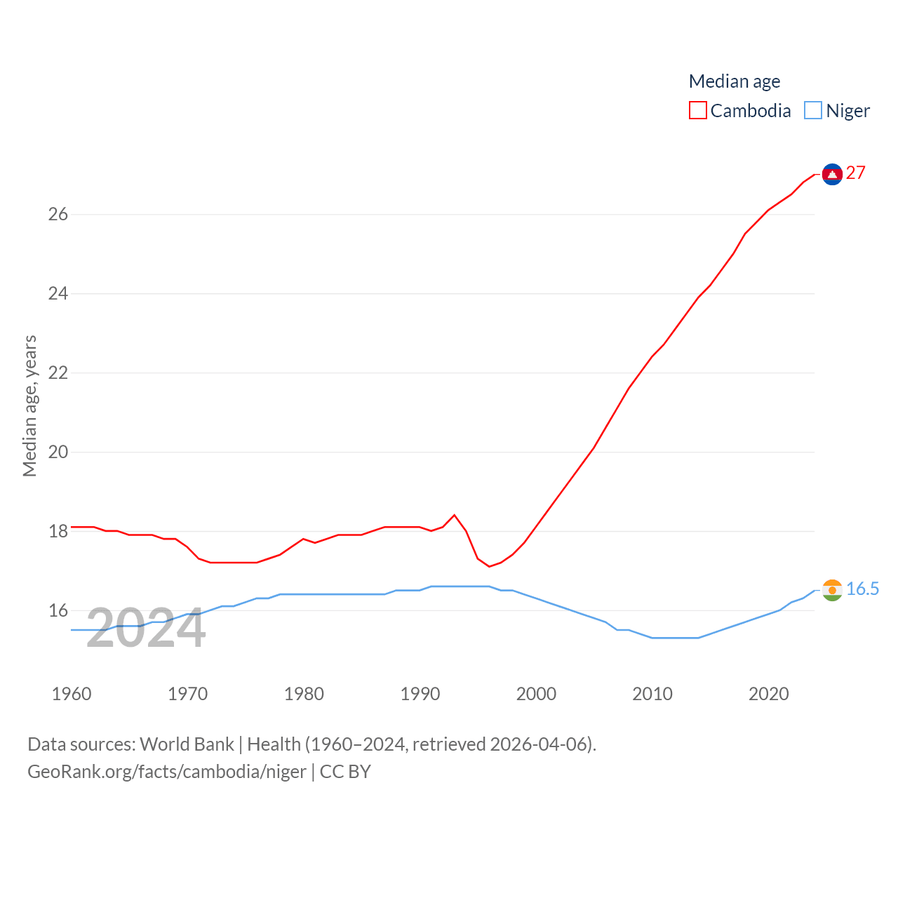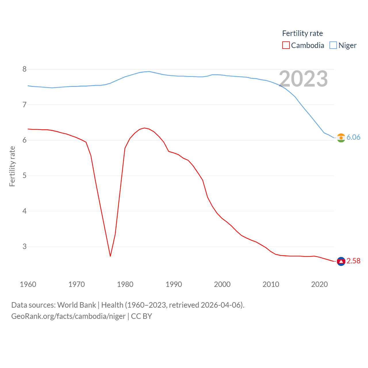 Cambodia has a population of 17.6M (ranked 73/197), compared with 27M in Niger (ranked 55/197). Cambodia's land area is 68,155 sq mi versus 489,076 sq mi for Niger (ranked 88th vs. 20th).