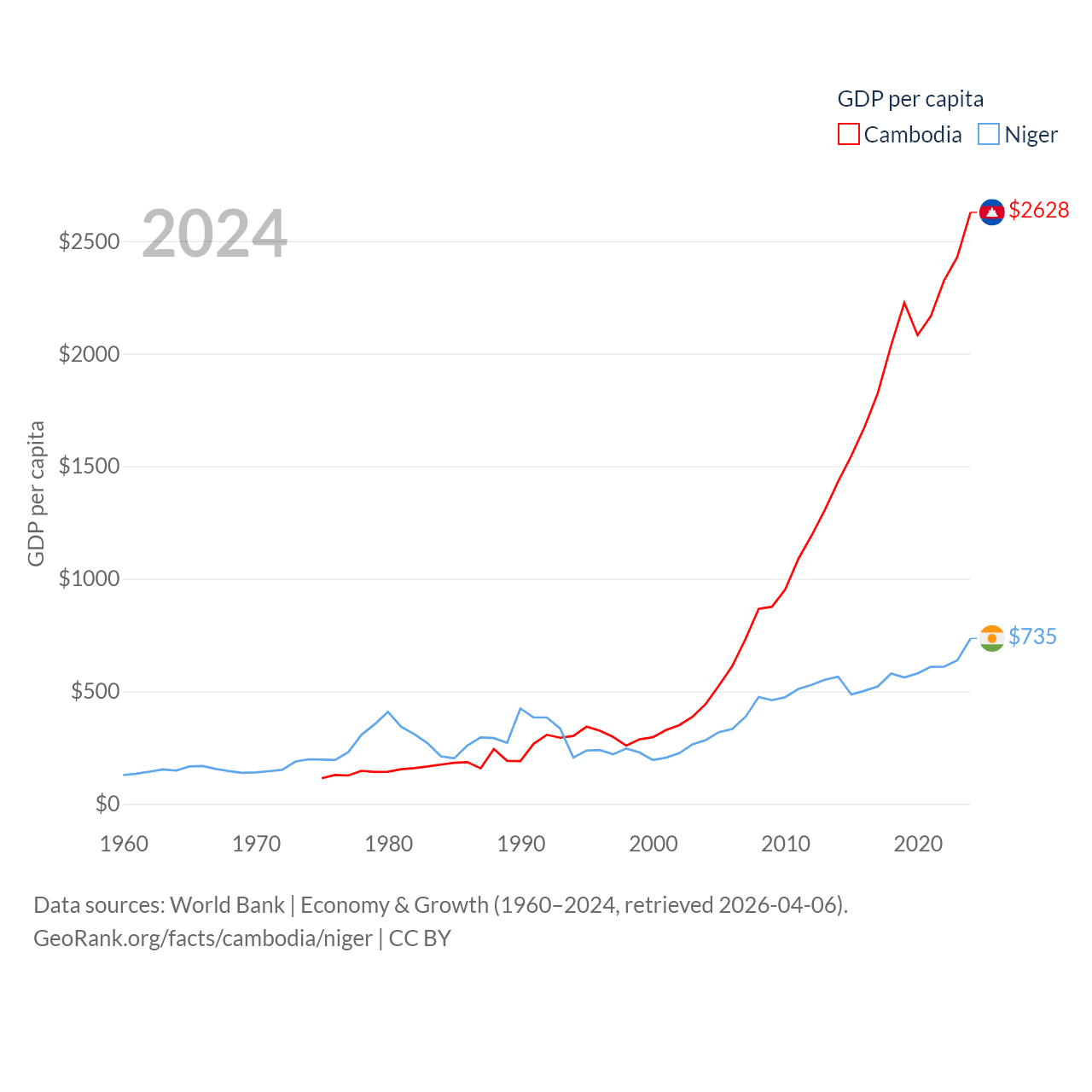 By GDP, Cambodia ranks 97/197 ($46.4B) and Niger ranks 130/197 ($19.9B). By GDP per capita, Cambodia ranks 145/197 ($2,628), while Niger ranks 187/197 ($735).
